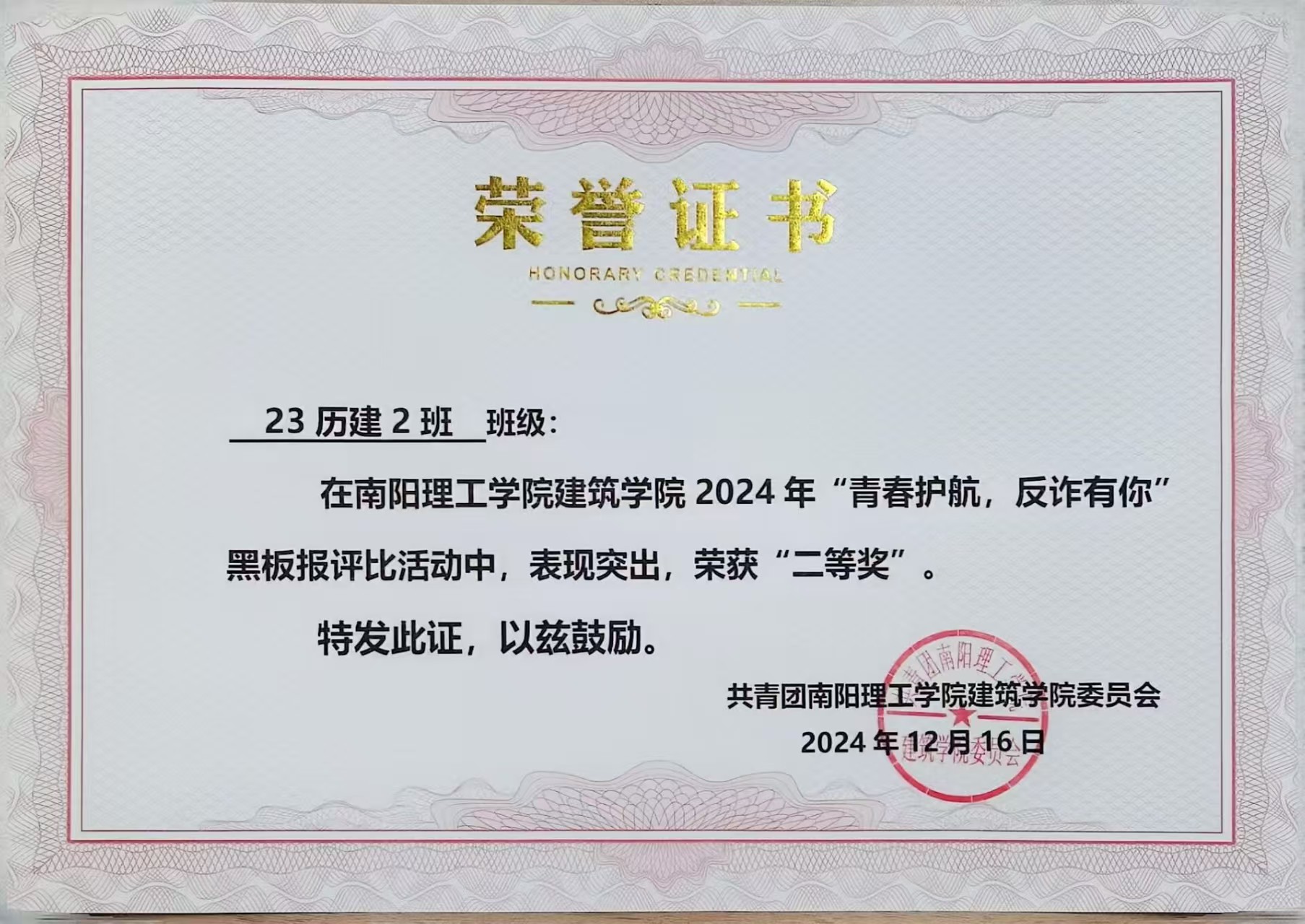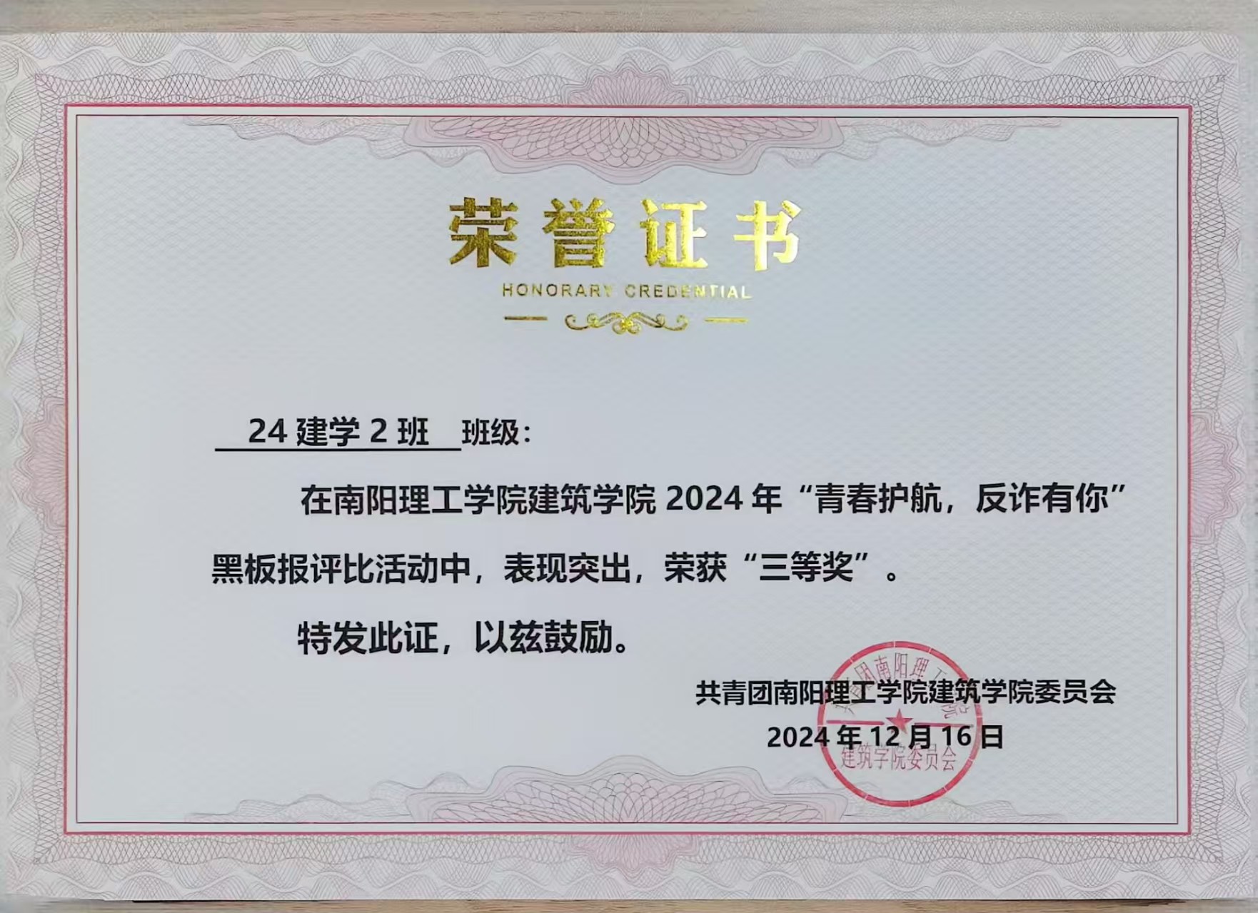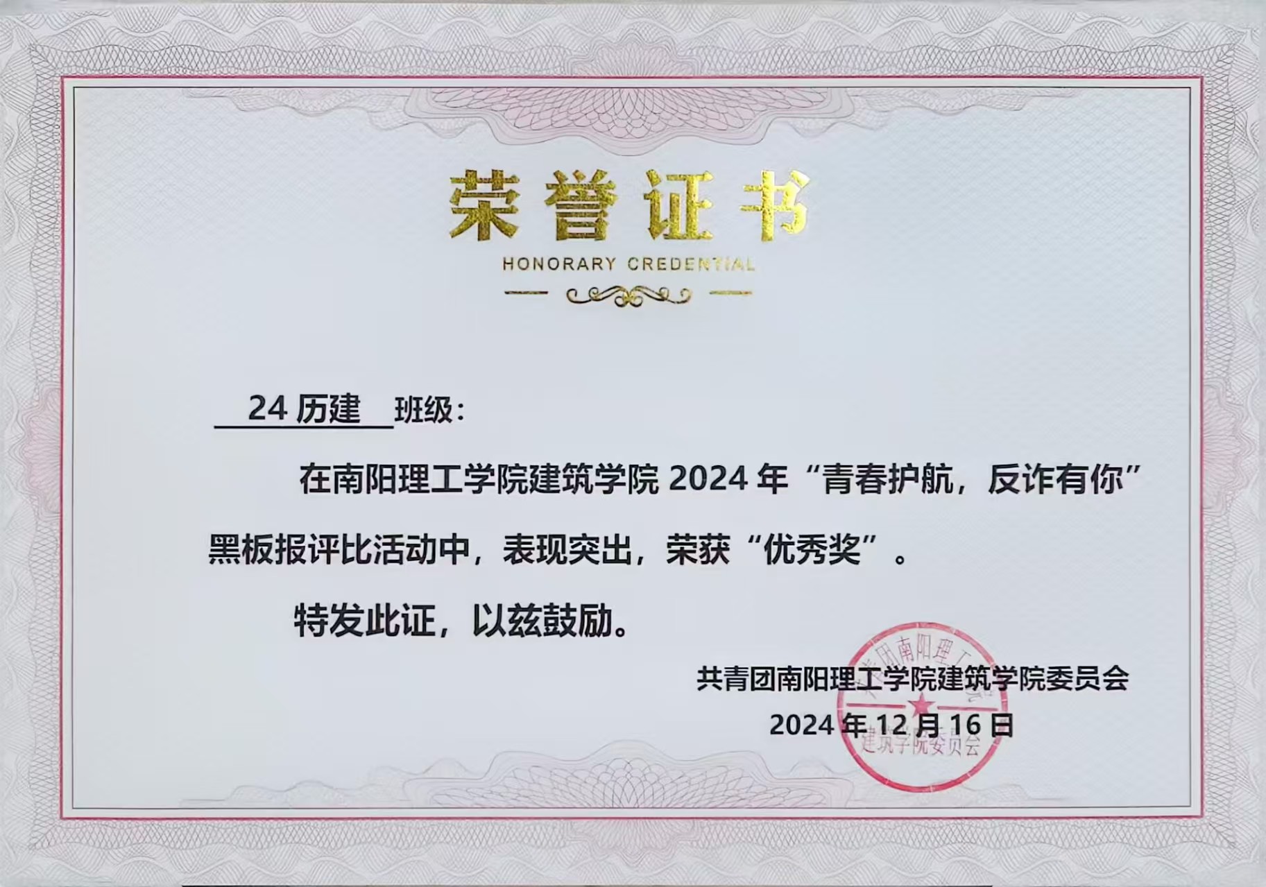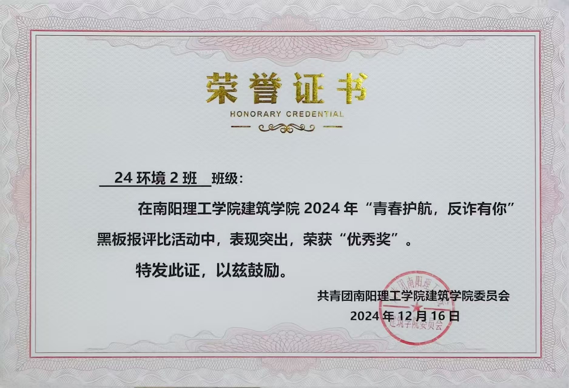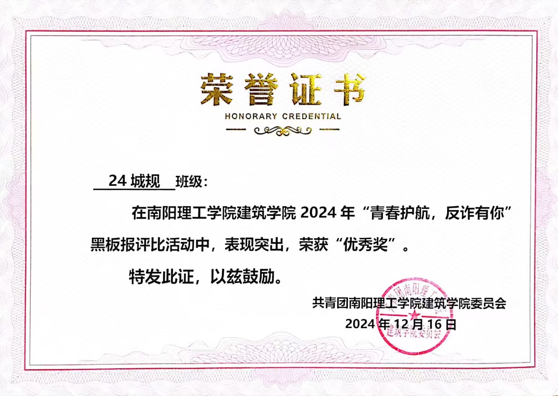 6686体育2024年“青春护航,反诈有你”黑板报评比活动获奖证书