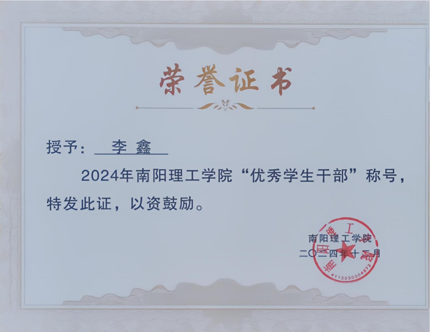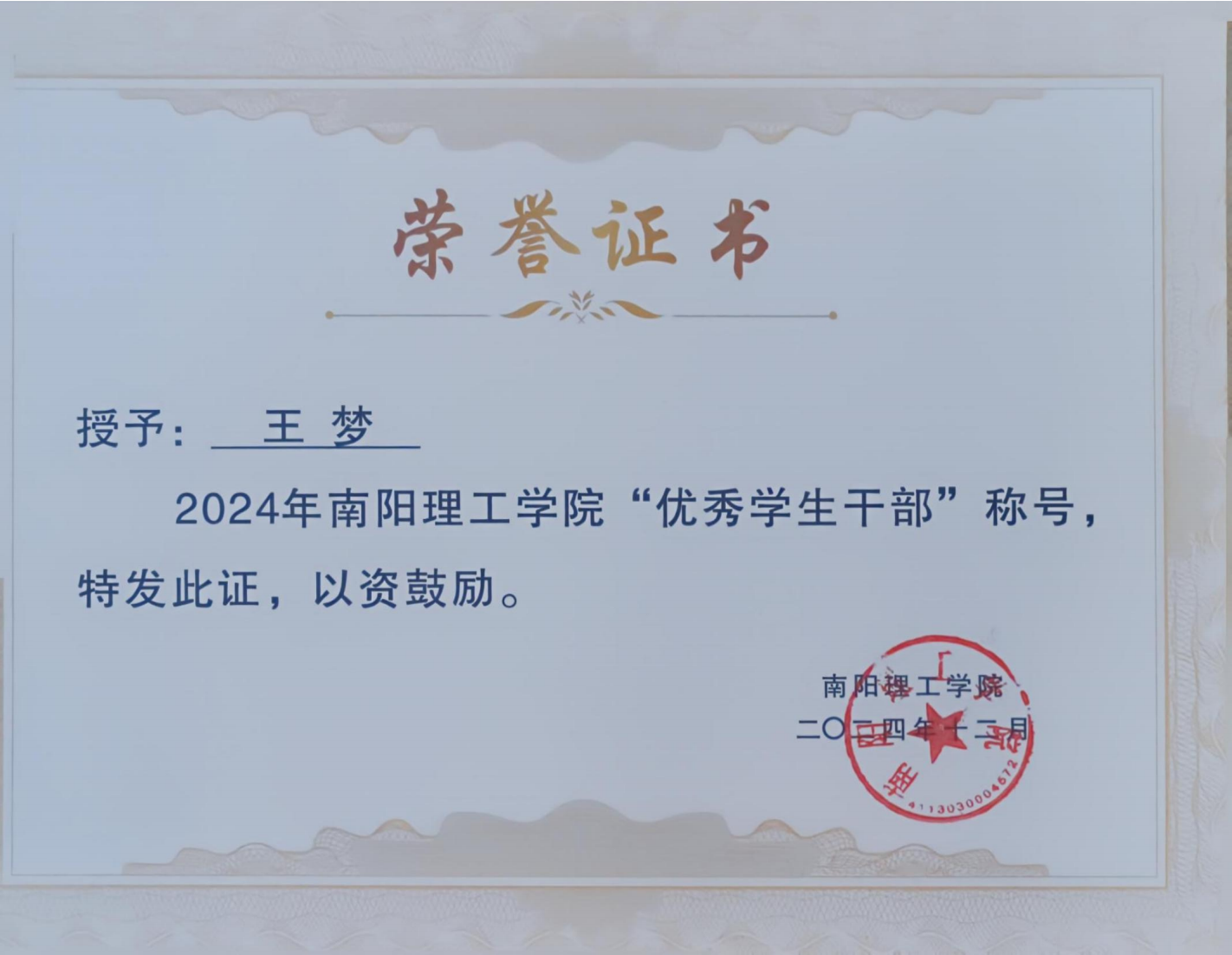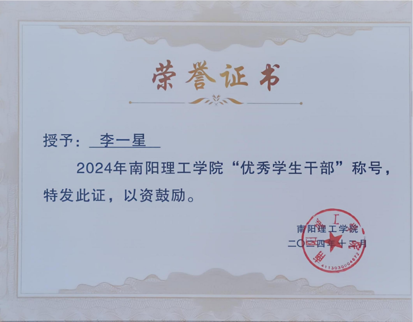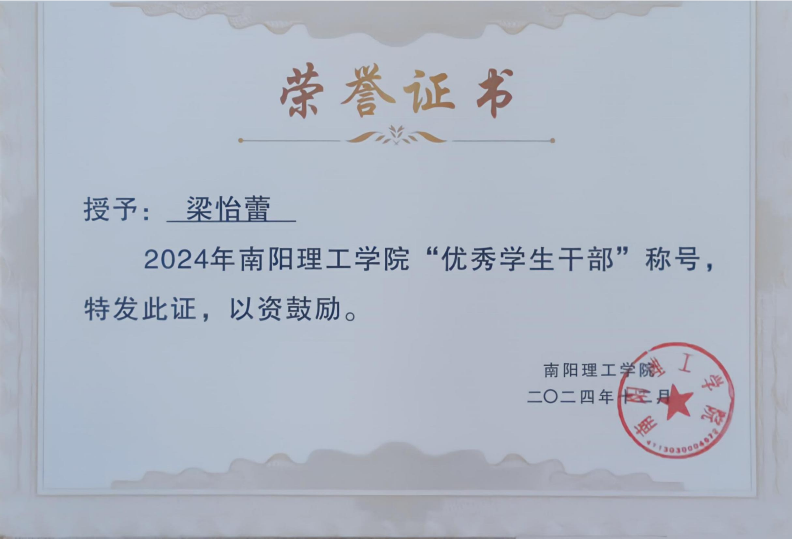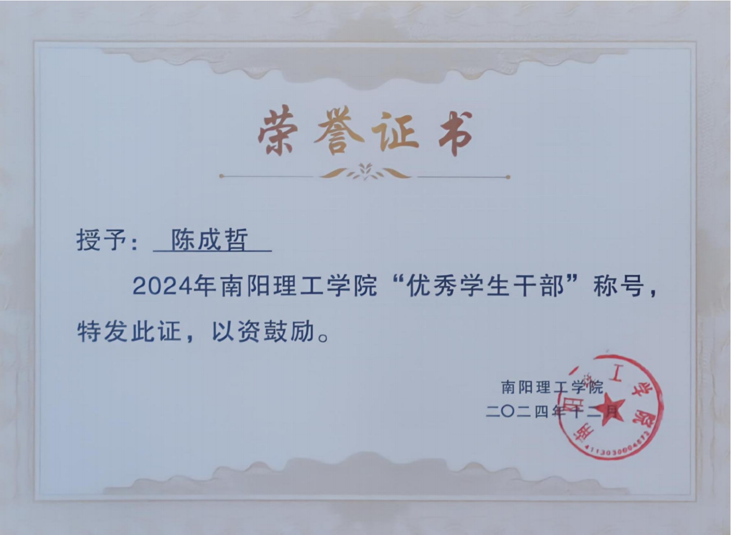 2024年南阳理工学院“优秀学生干部”证书