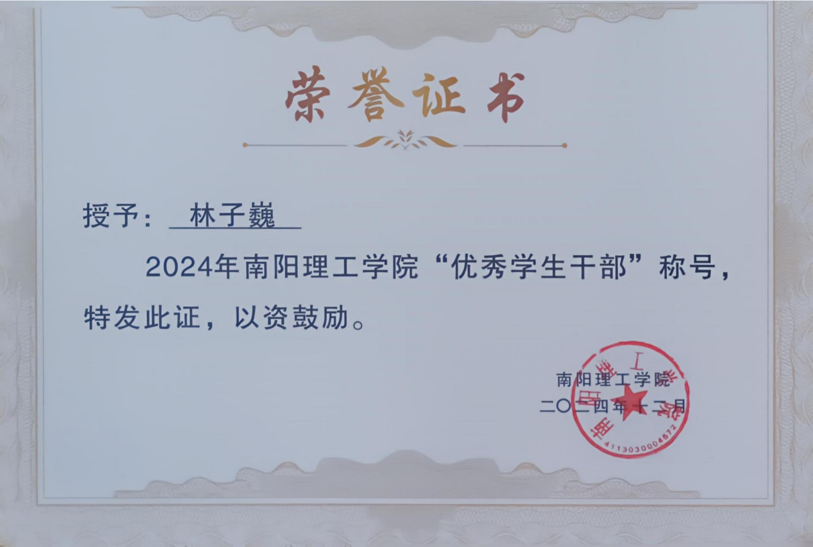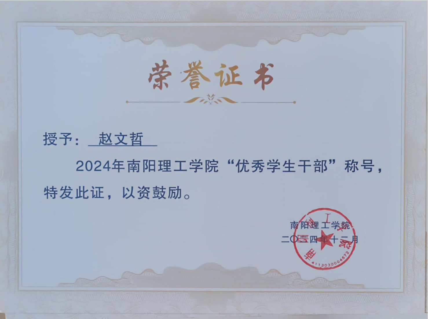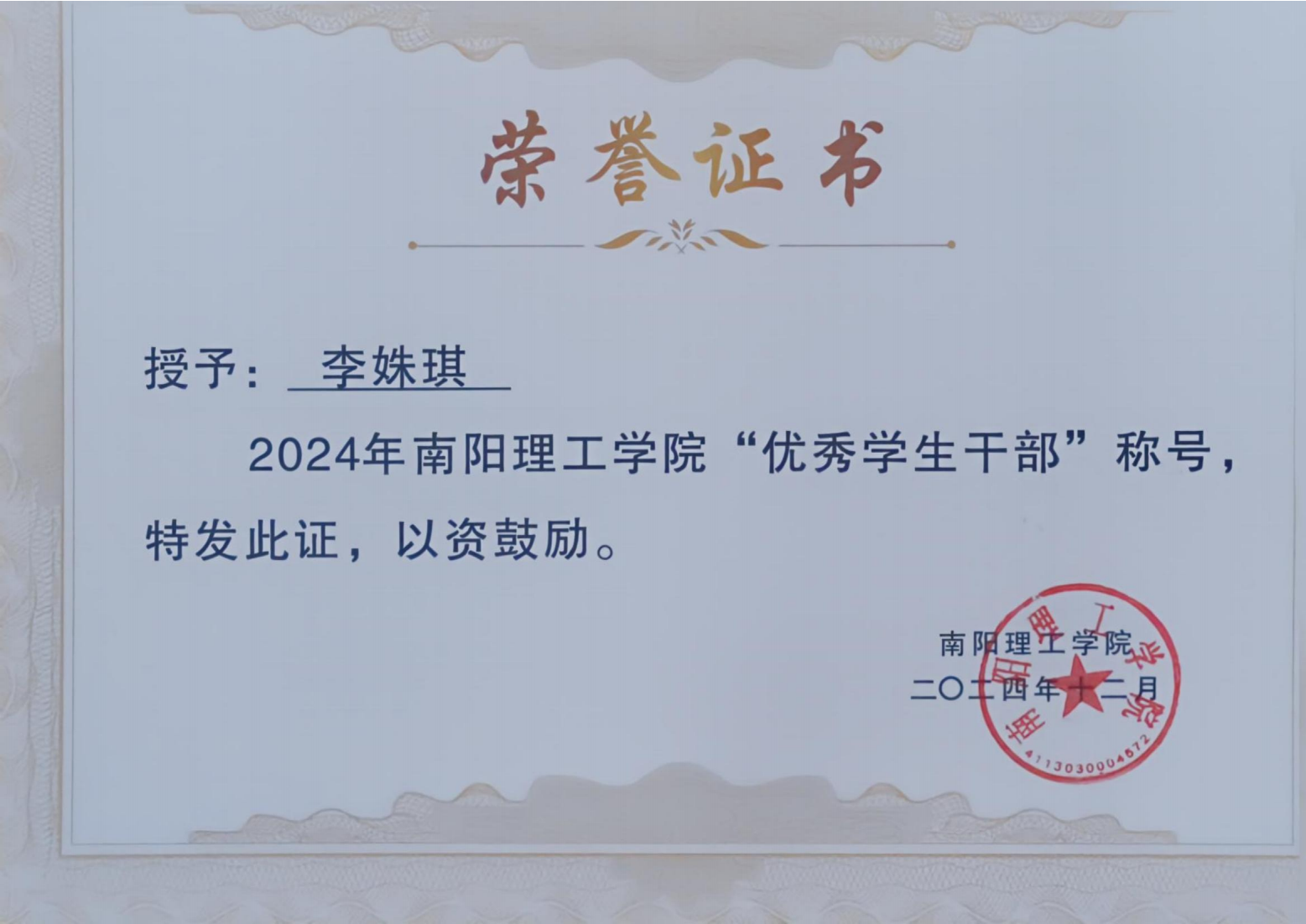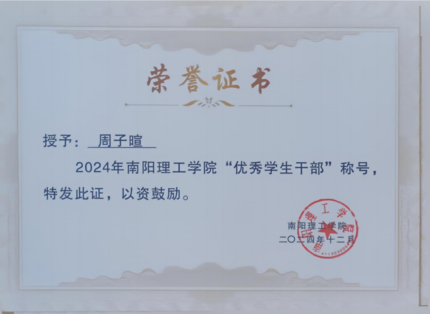 2024年南阳理工学院“优秀学生干部”证书