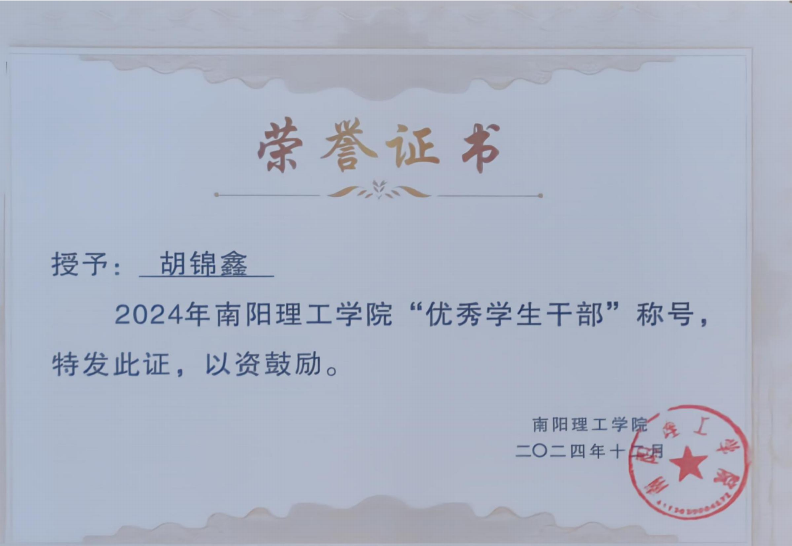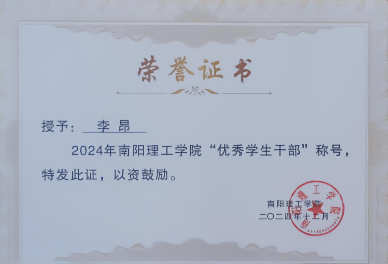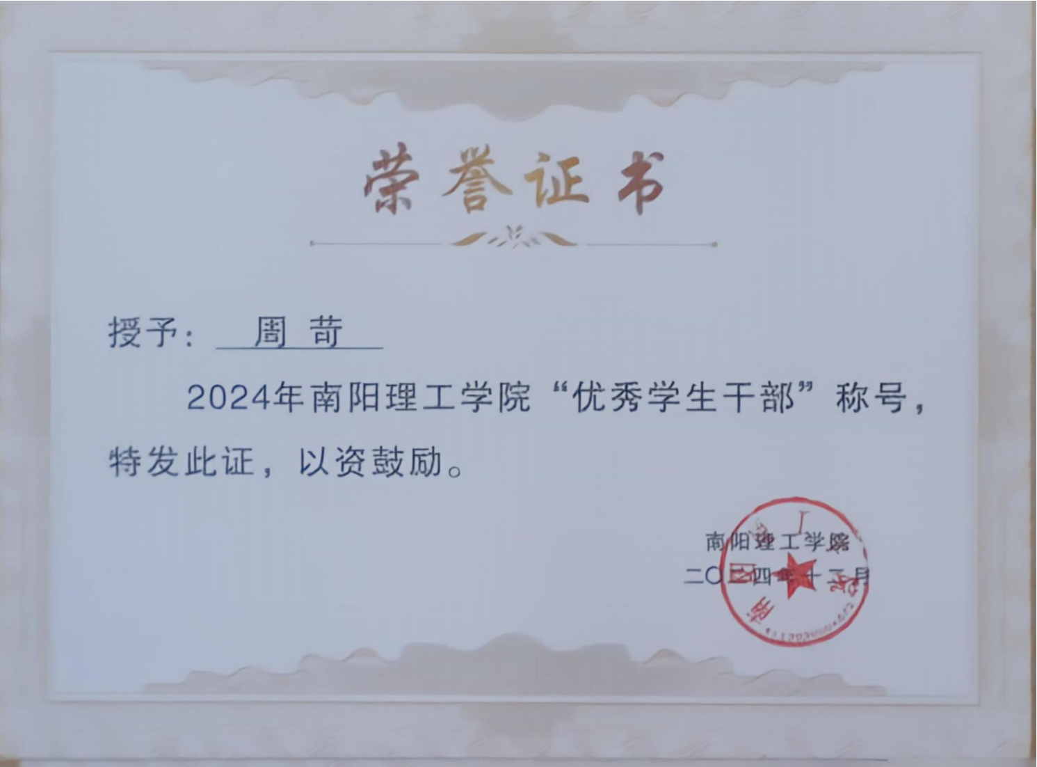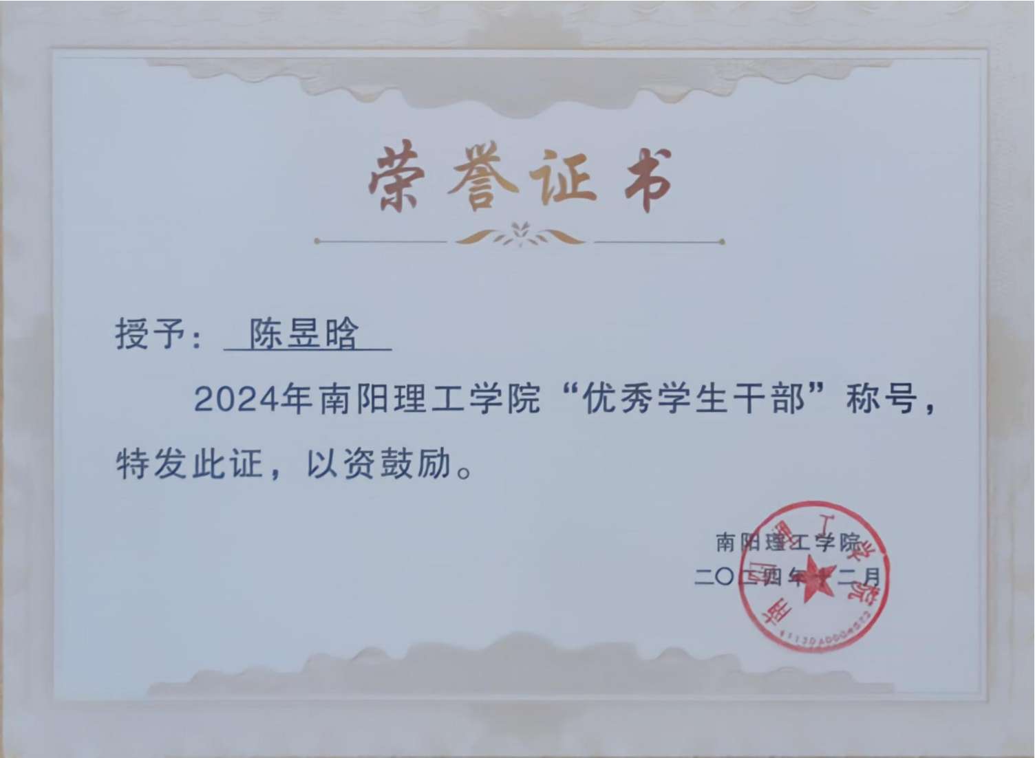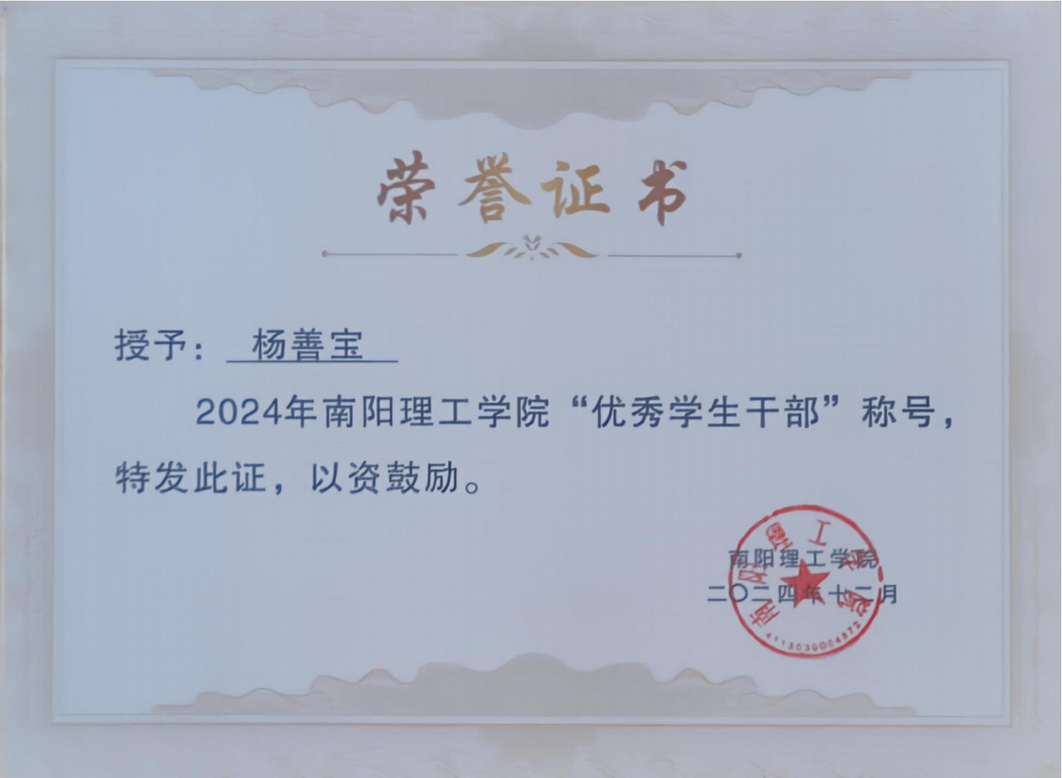 2024年南阳理工学院“优秀学生干部”证书