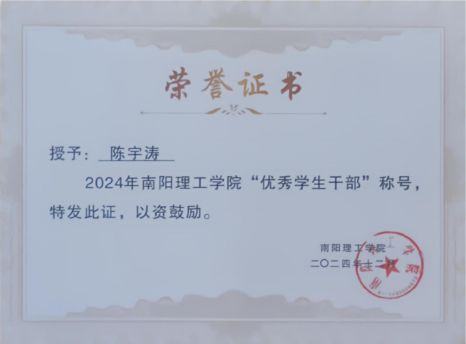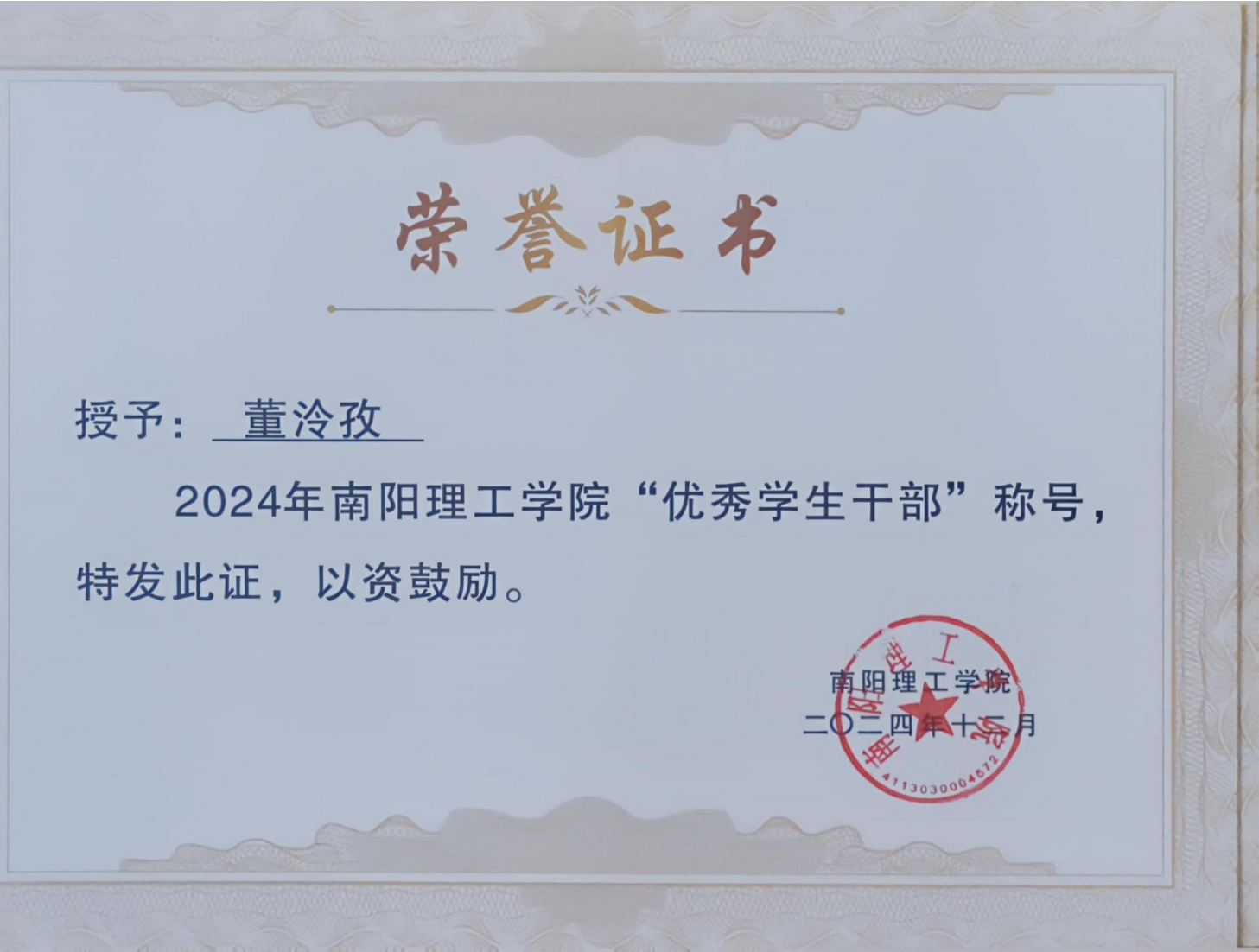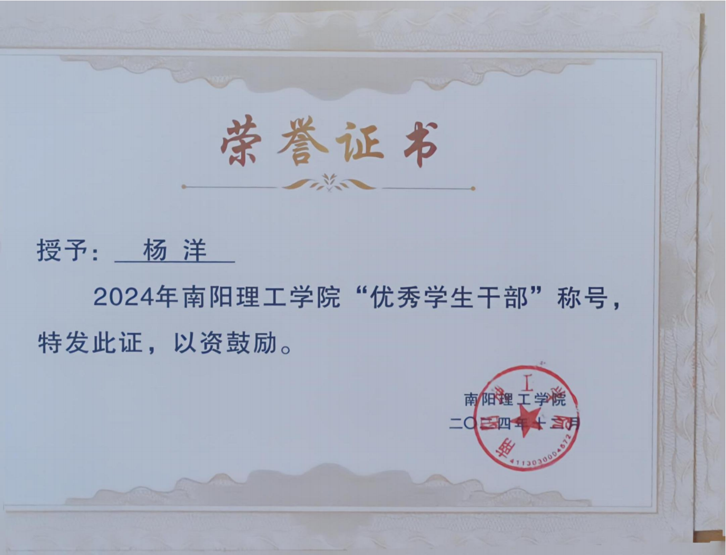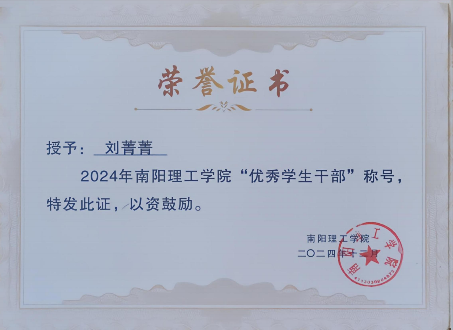 2024年南阳理工学院“优秀学生干部”证书