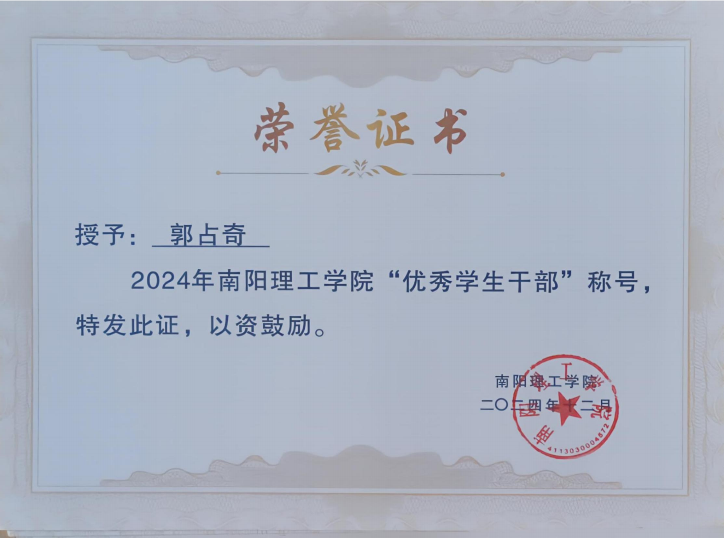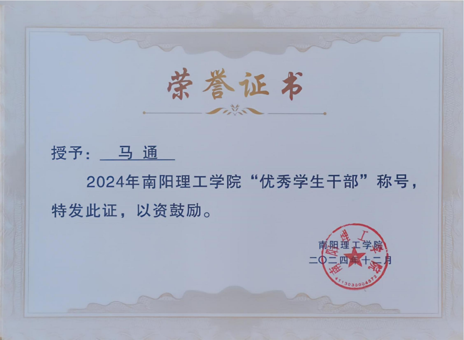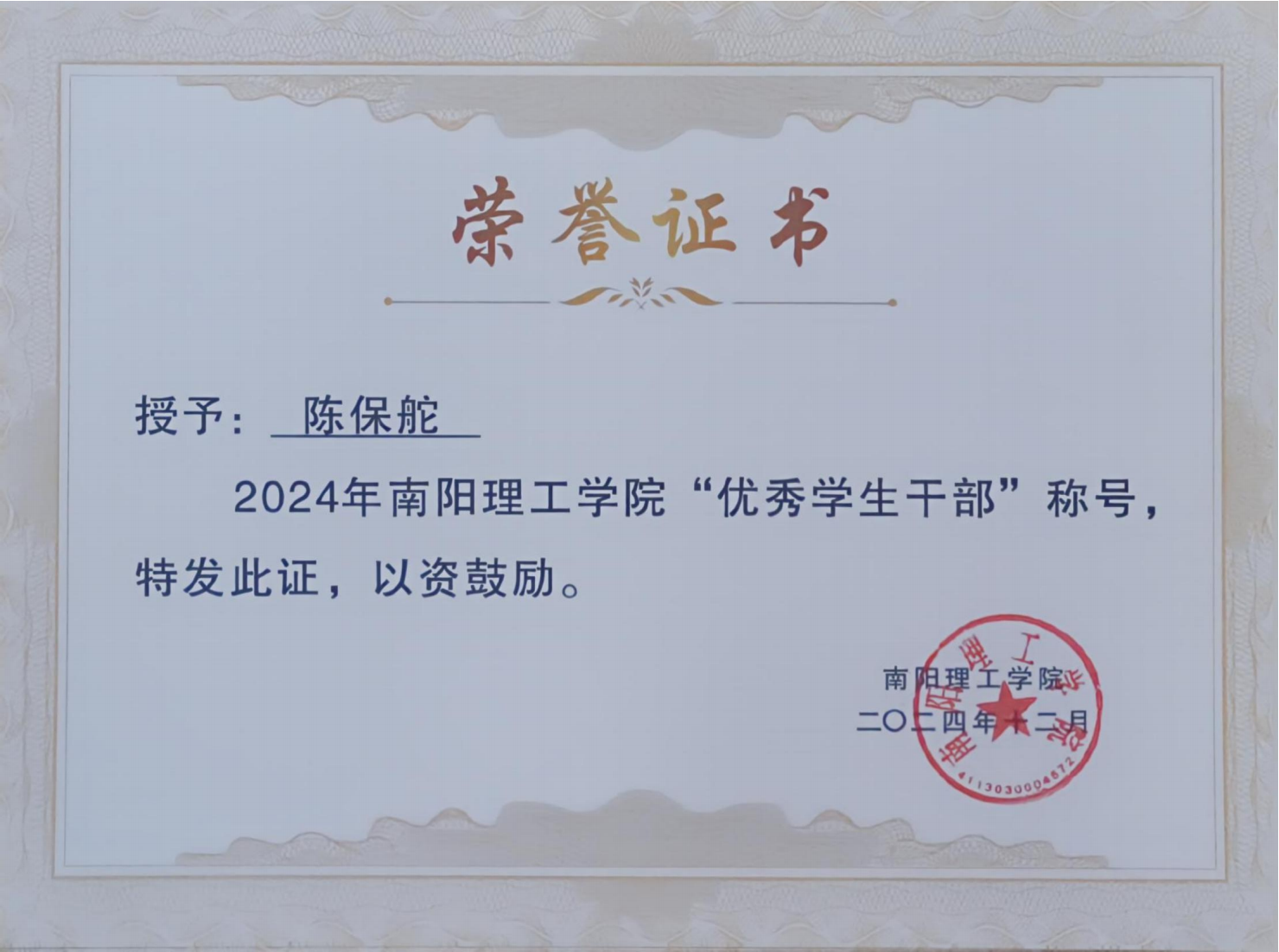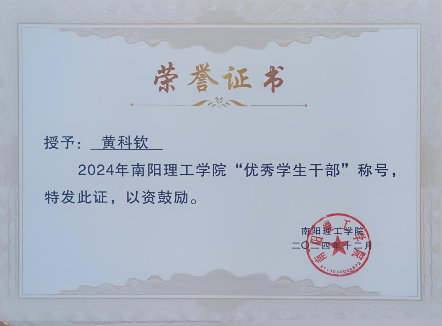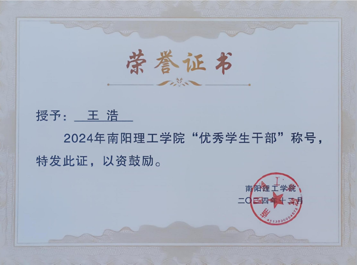 2024年南阳理工学院“优秀学生干部”证书