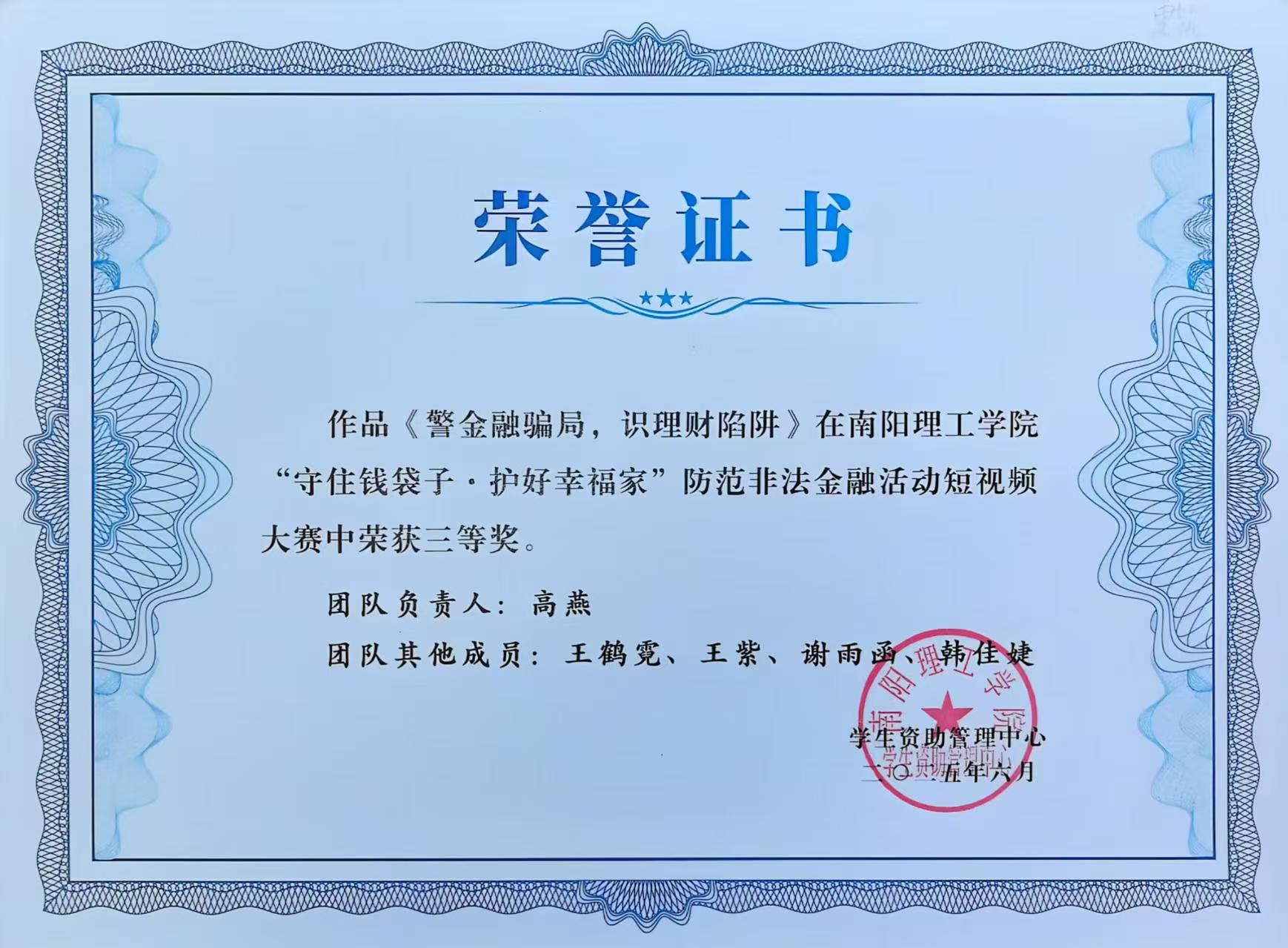 南阳理工学院“守住钱袋子·护好幸福家”防范非法金融活动短视频大赛获奖证书
