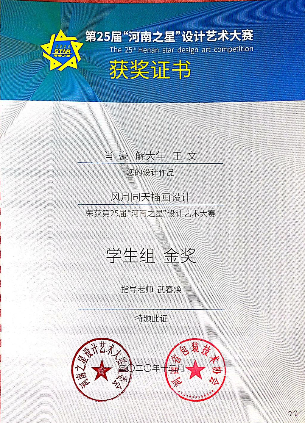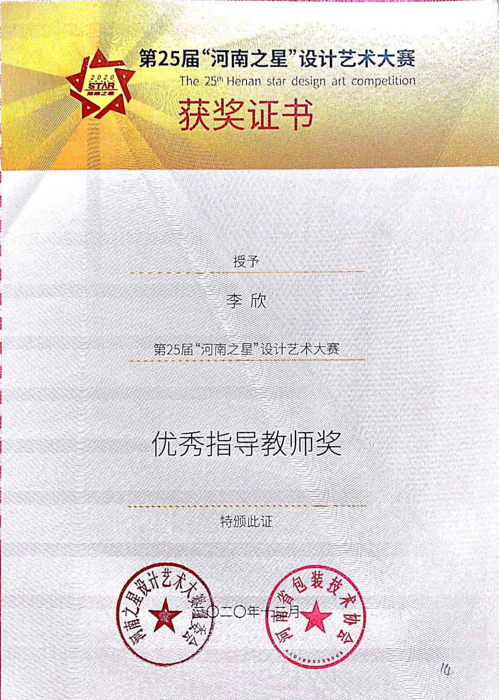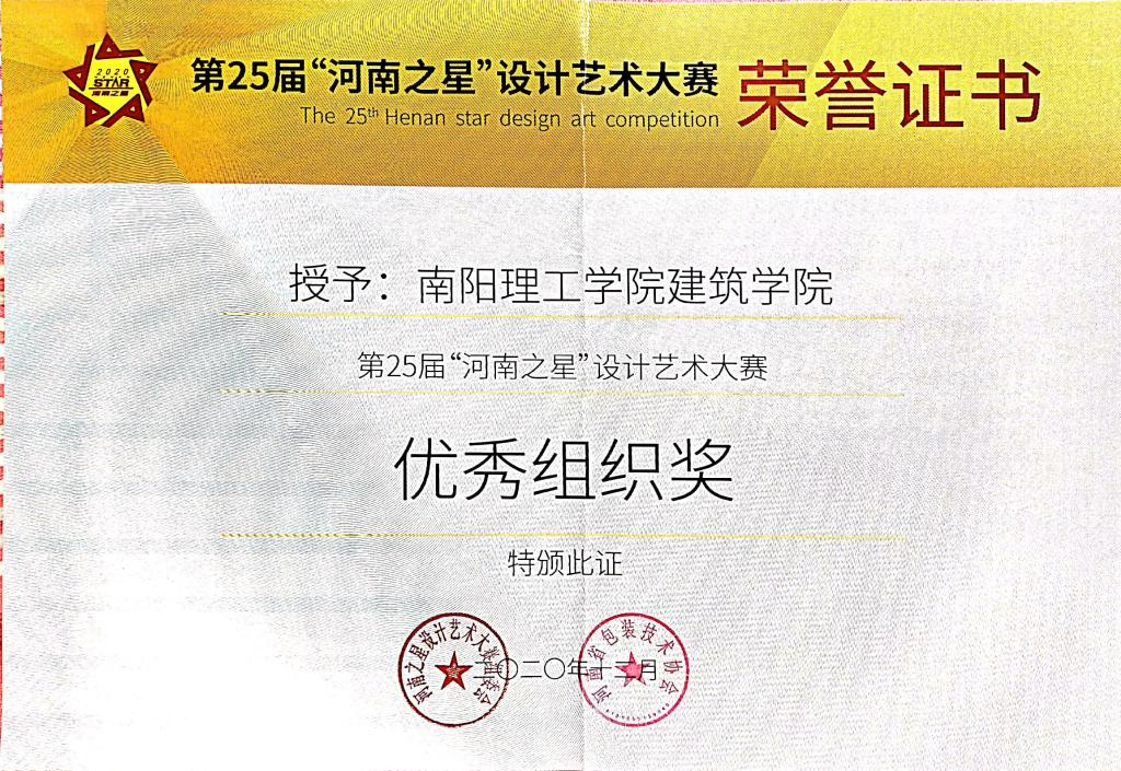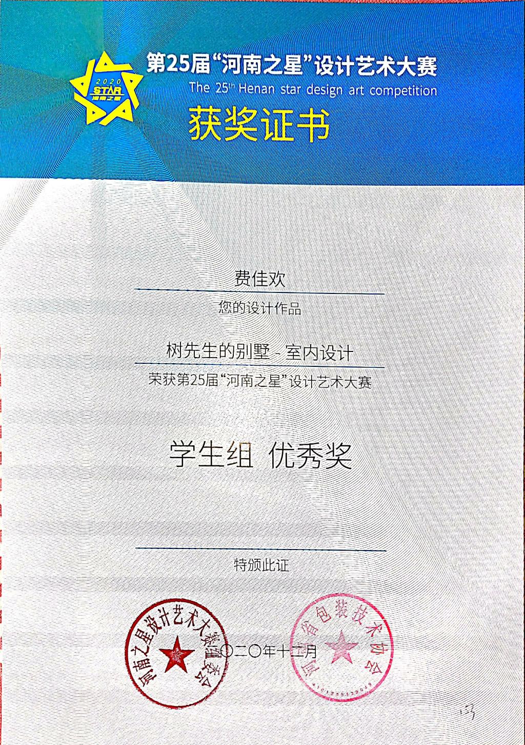 第25届“河南之星”设计艺术大赛获奖证书
