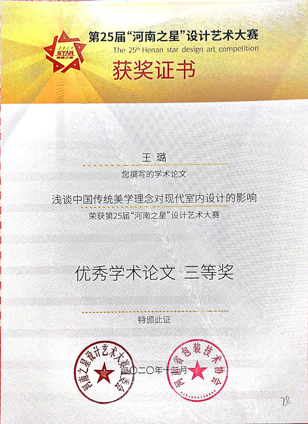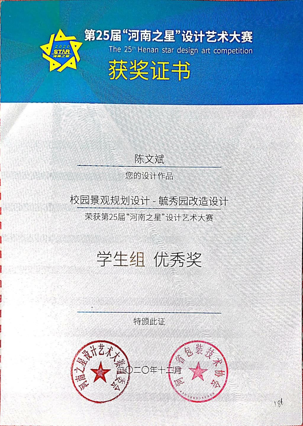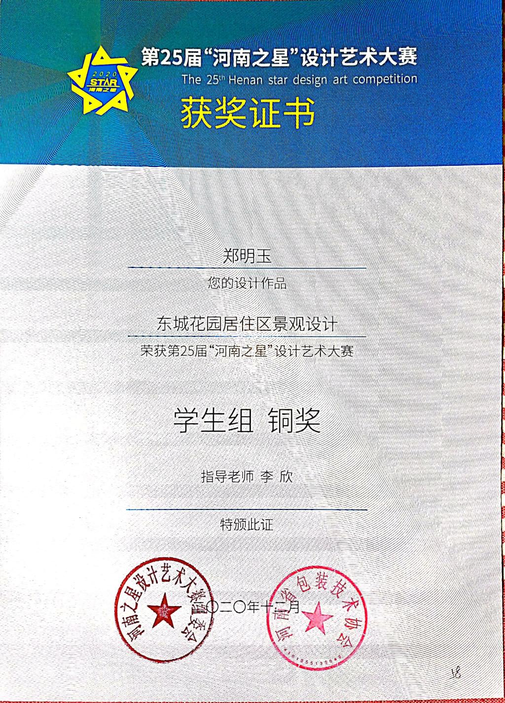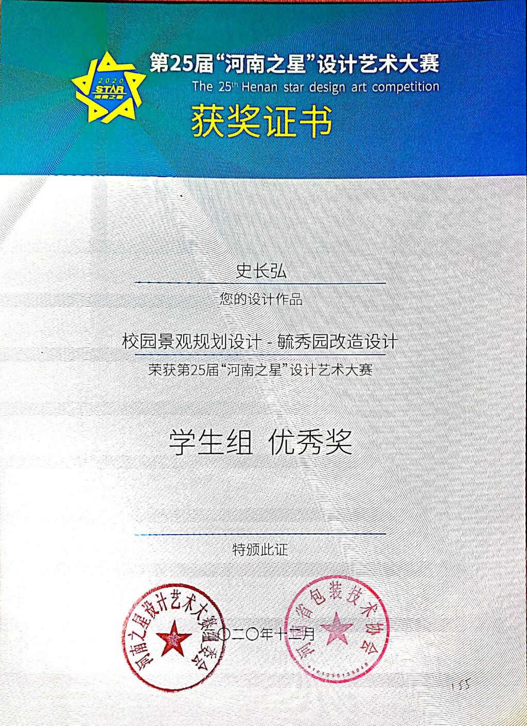 第25届“河南之星”设计艺术大赛获奖证书
