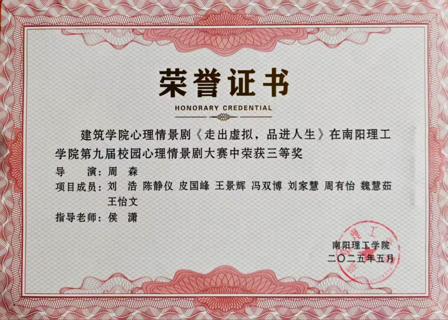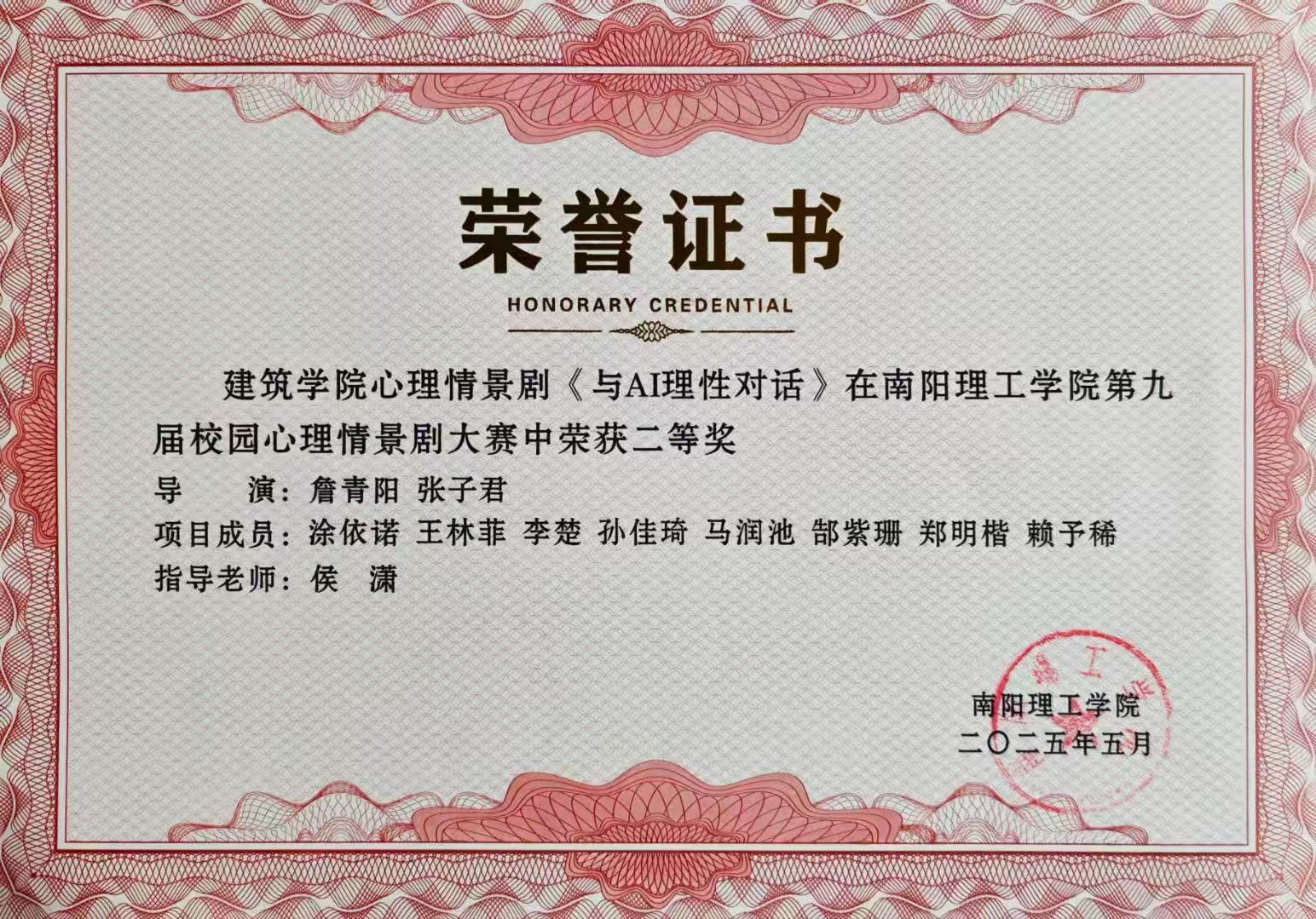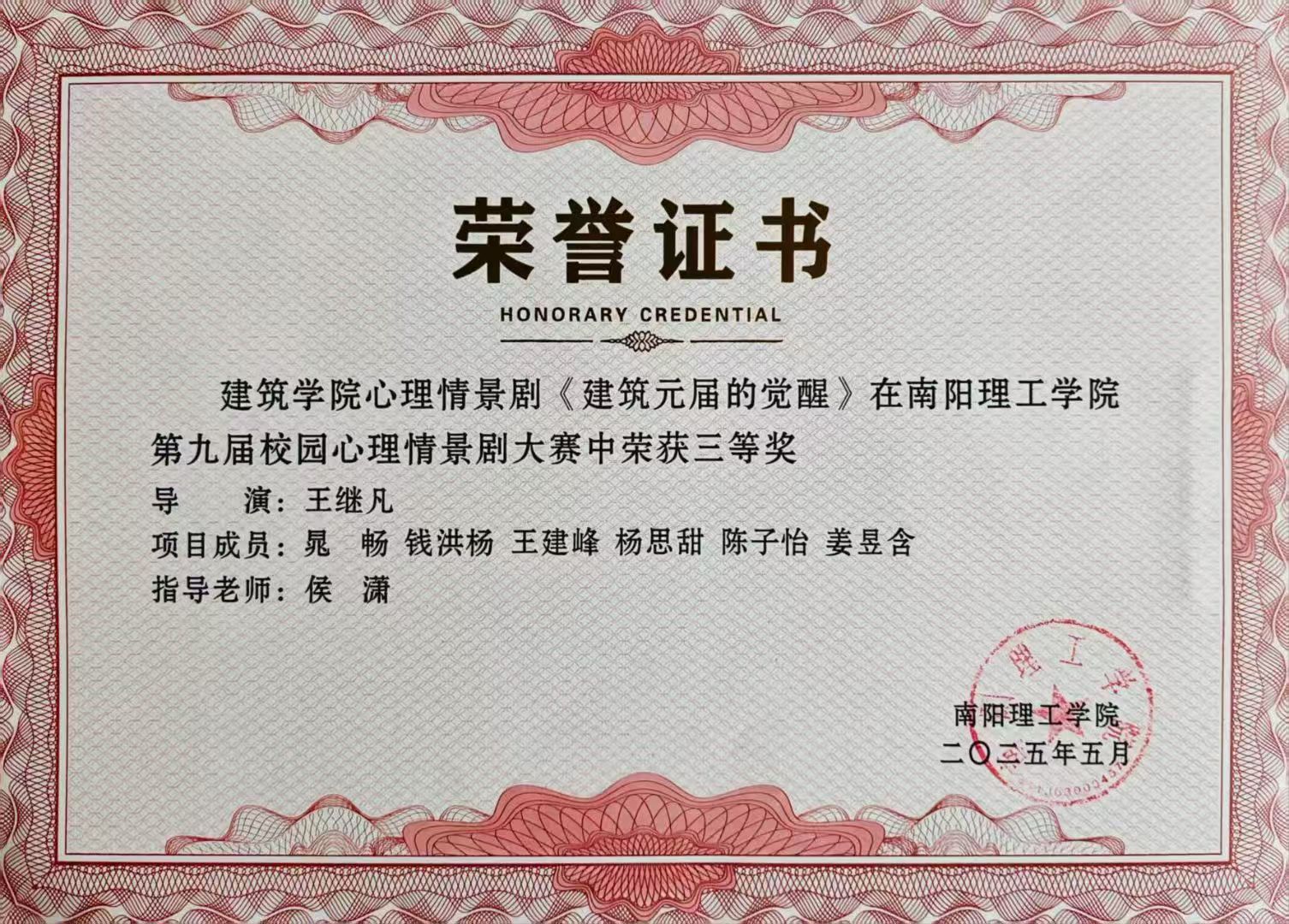 南阳理工学院第九届校园心理情景剧大赛获奖证书