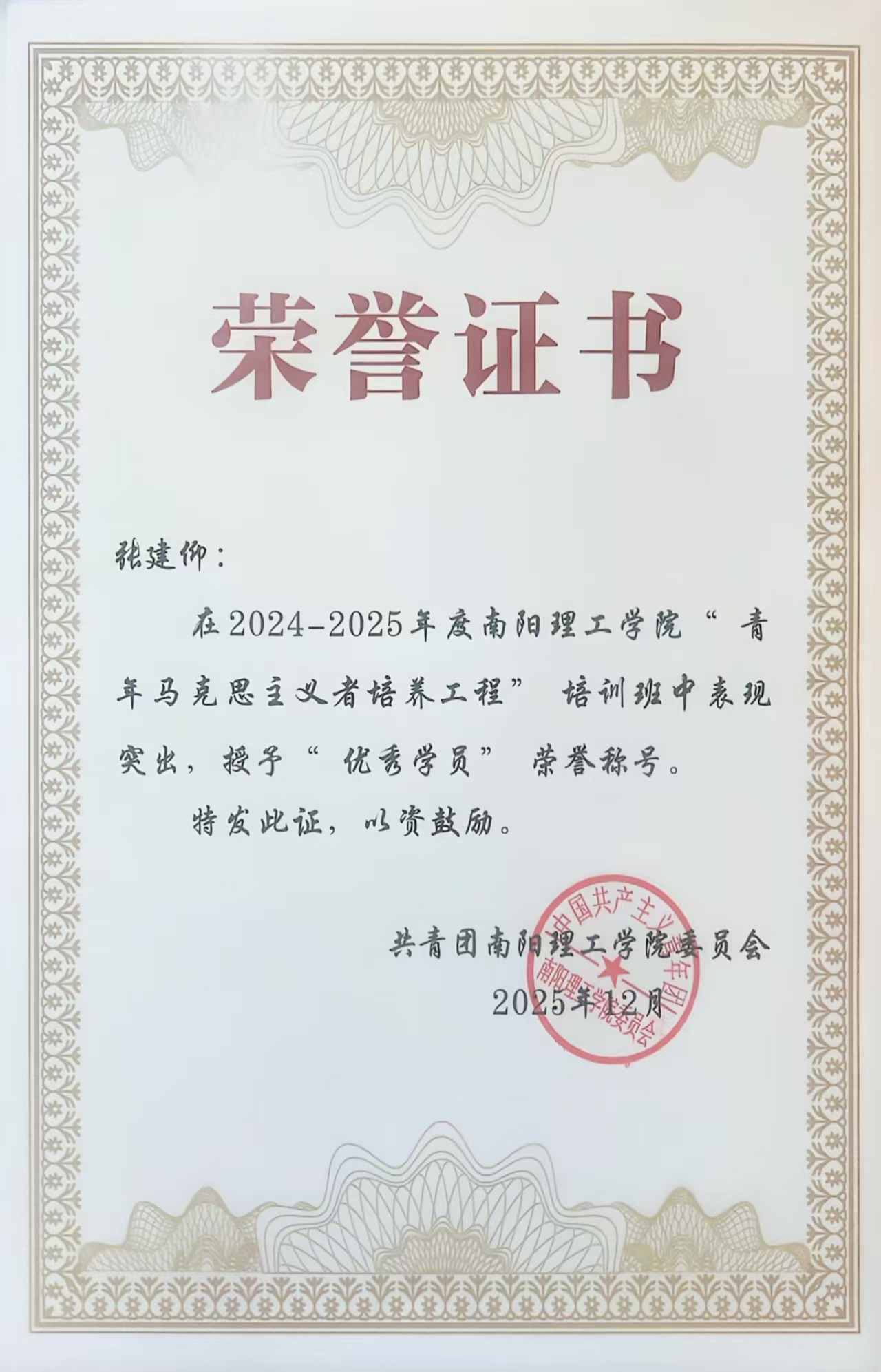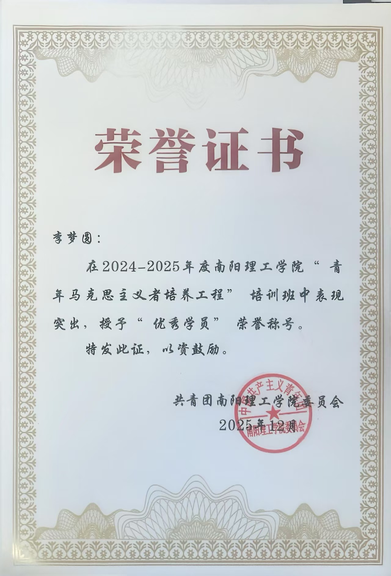 2024一2025年度南阳理工学院"青年马克思主义者培养工程"培训班"优秀学员"荣誉证书