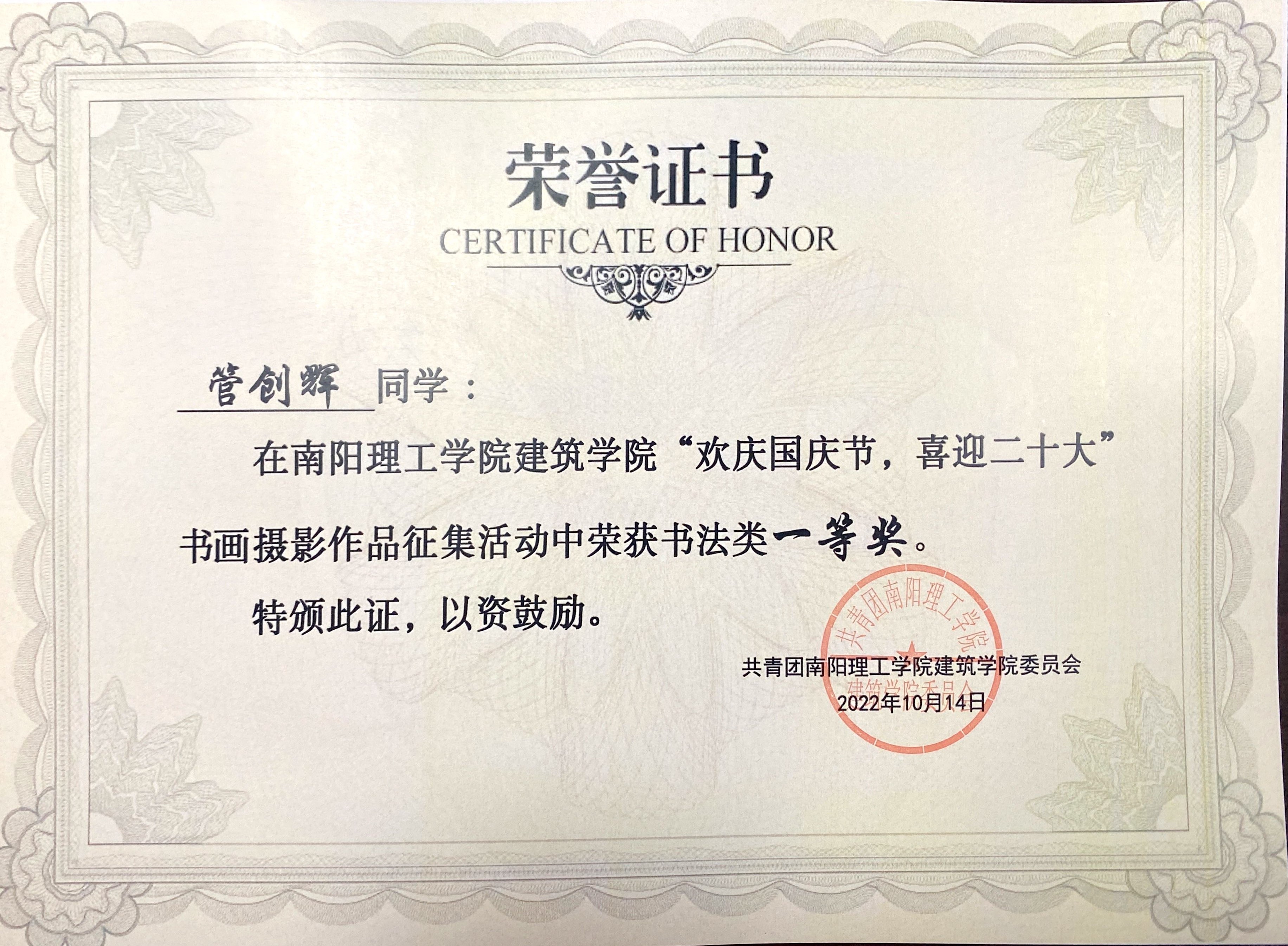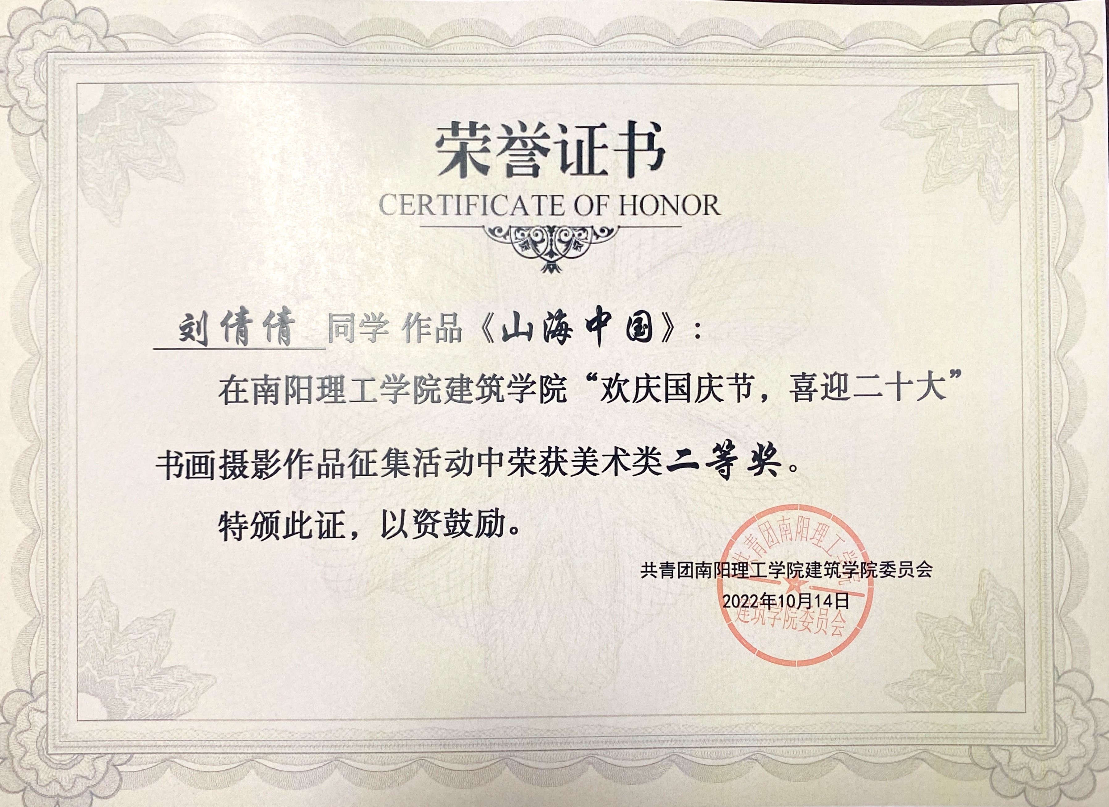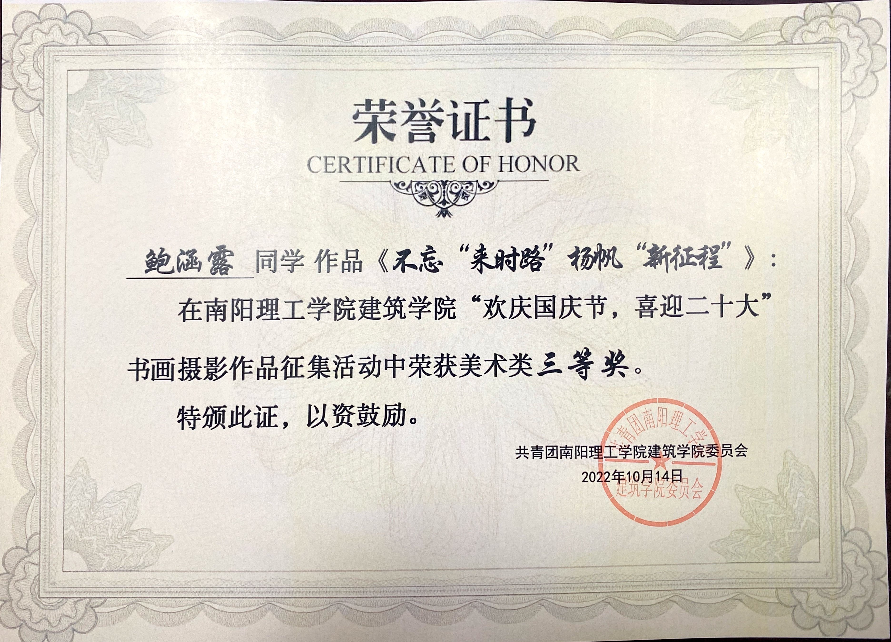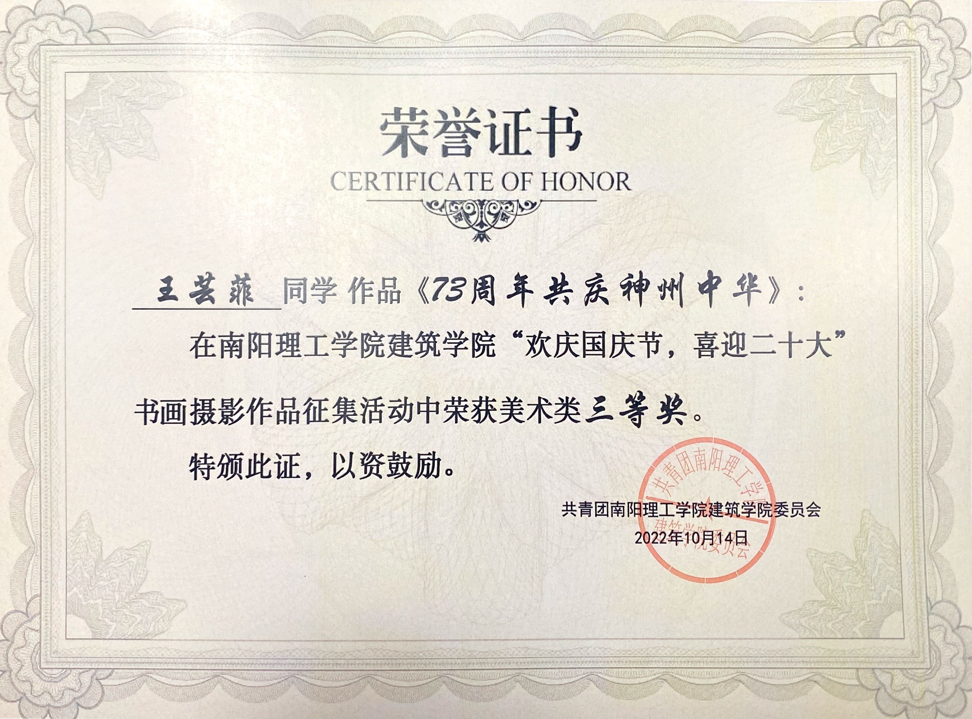 欢庆国庆节,喜迎二十大作品征集活动获奖证书