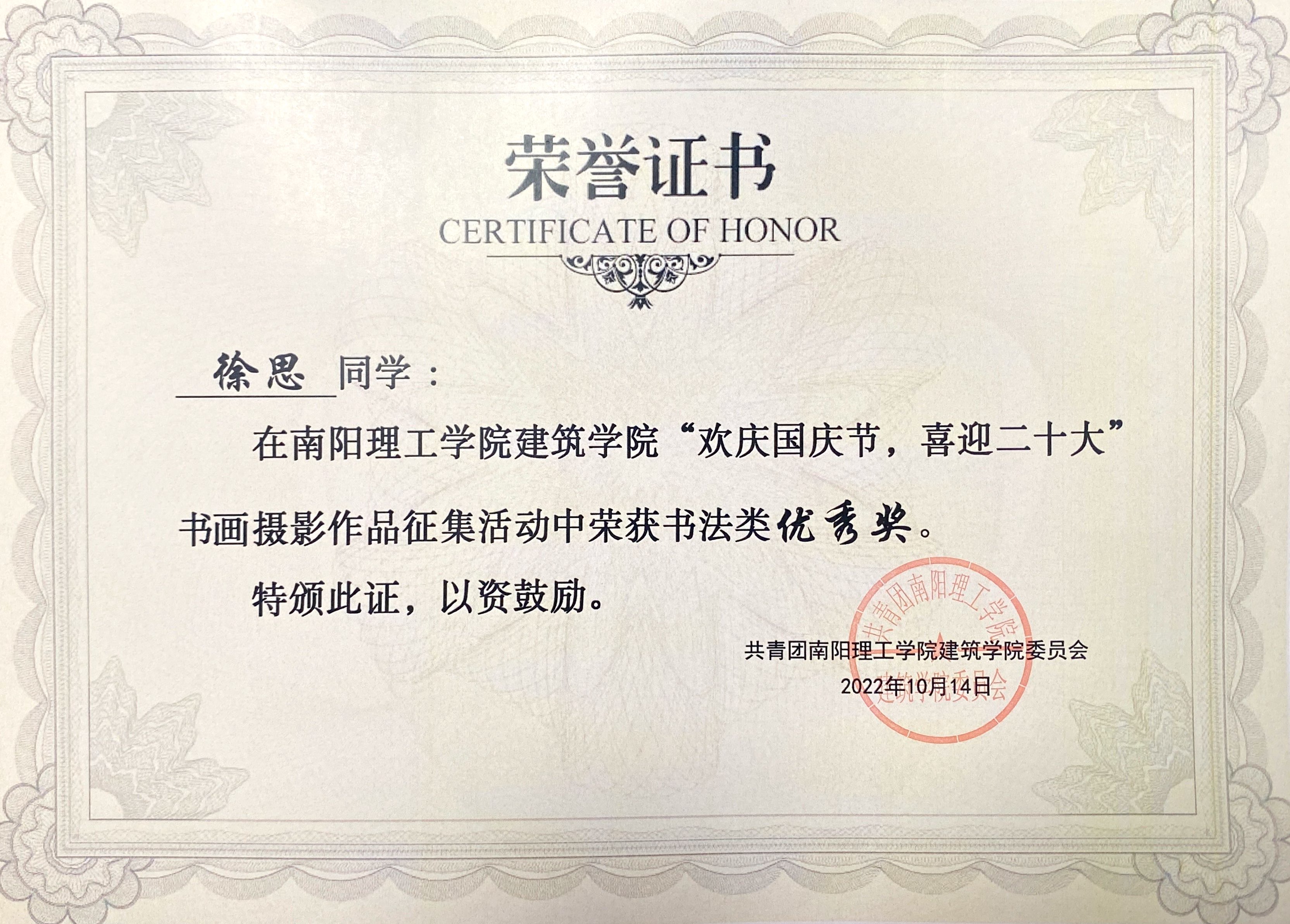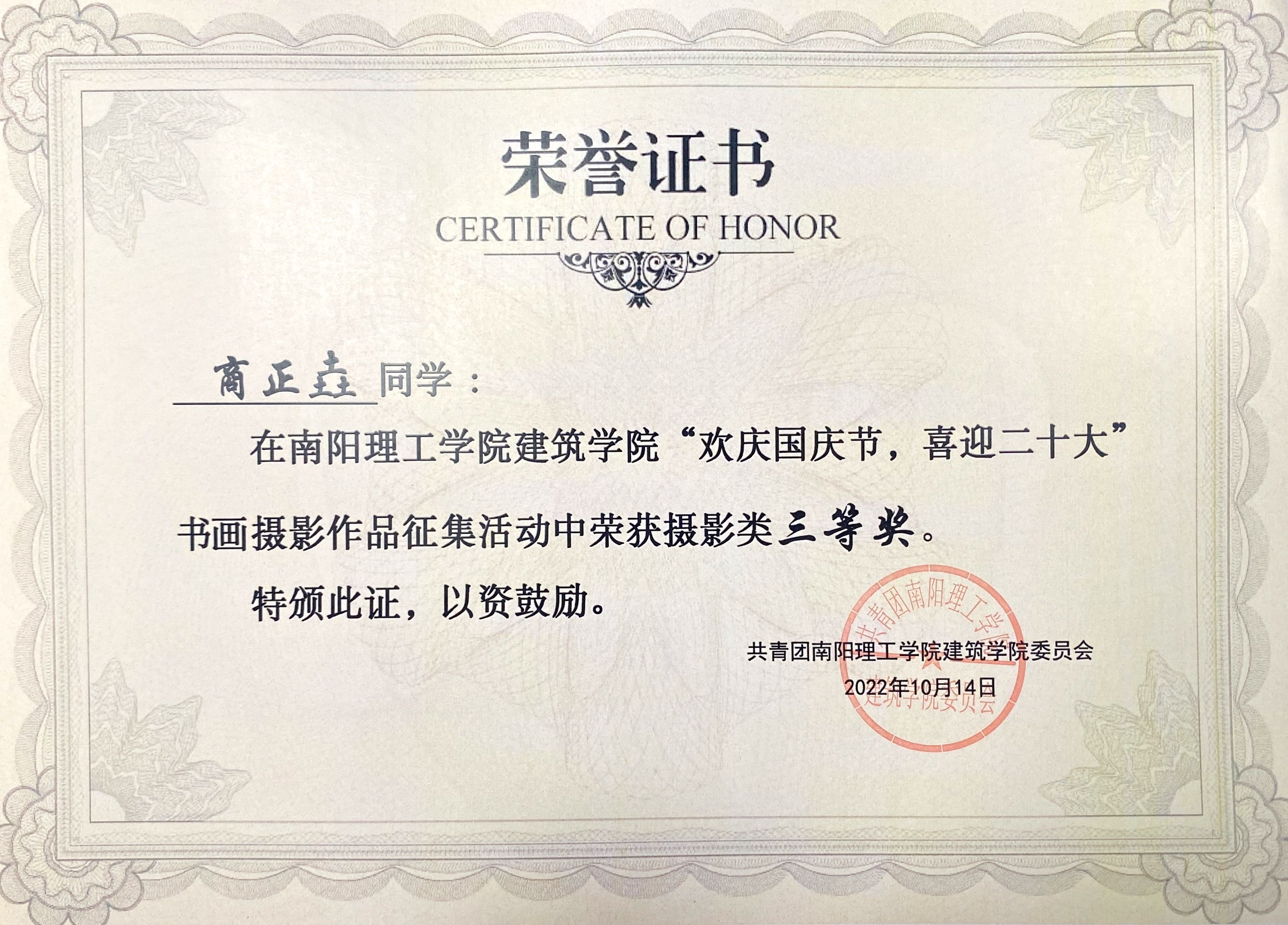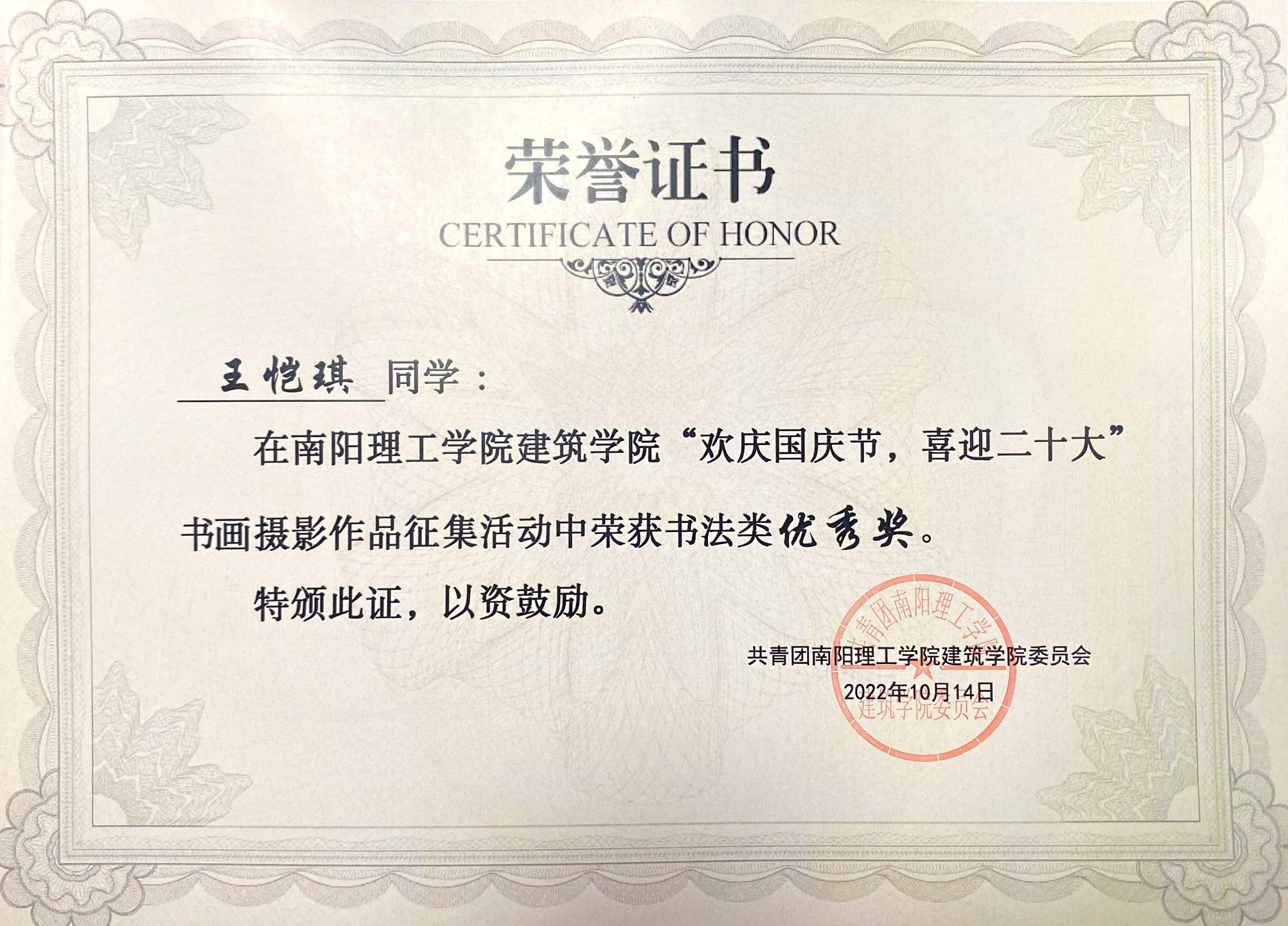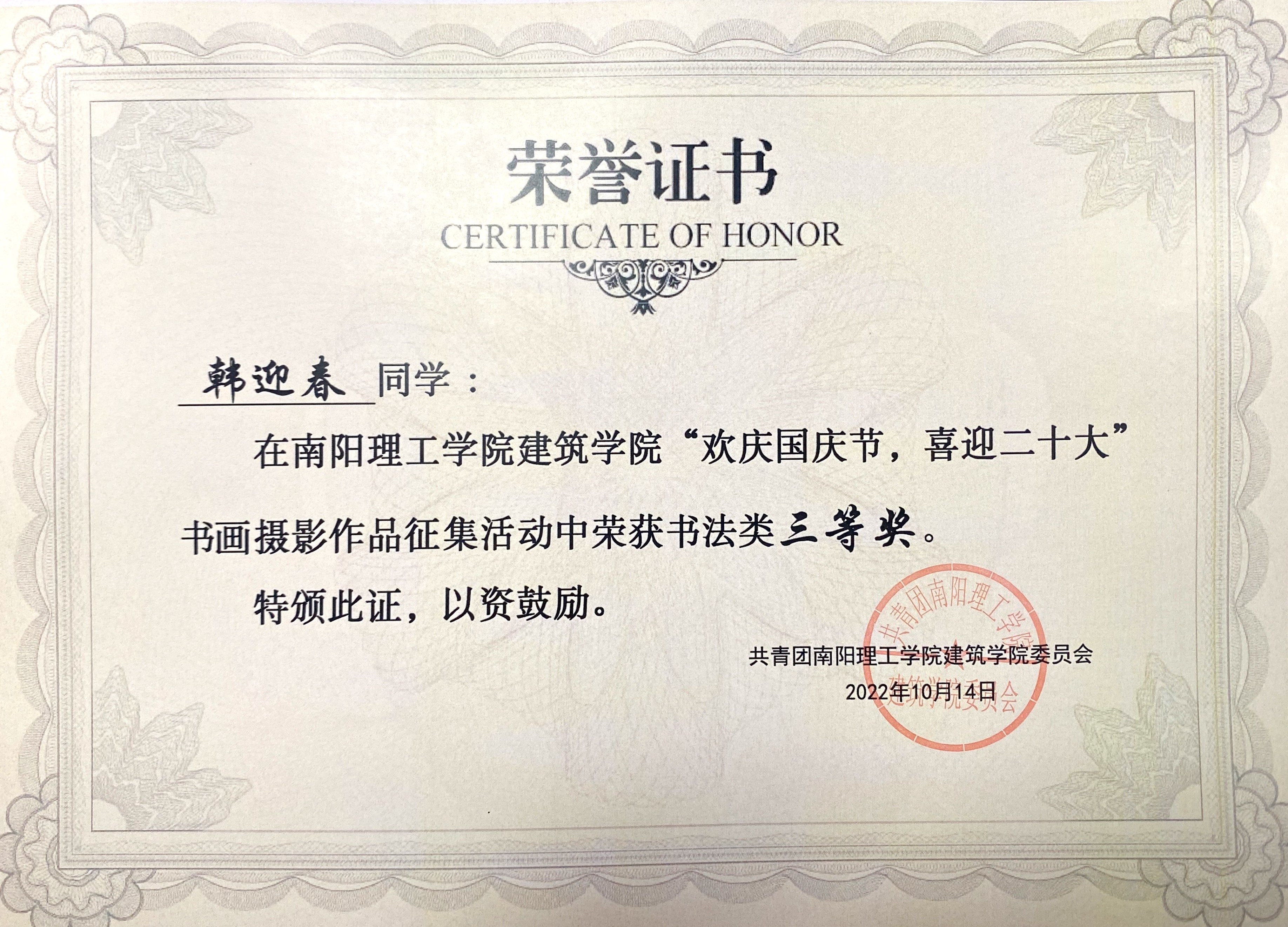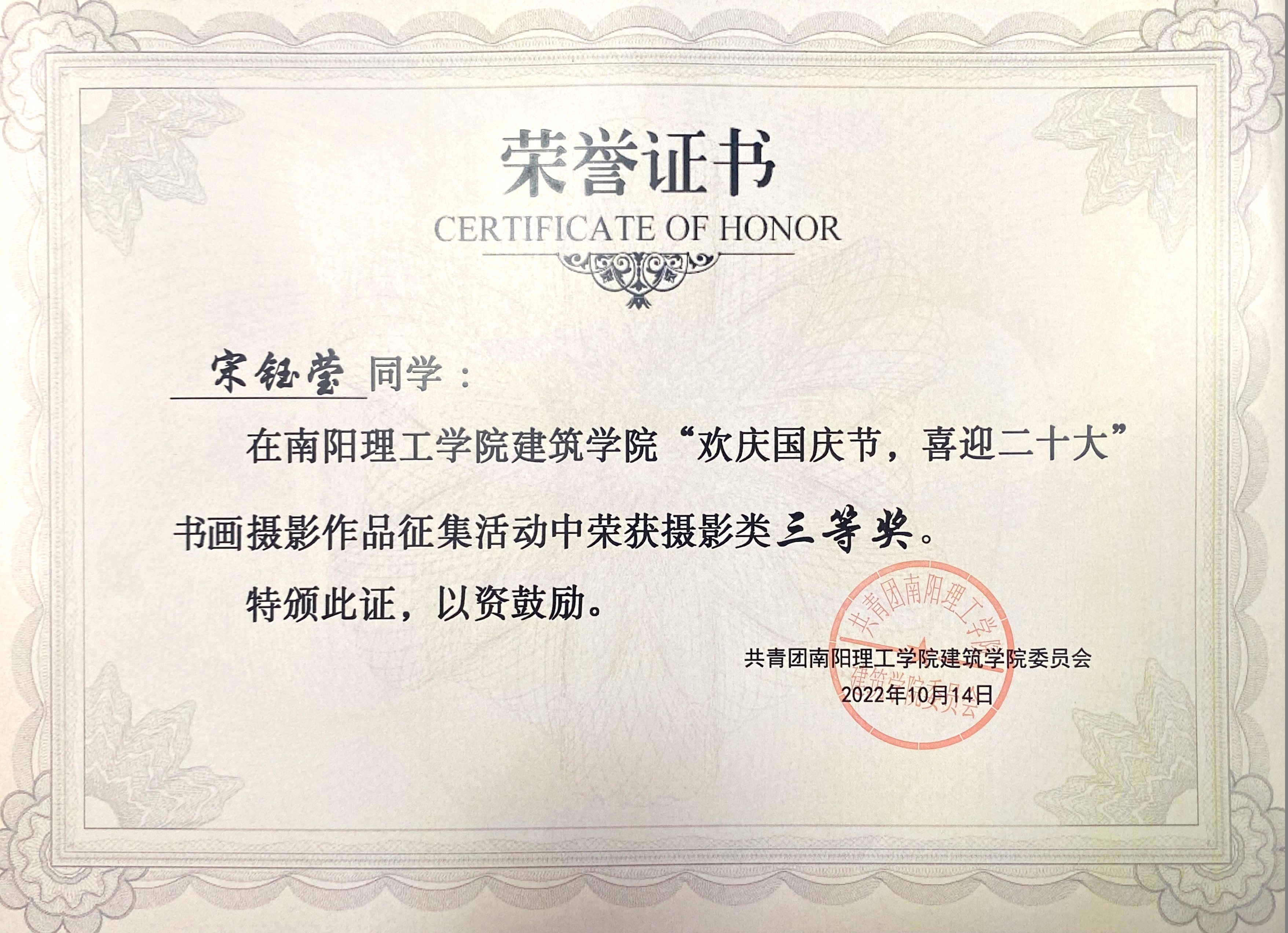 欢庆国庆节,喜迎二十大作品征集活动获奖证书