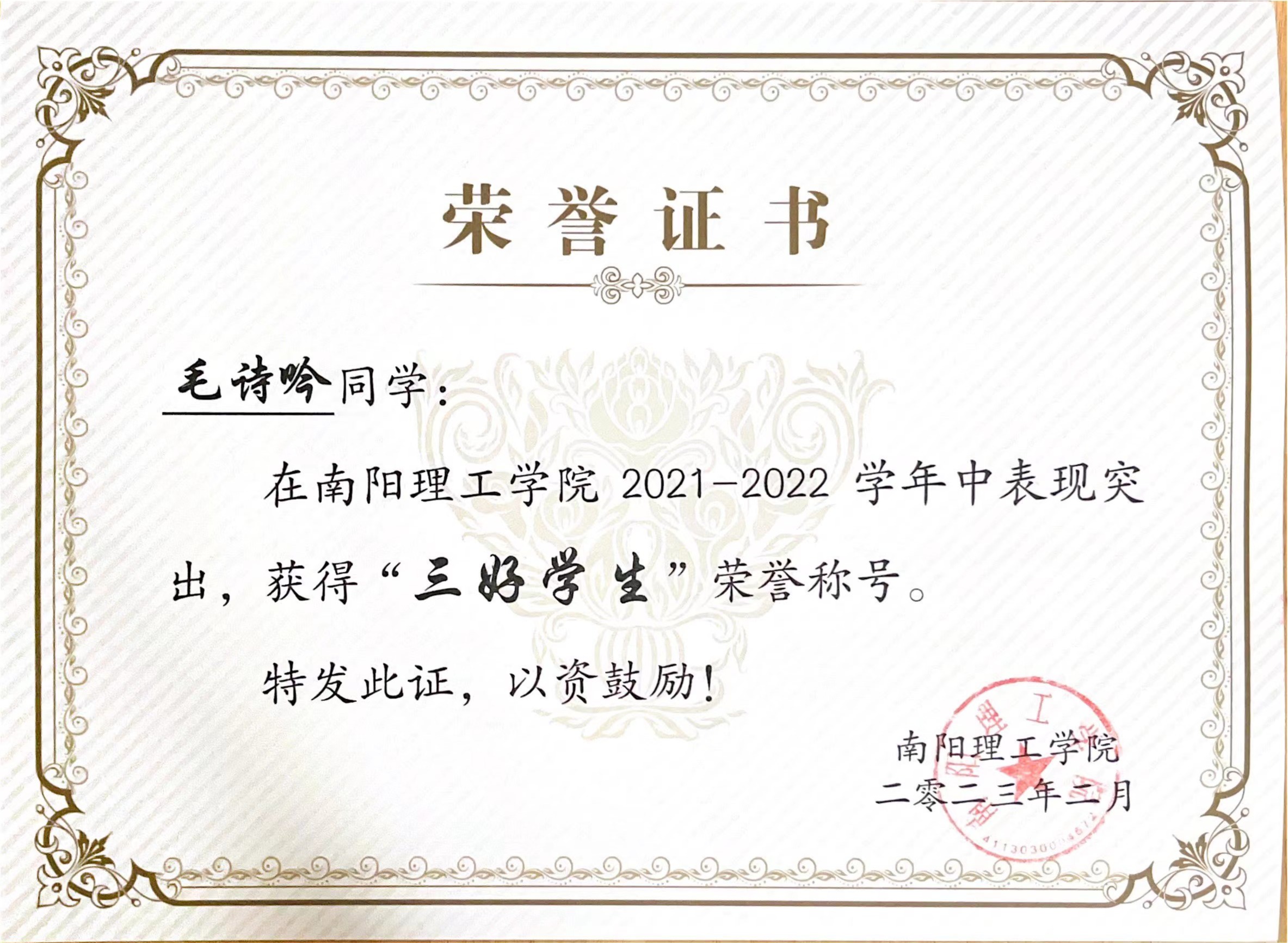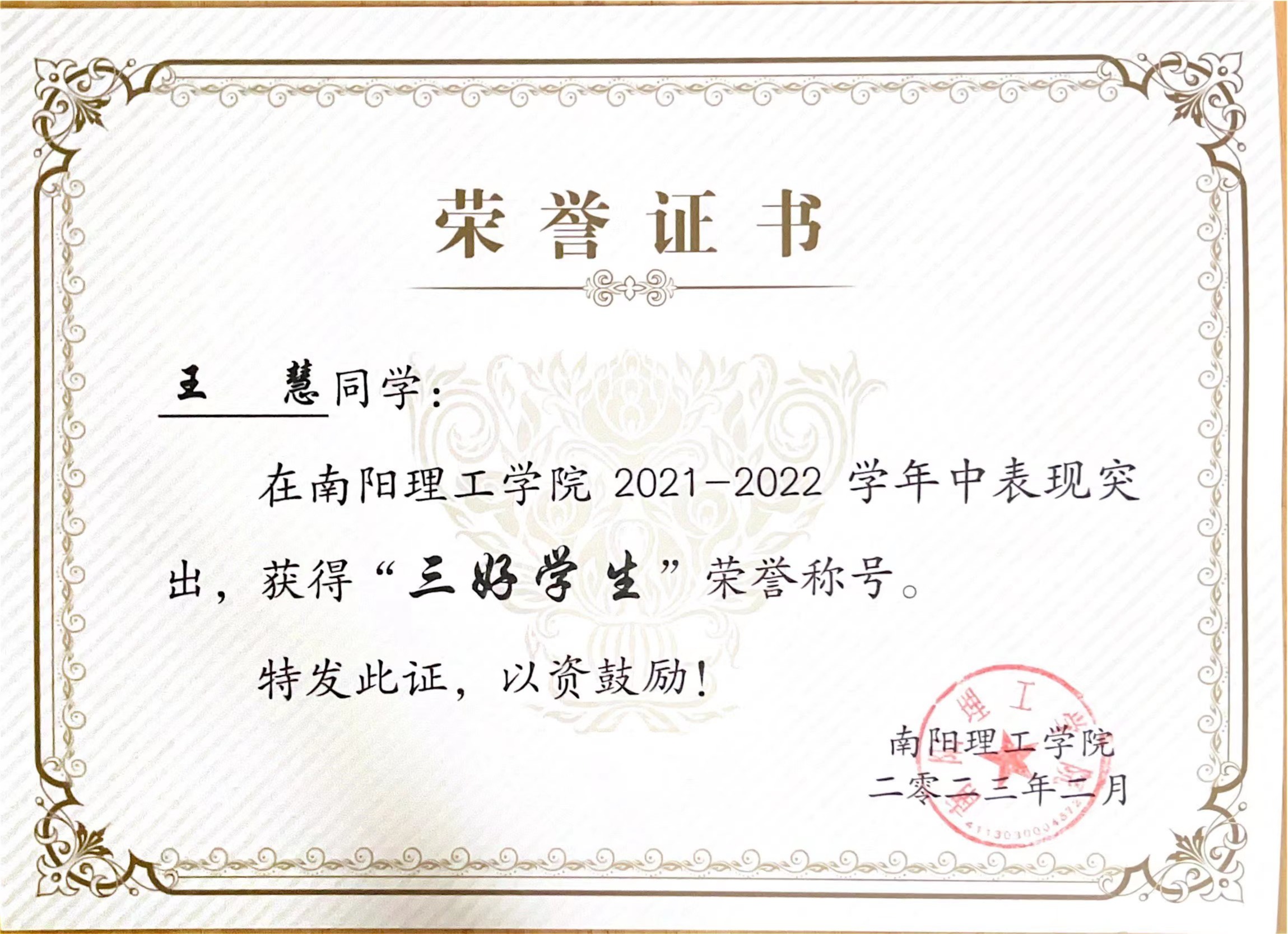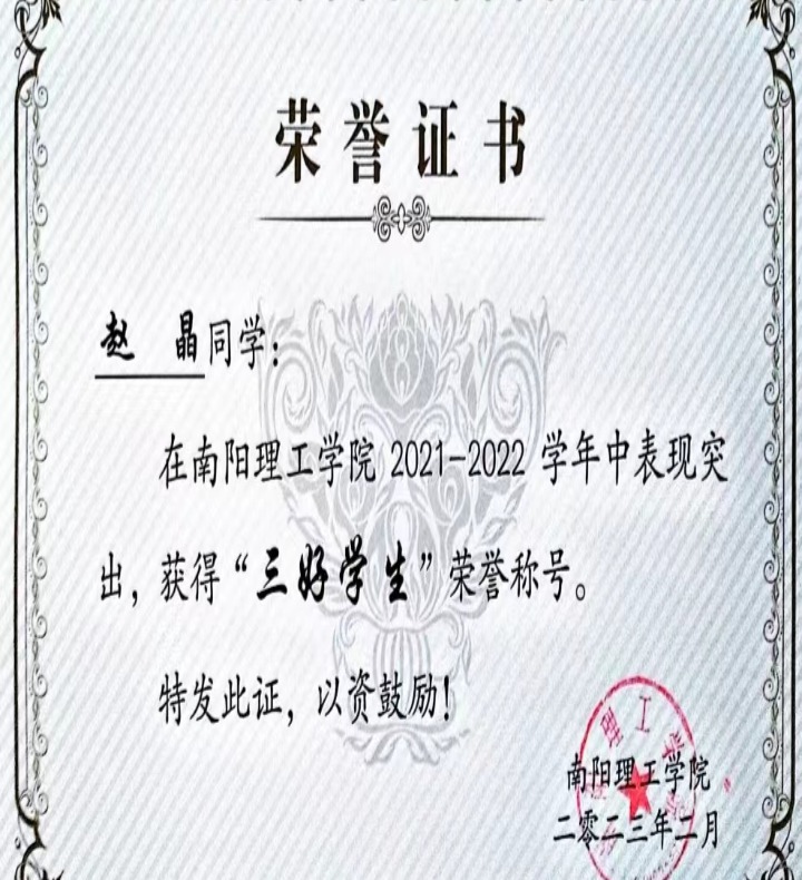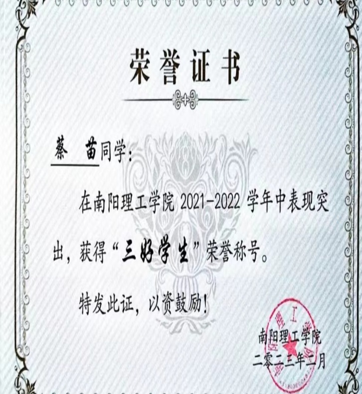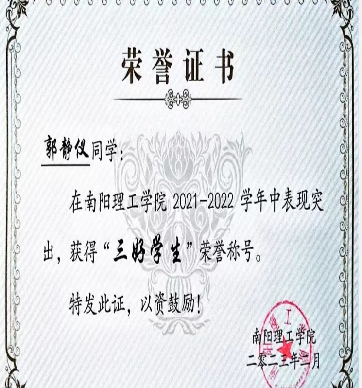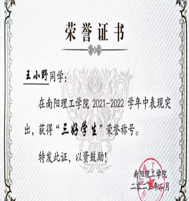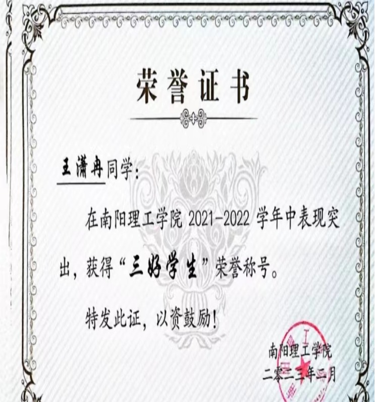 南阳理工学院2021-2022学年“三好学生”获奖证书