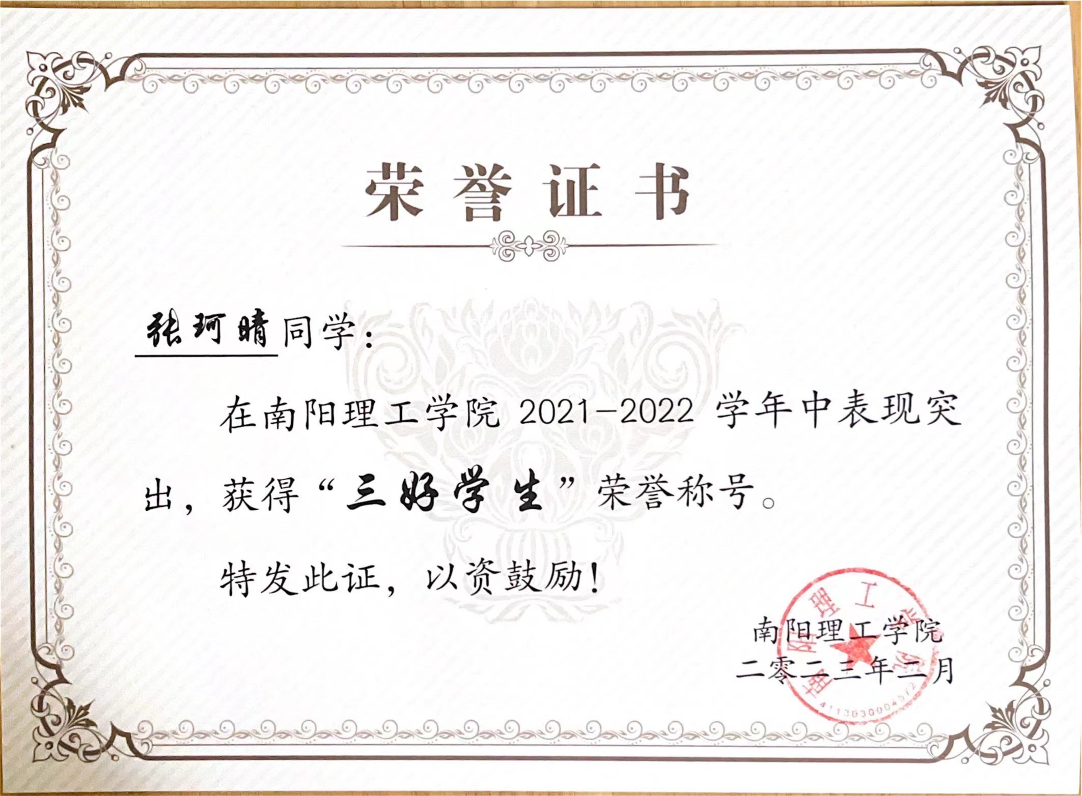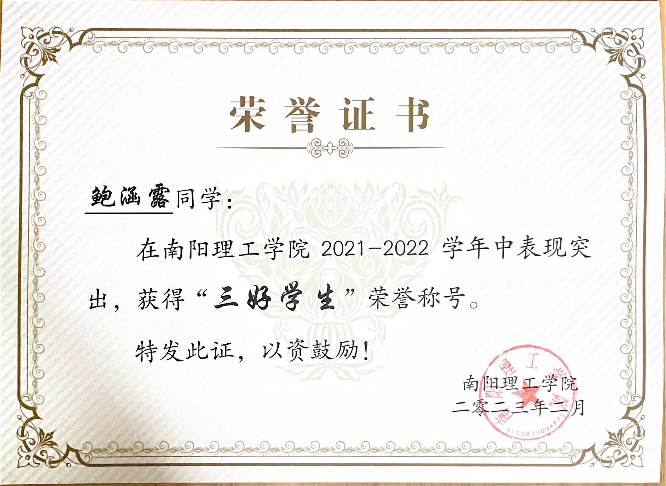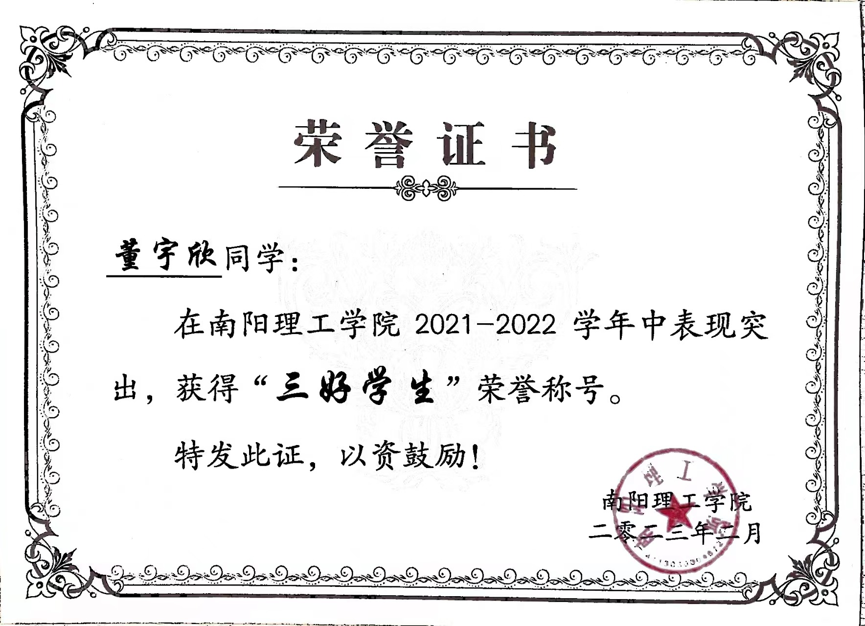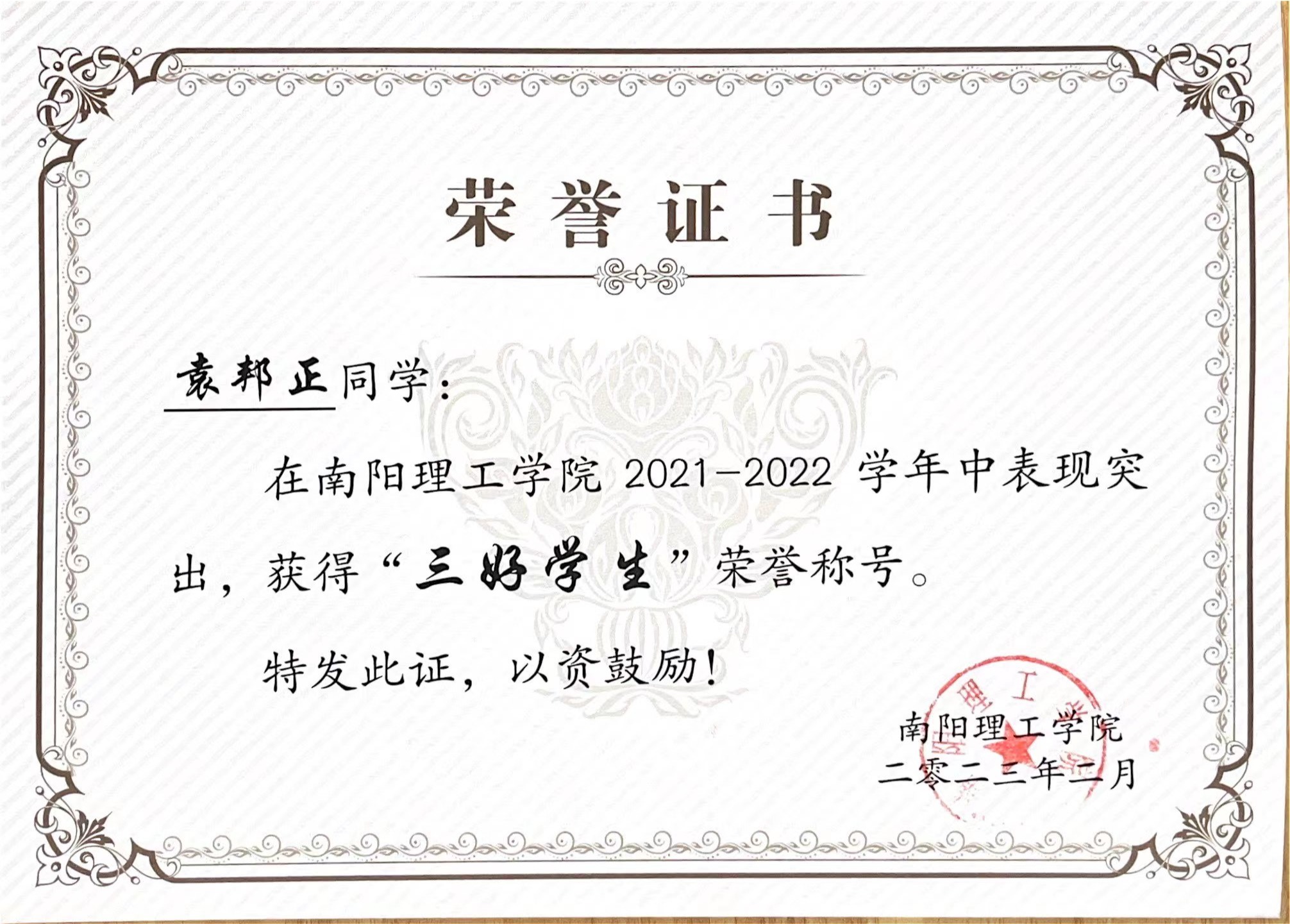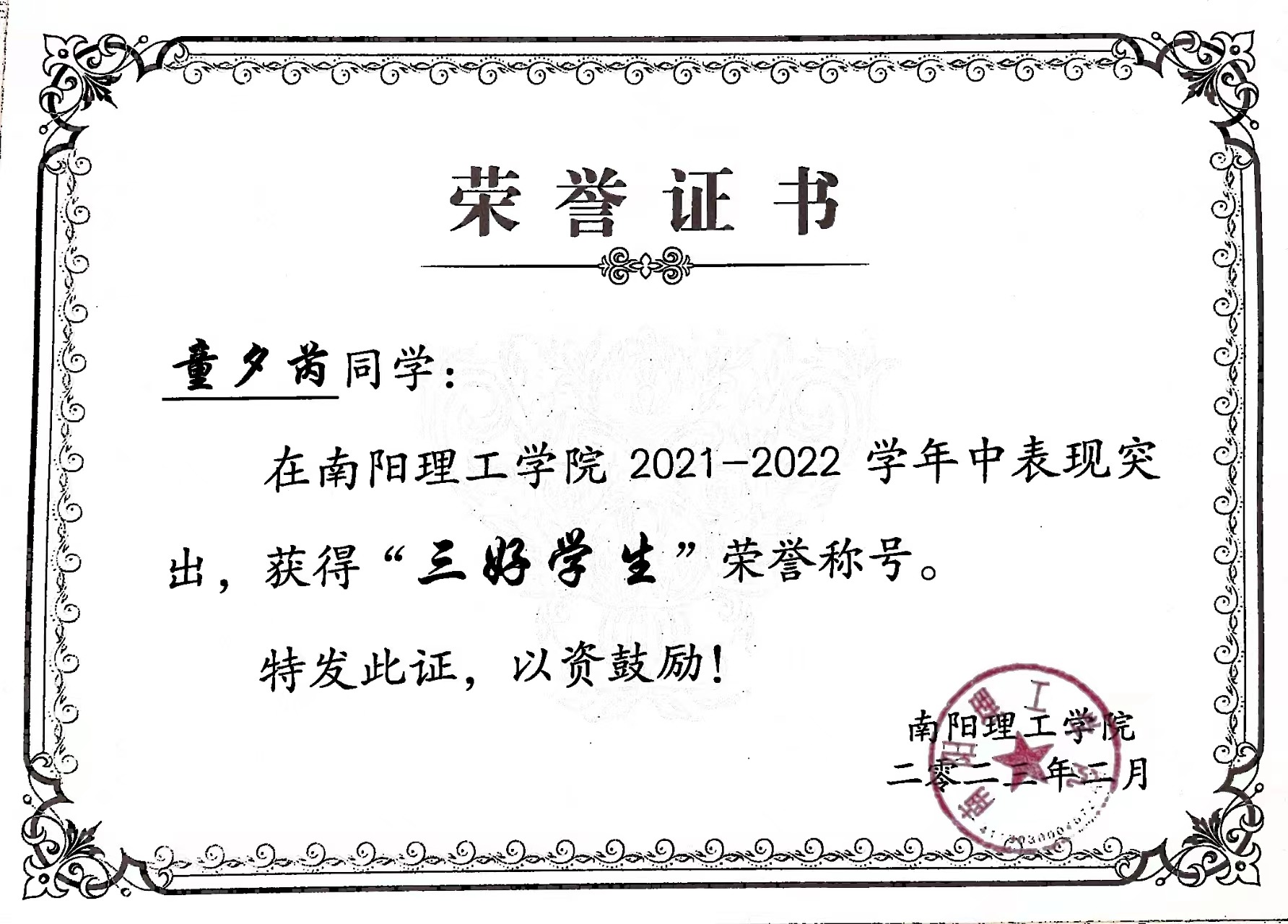 南阳理工学院2021-2022学年“三好学生”获奖证书