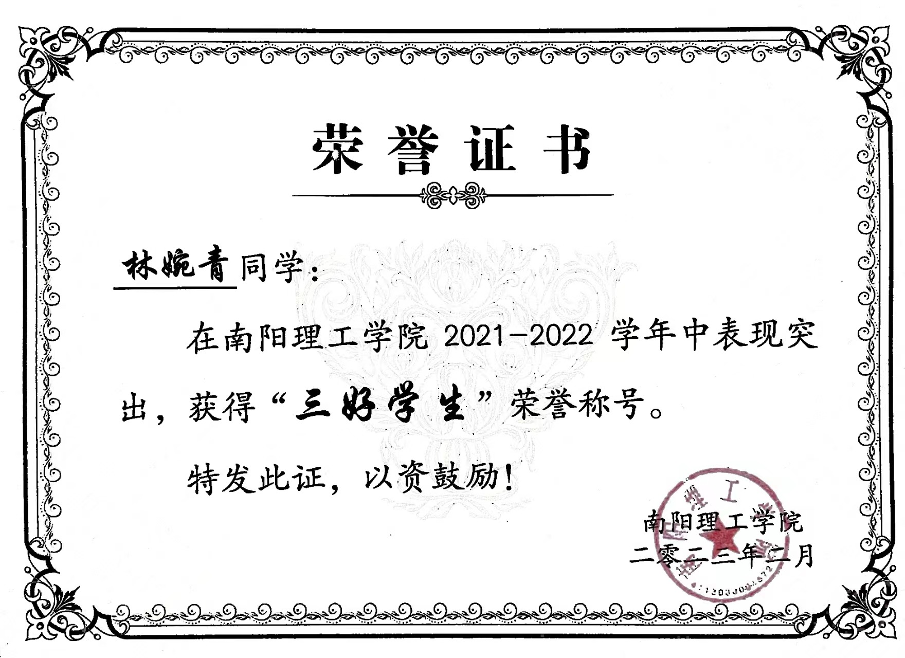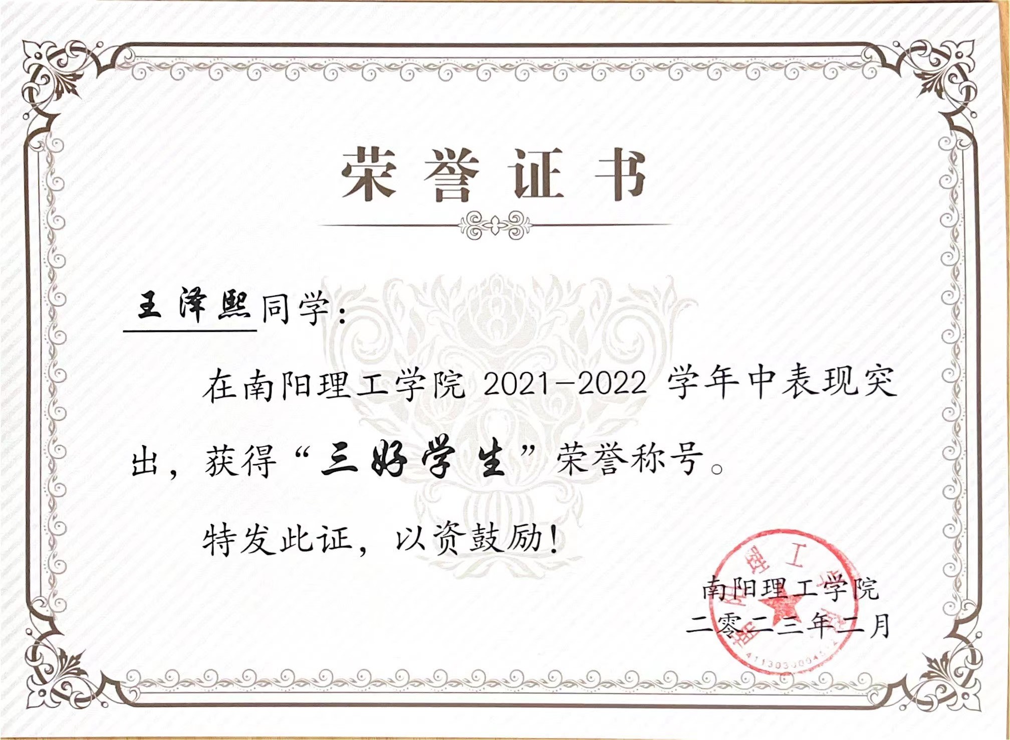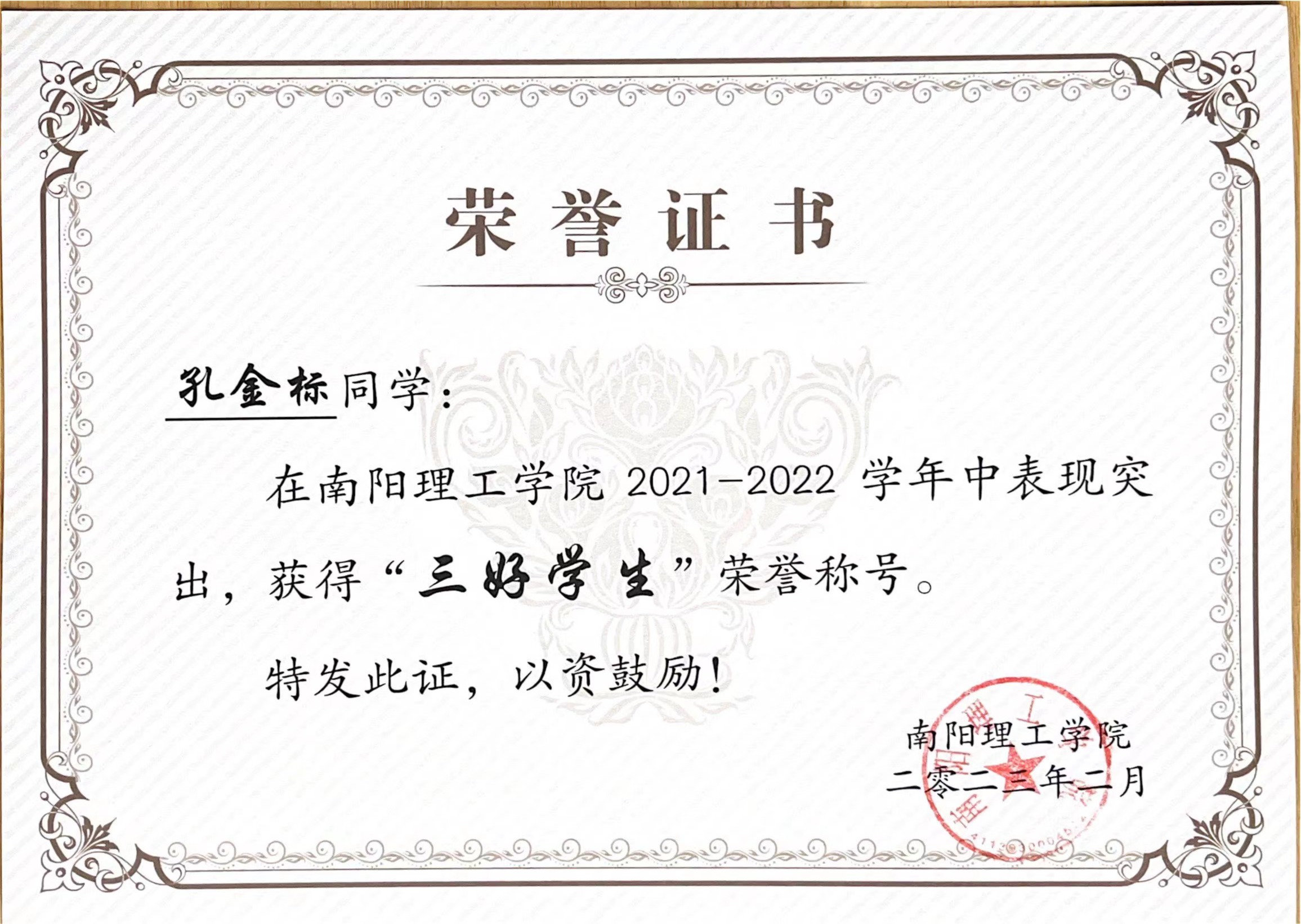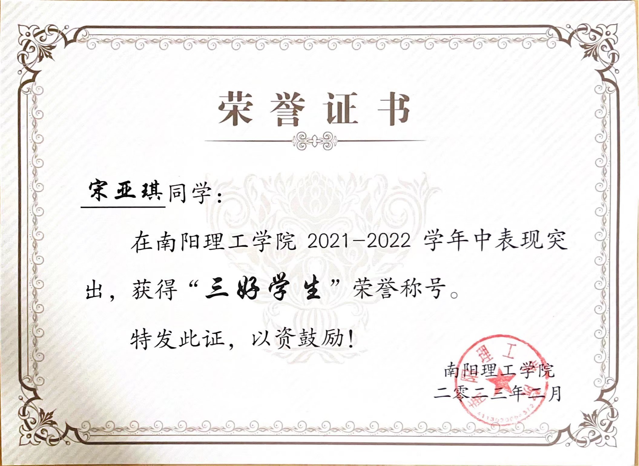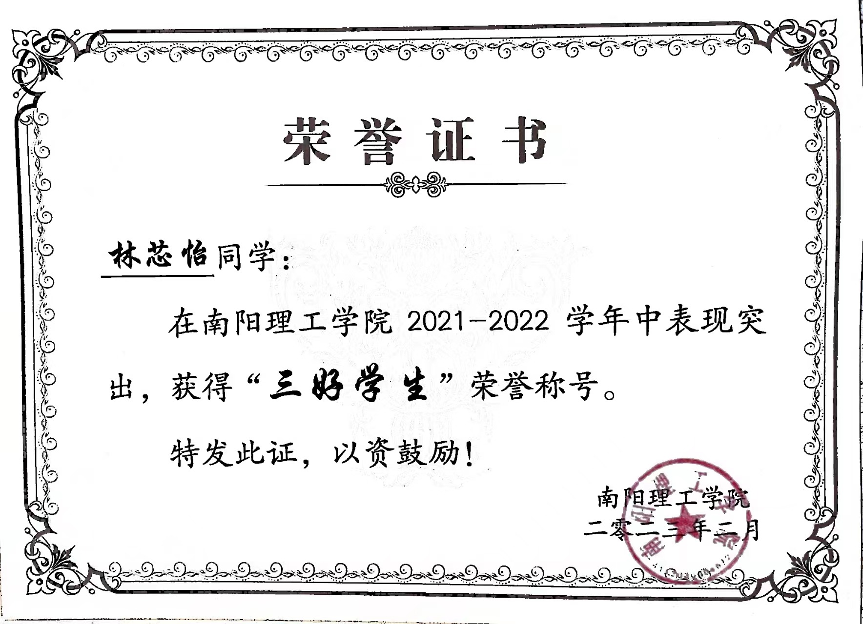 南阳理工学院2021-2022学年“三好学生”获奖证书