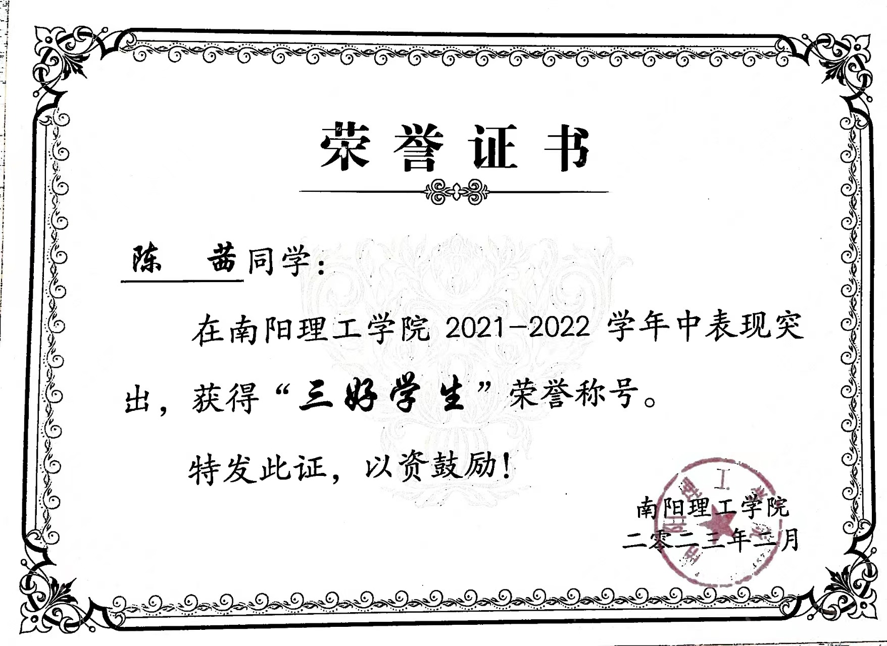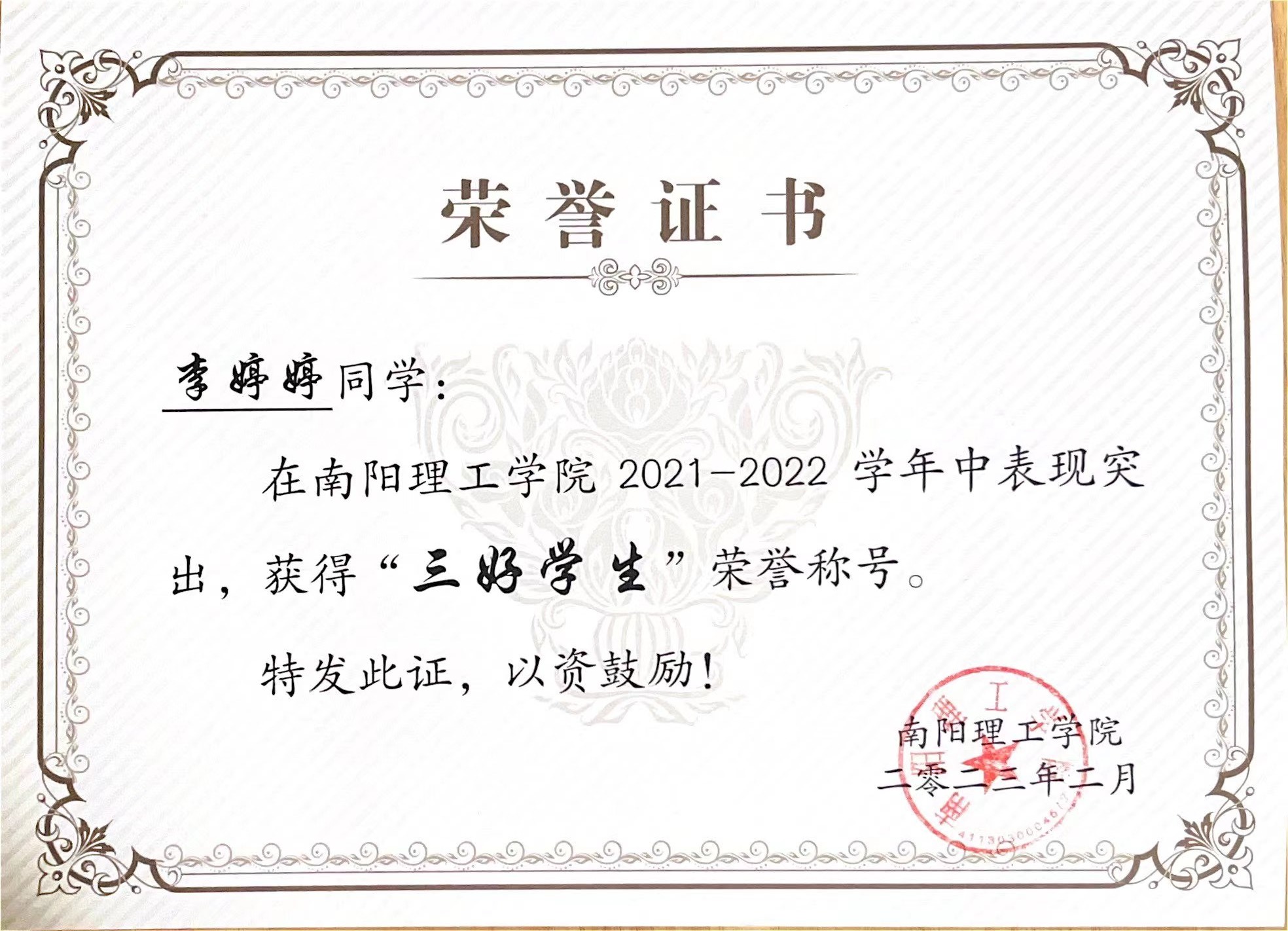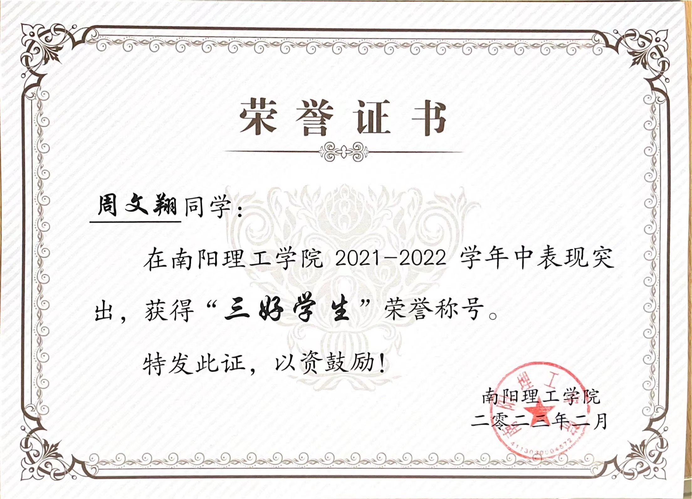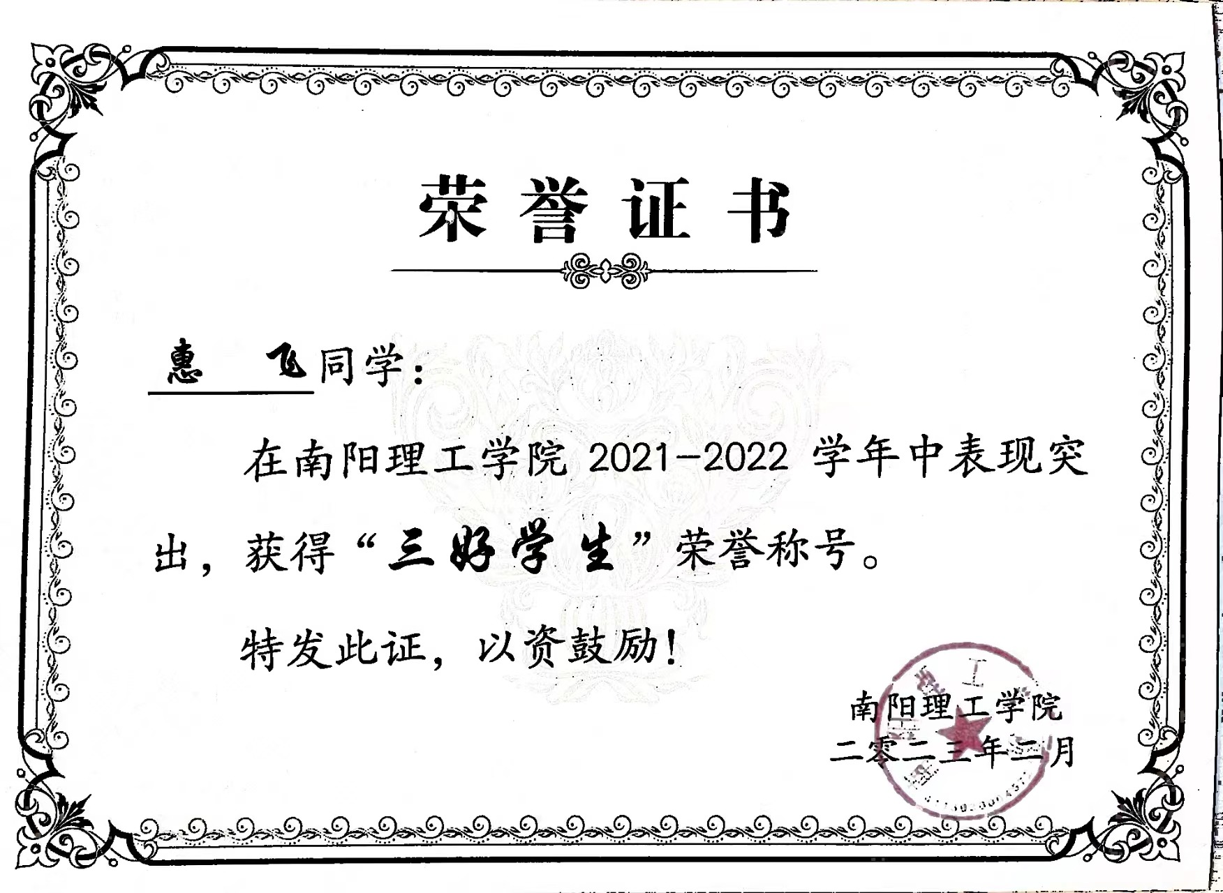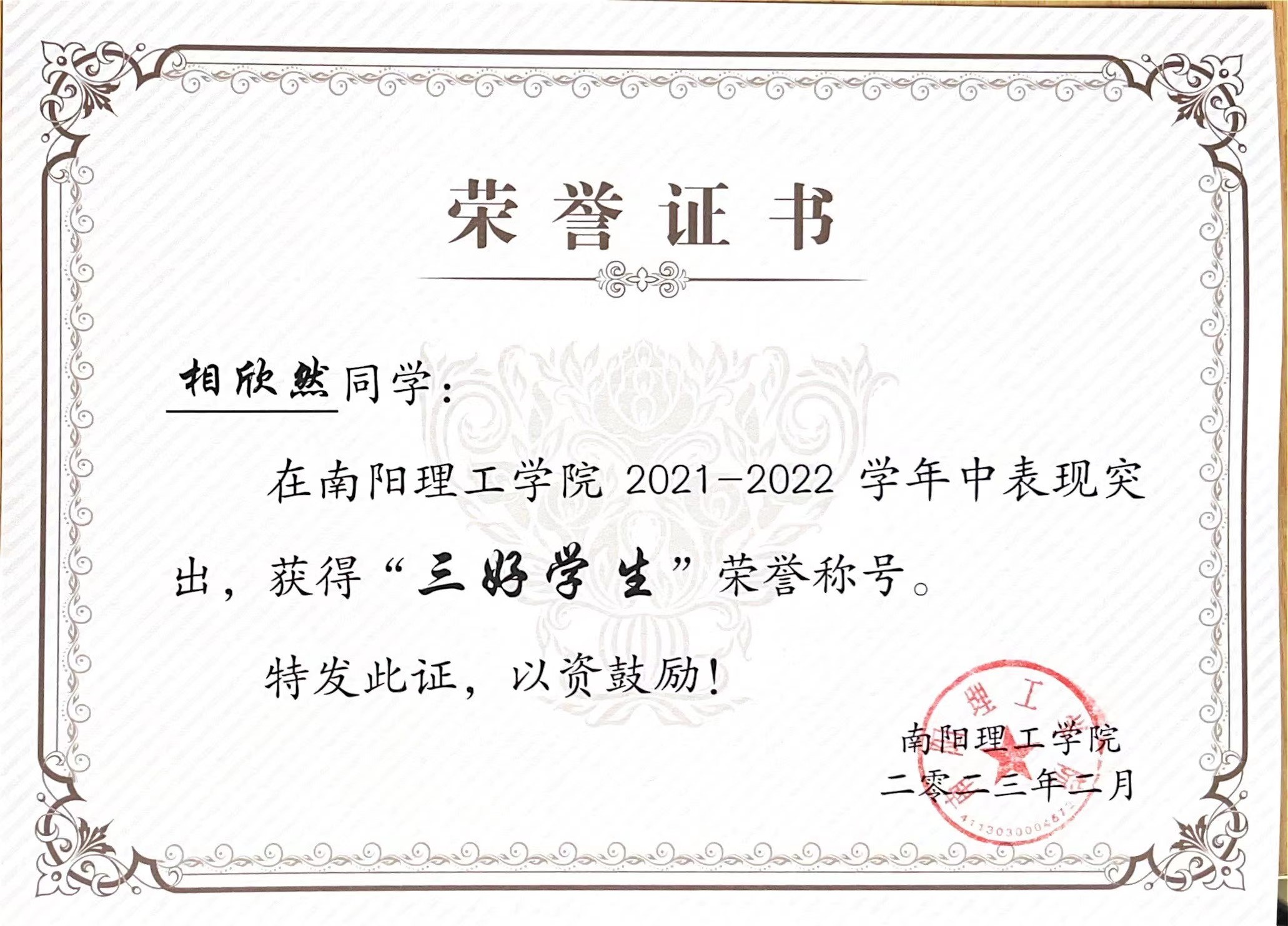 南阳理工学院2021-2022学年“三好学生”获奖证书