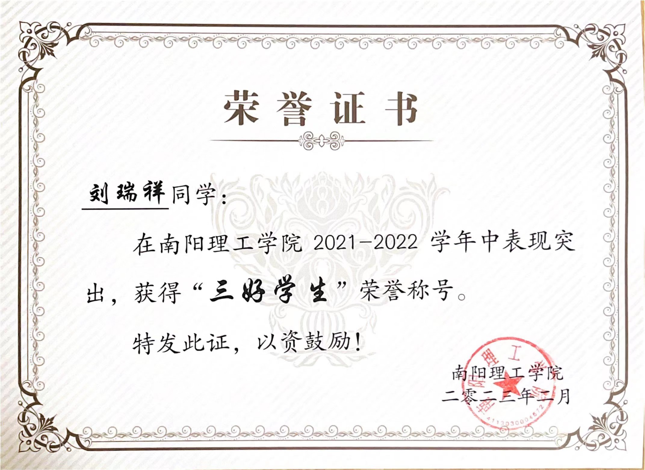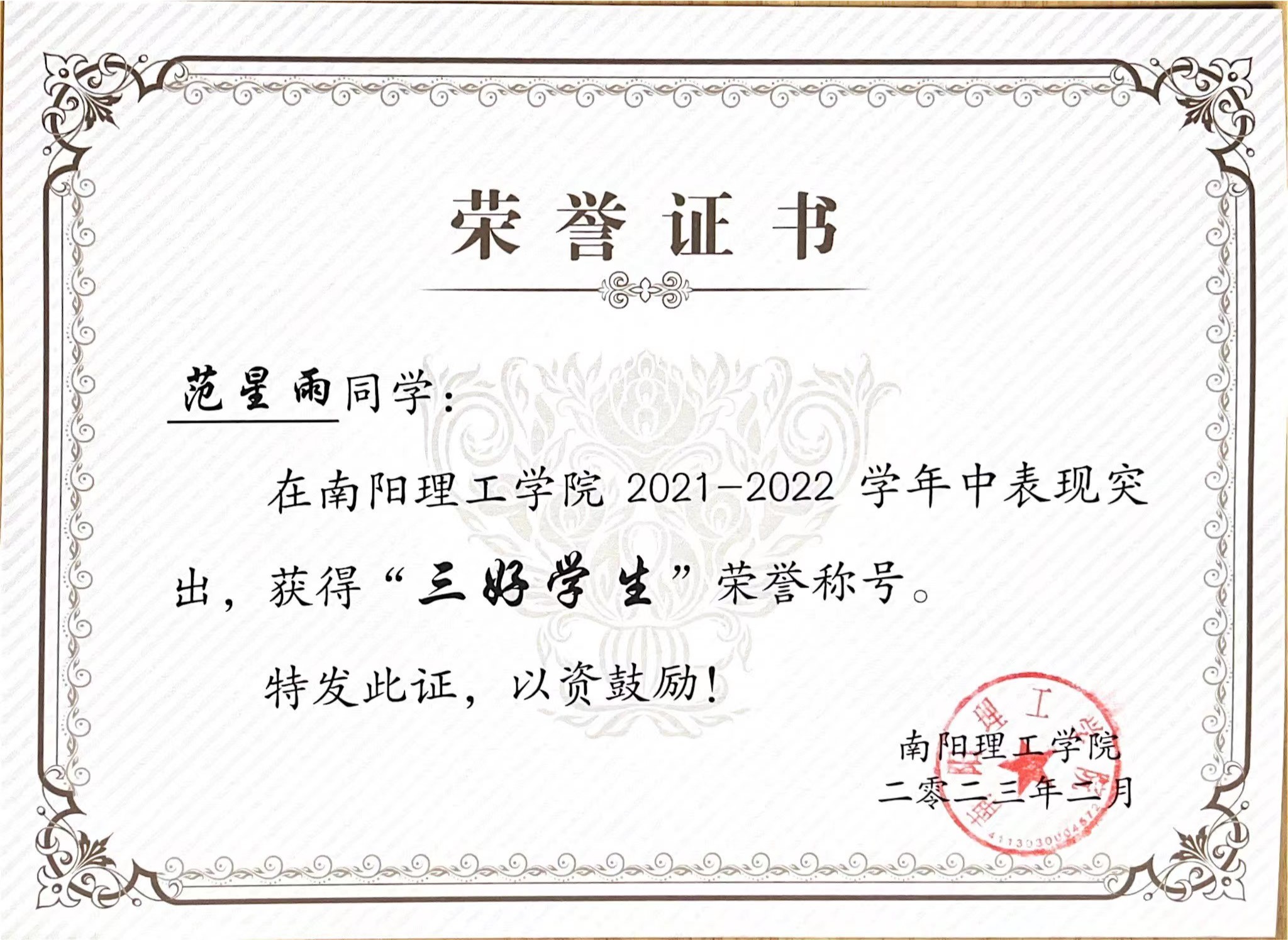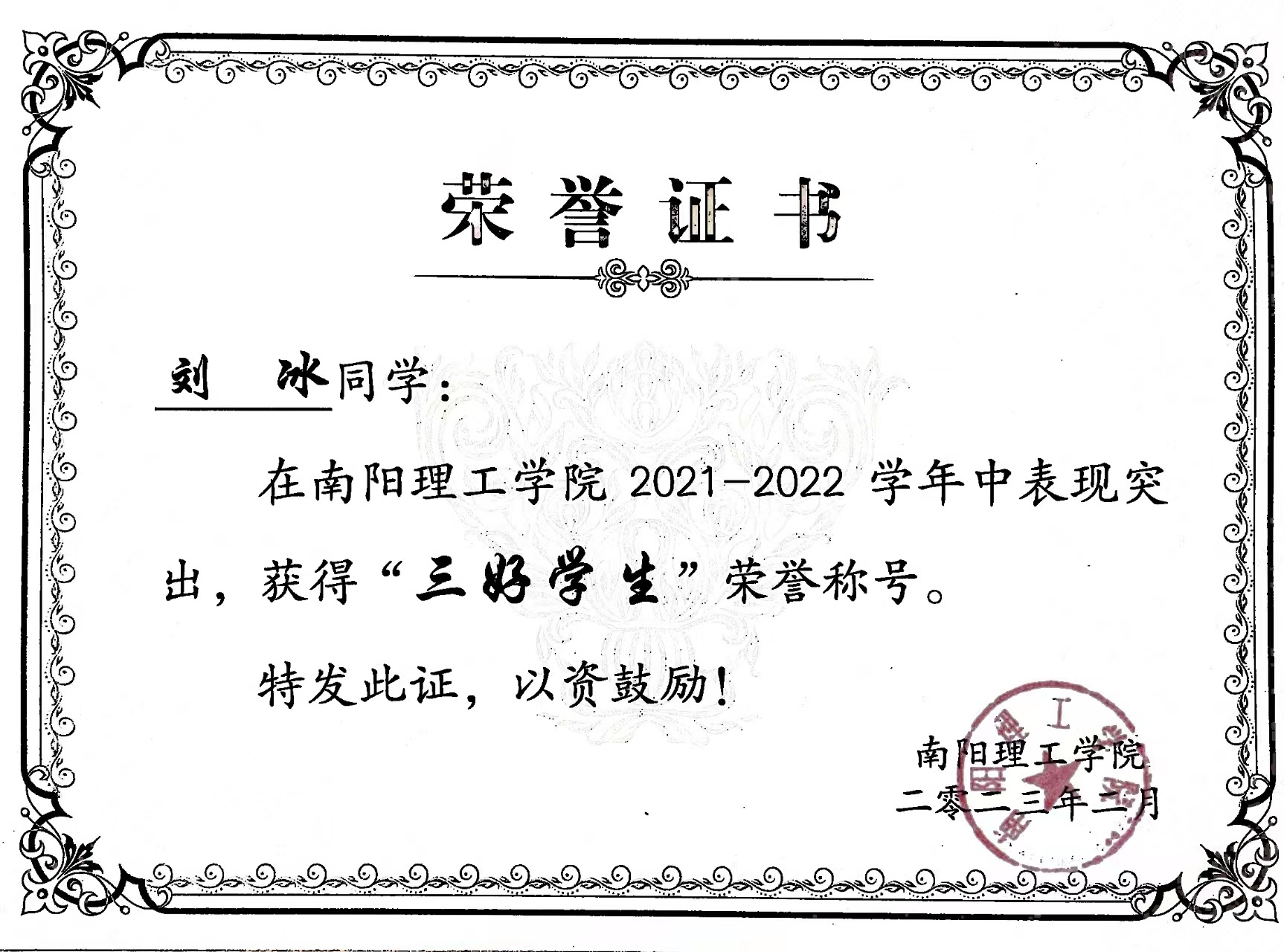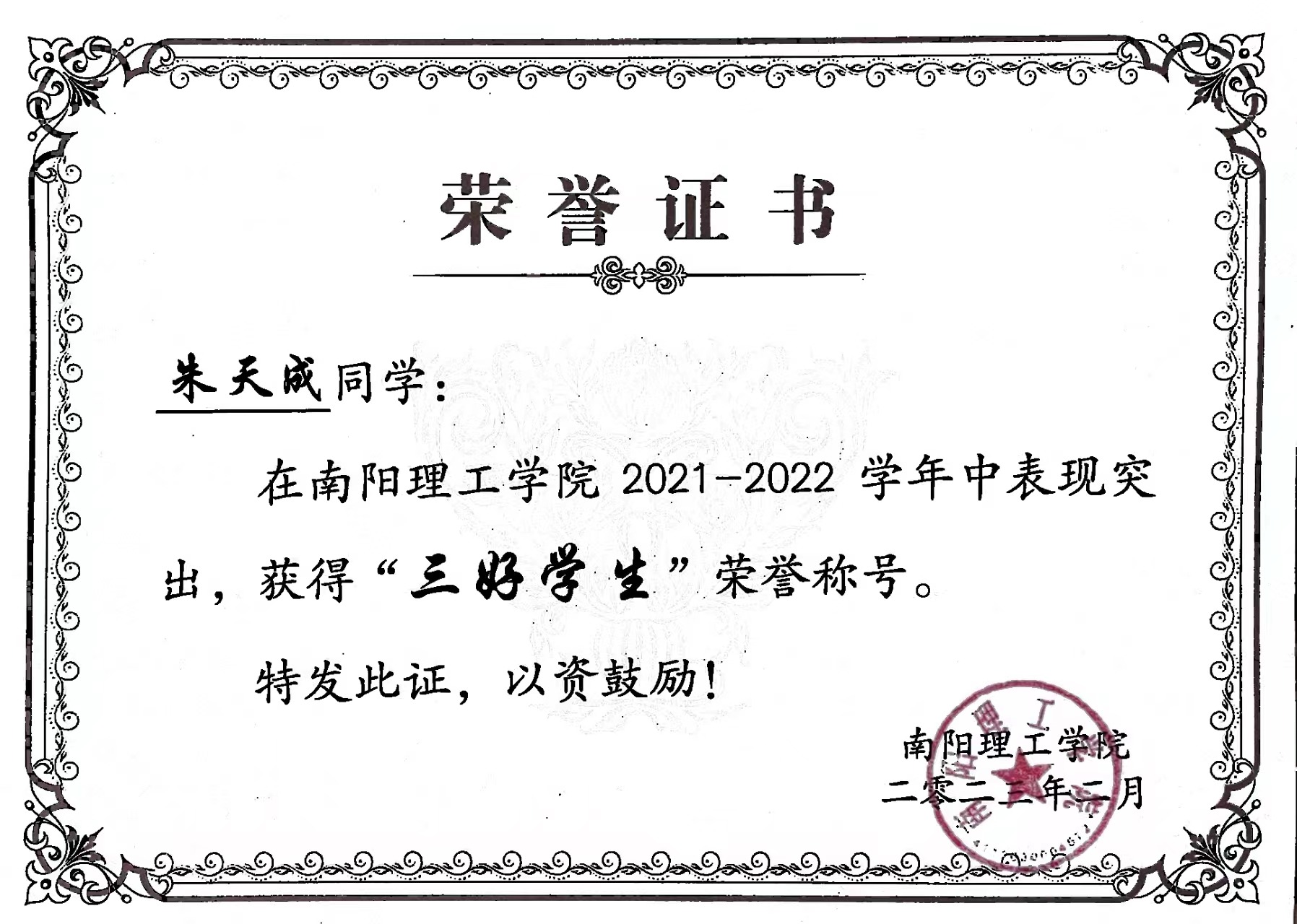 南阳理工学院2021-2022学年“三好学生”获奖证书