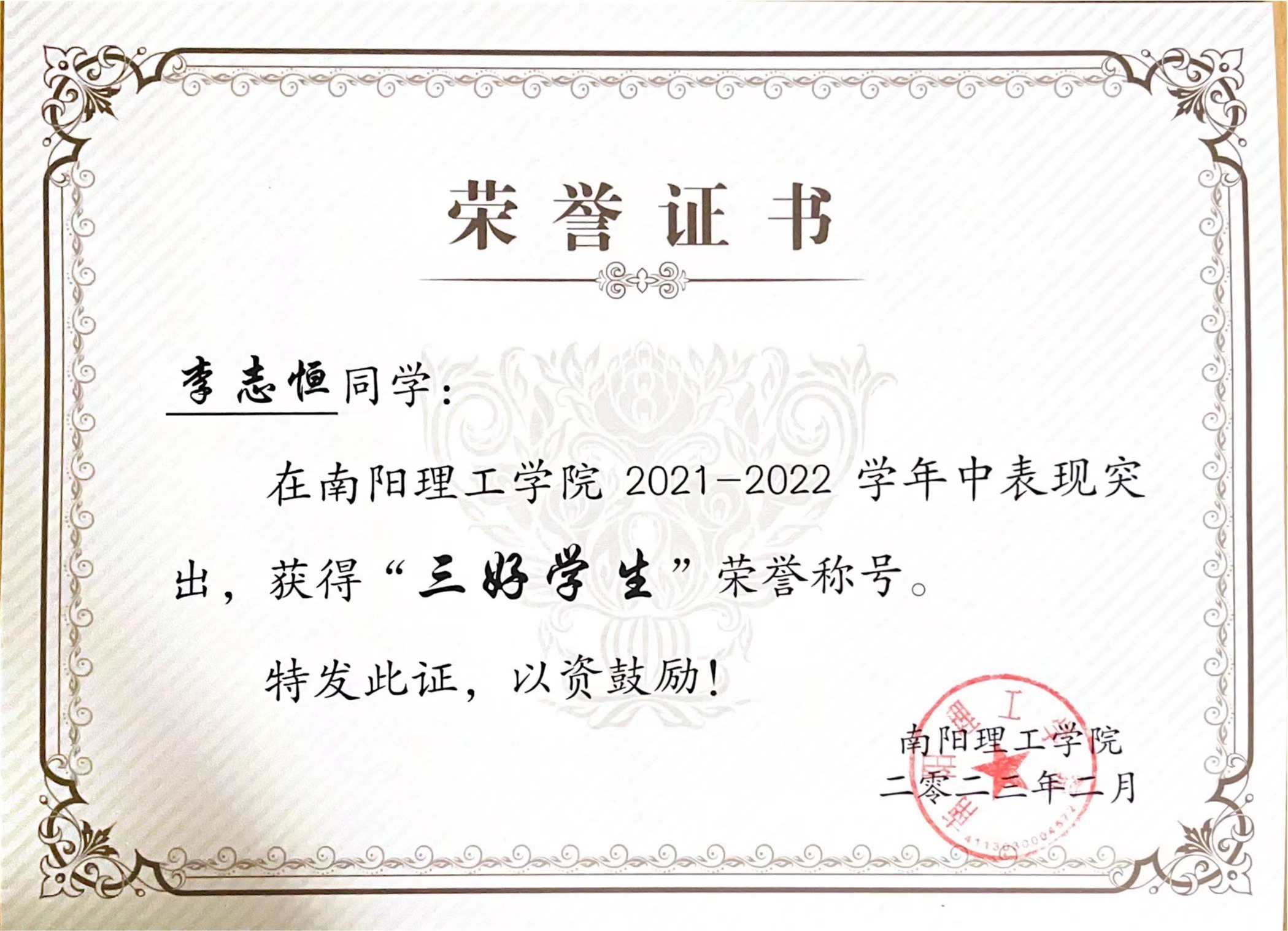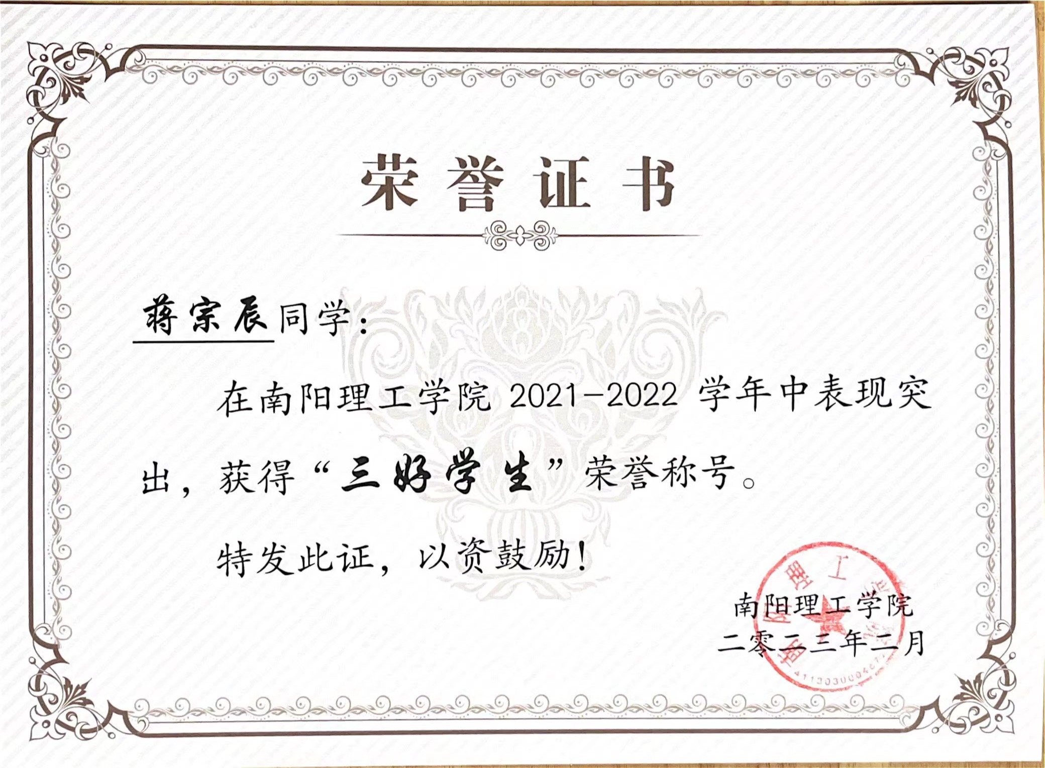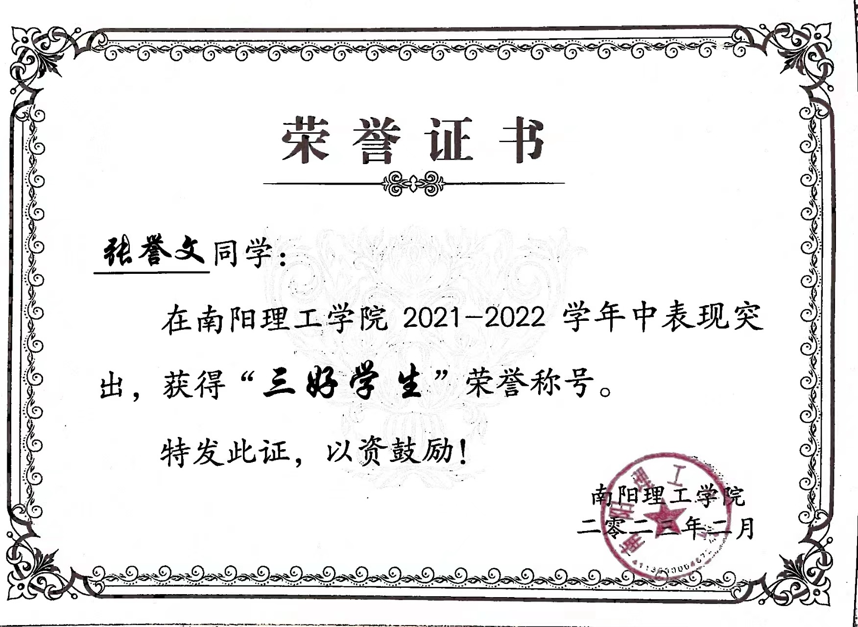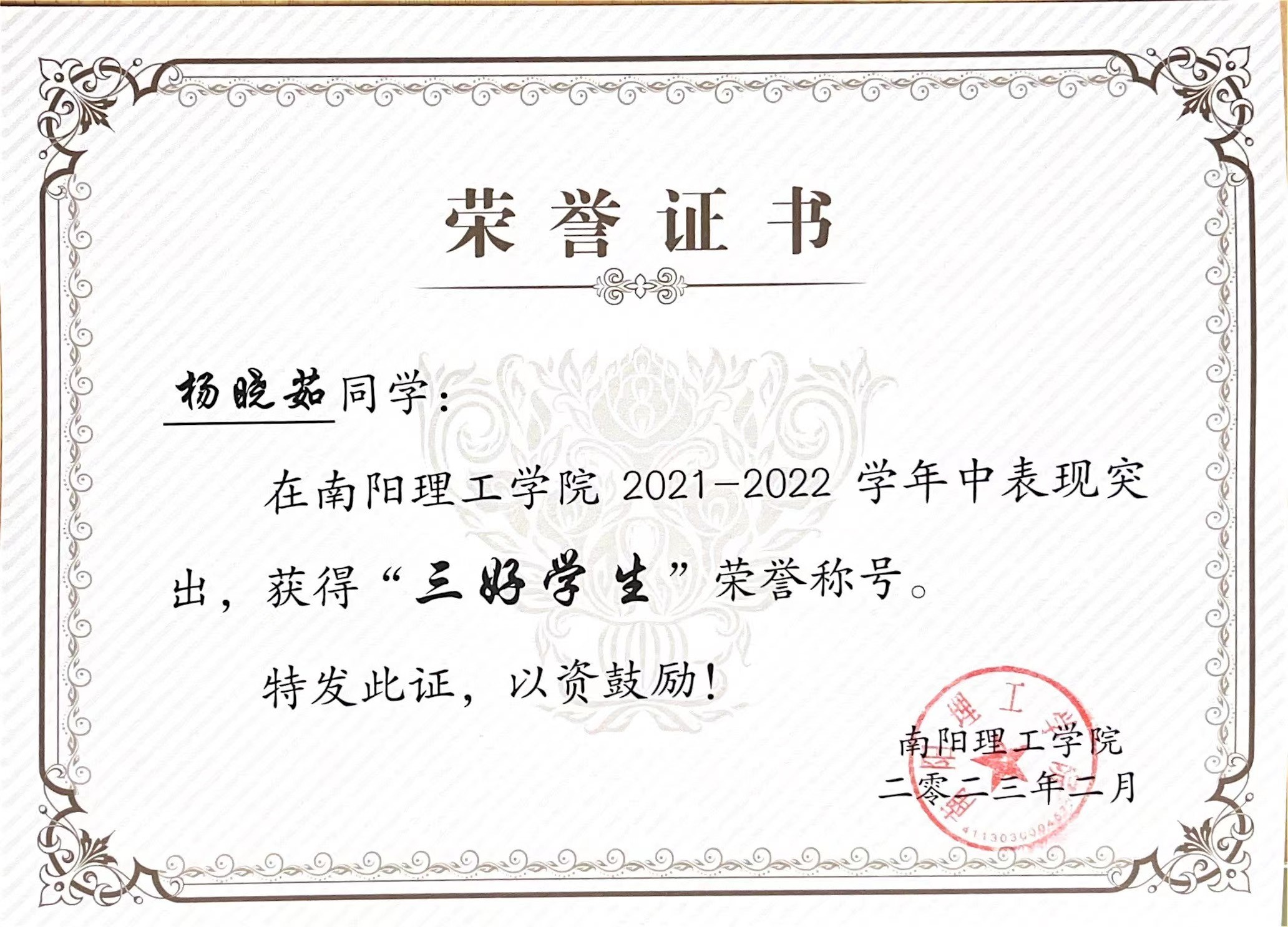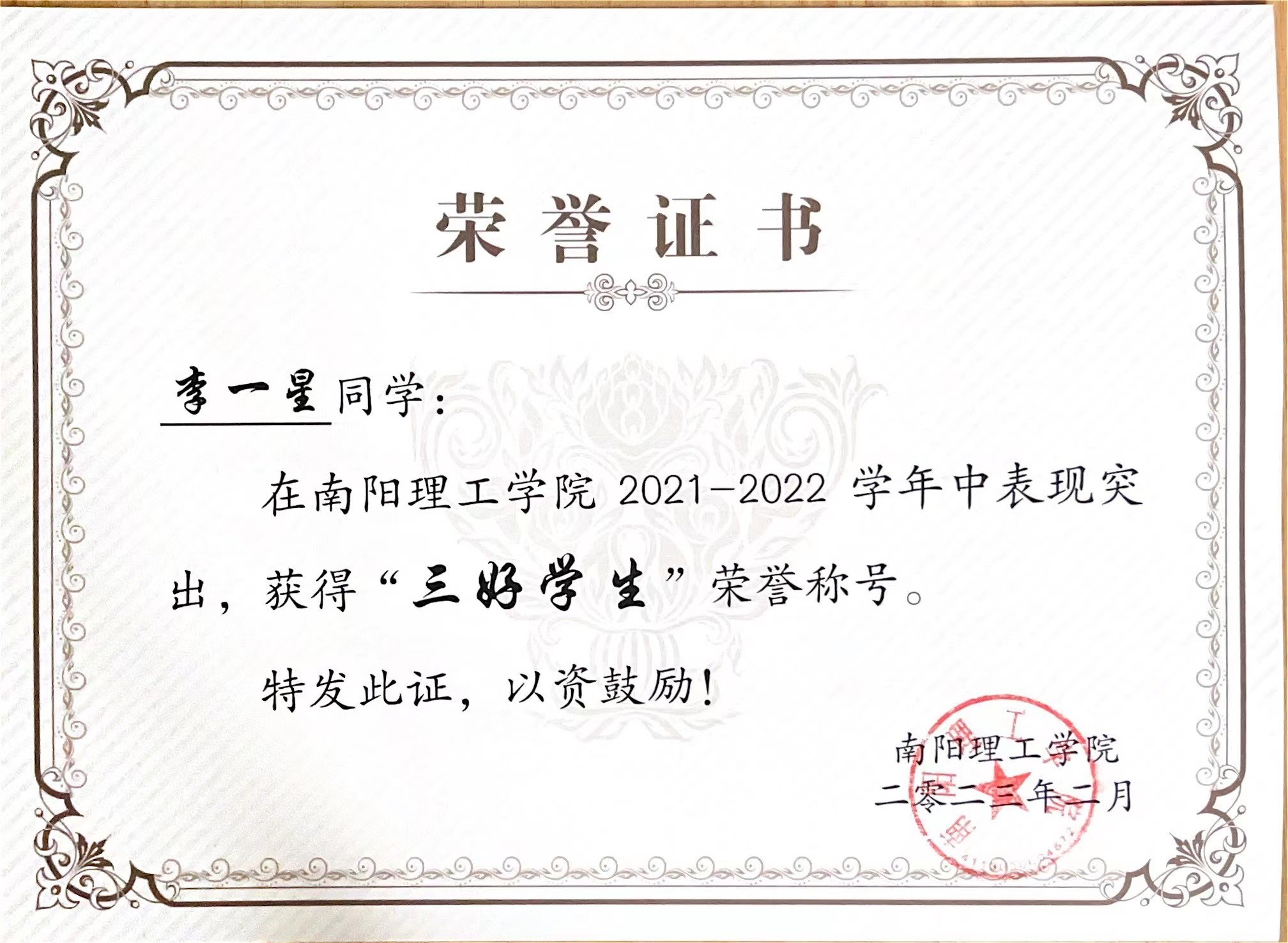 南阳理工学院2021-2022学年“三好学生”获奖证书