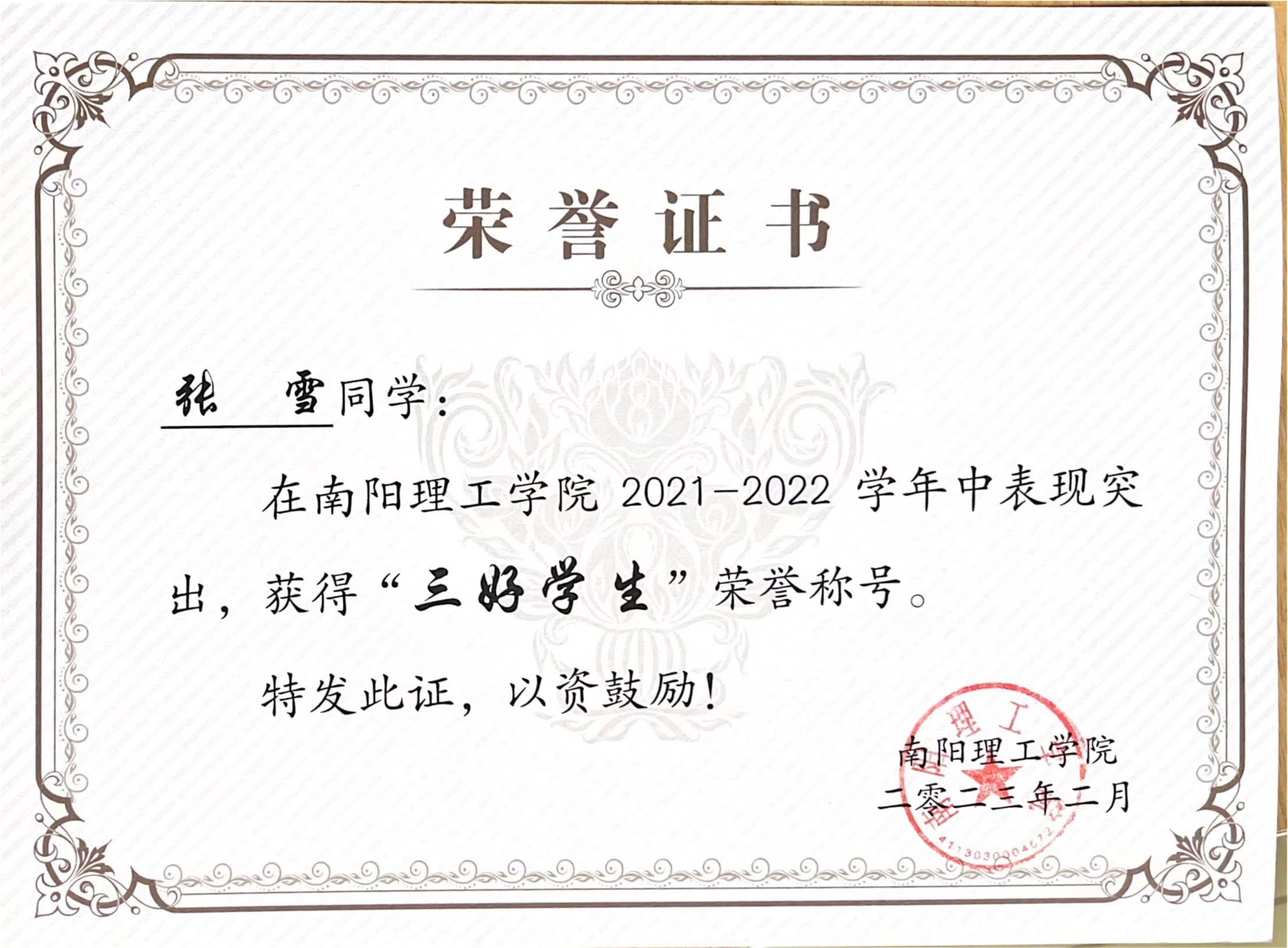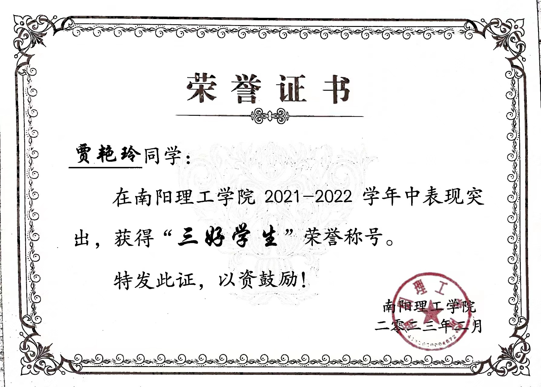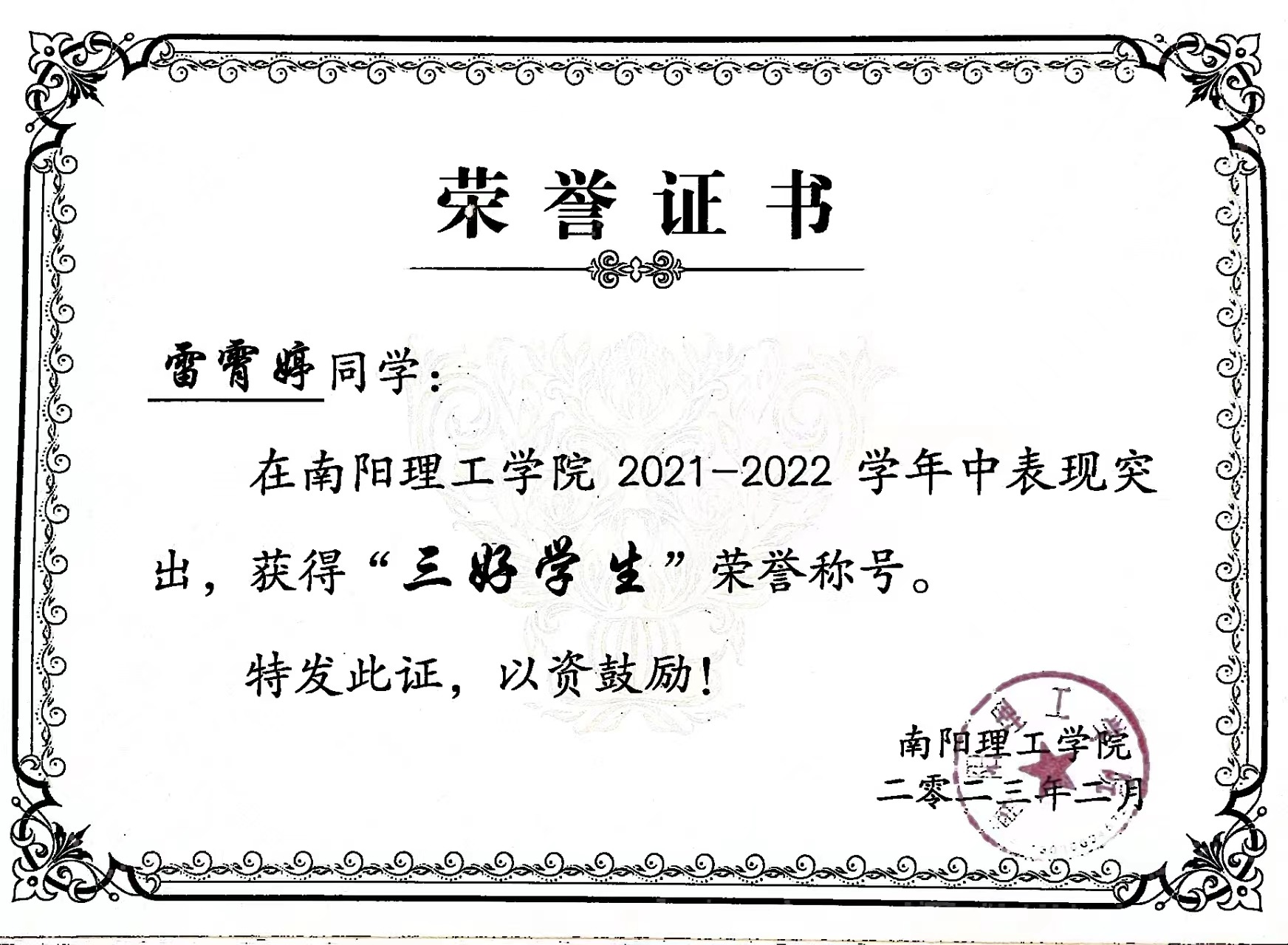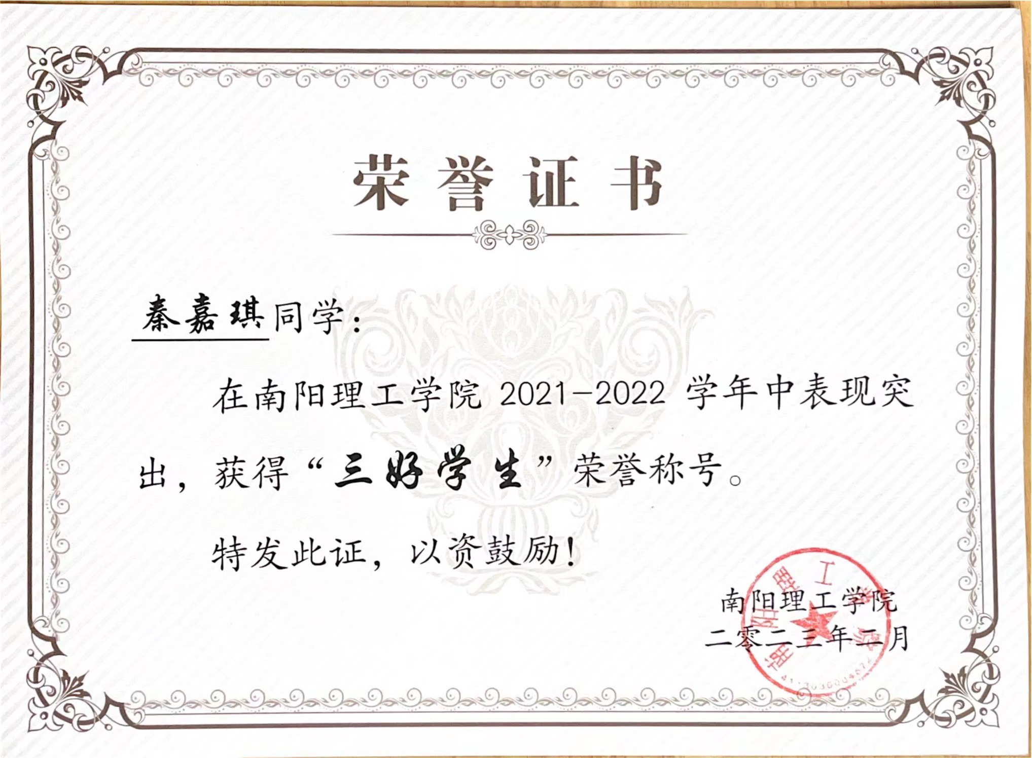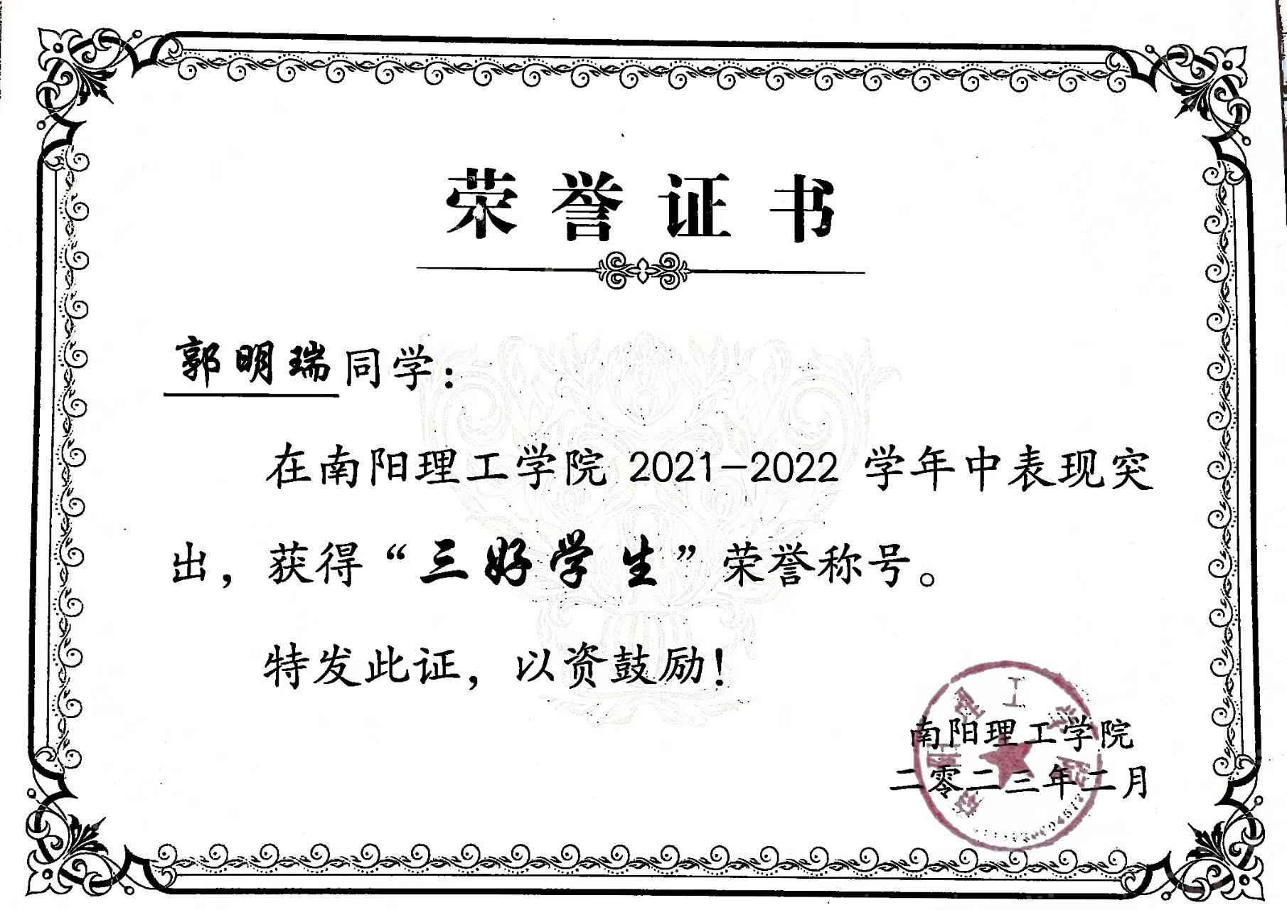 南阳理工学院2021-2022学年“三好学生”获奖证书