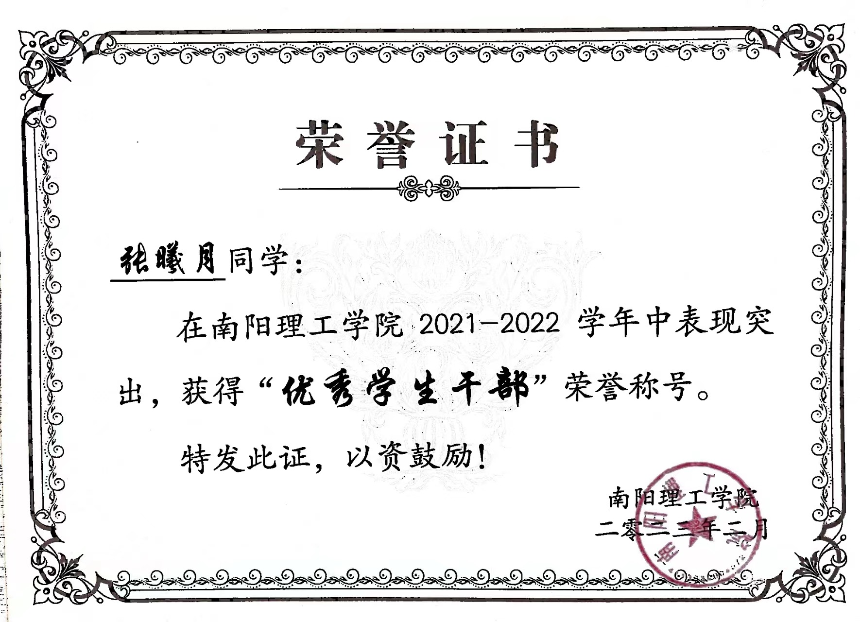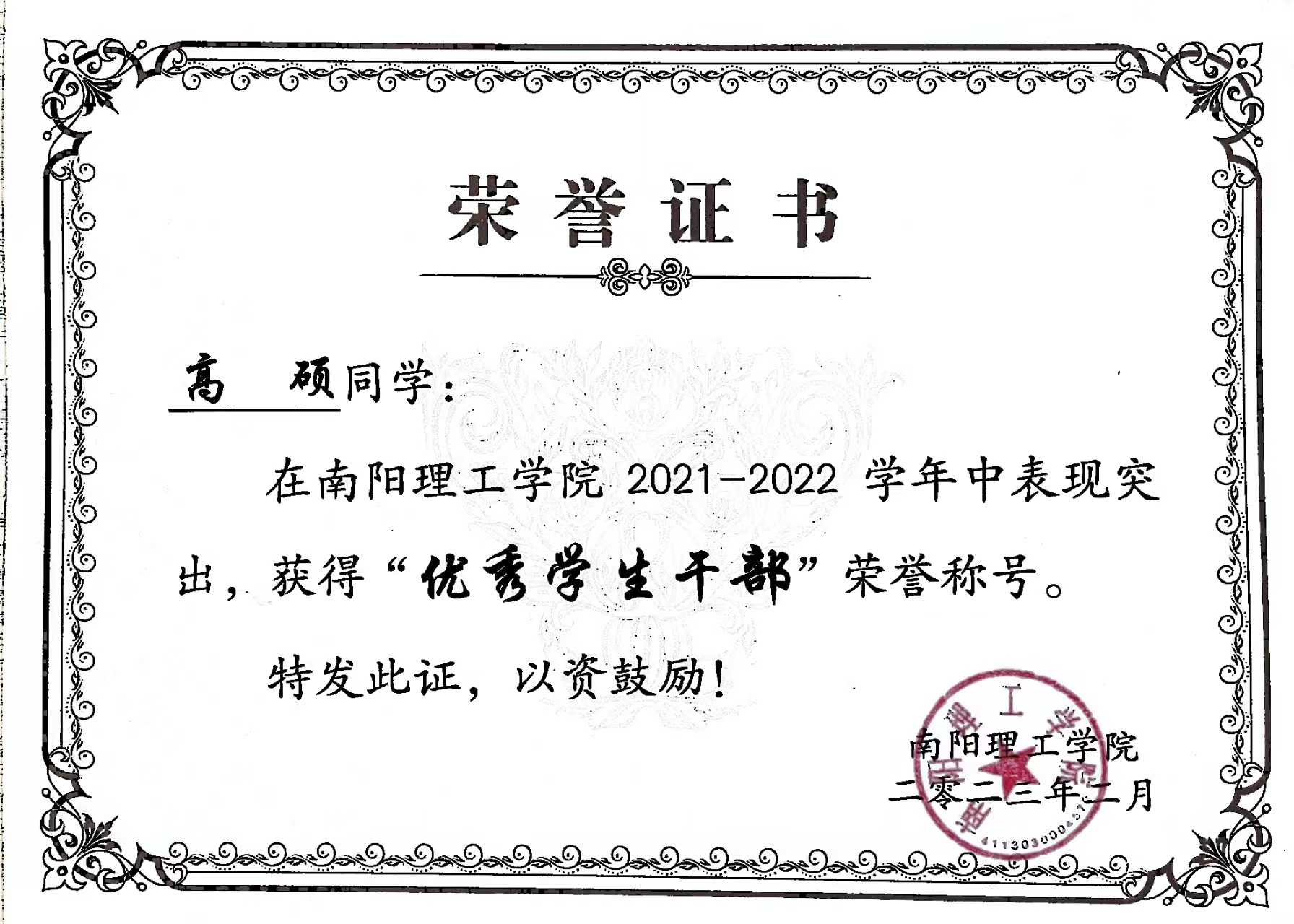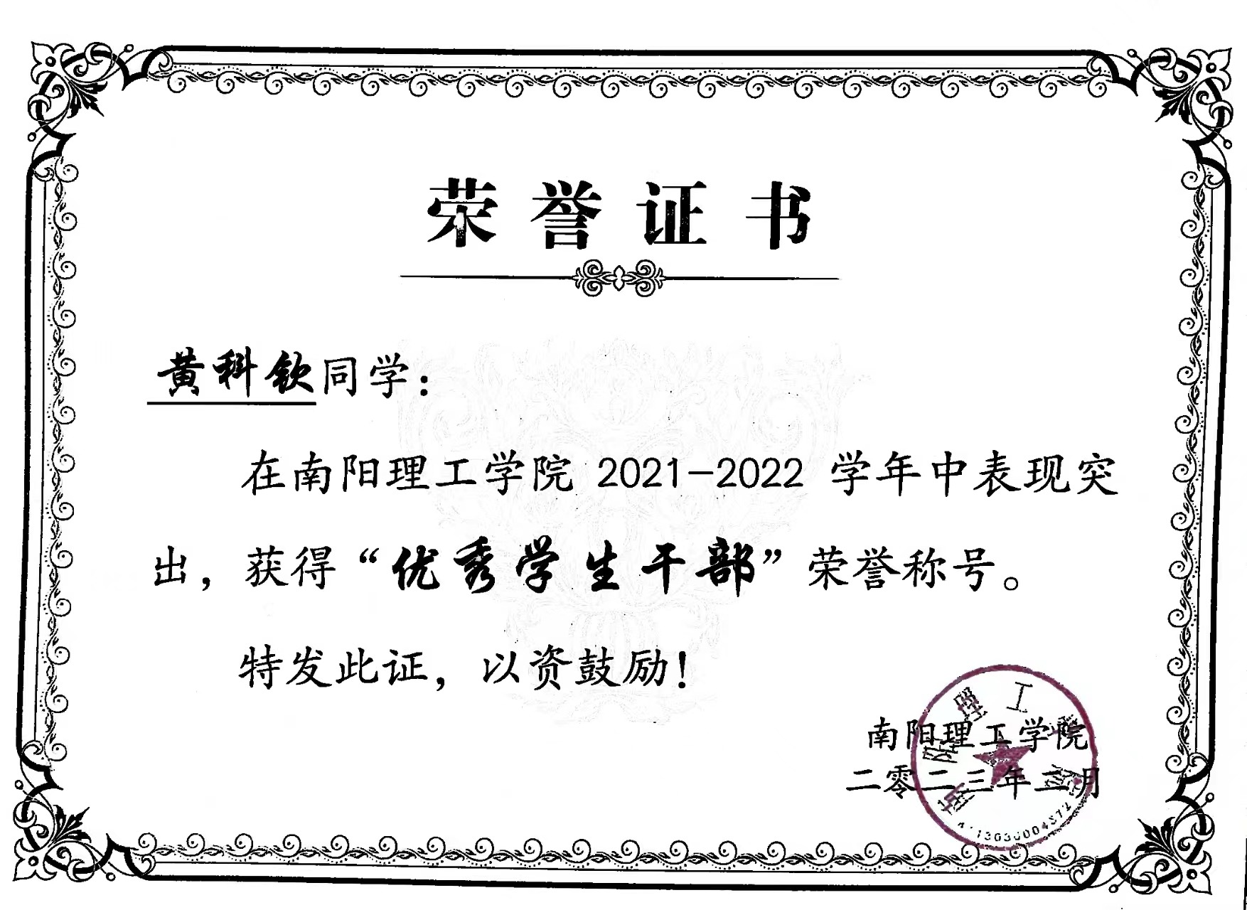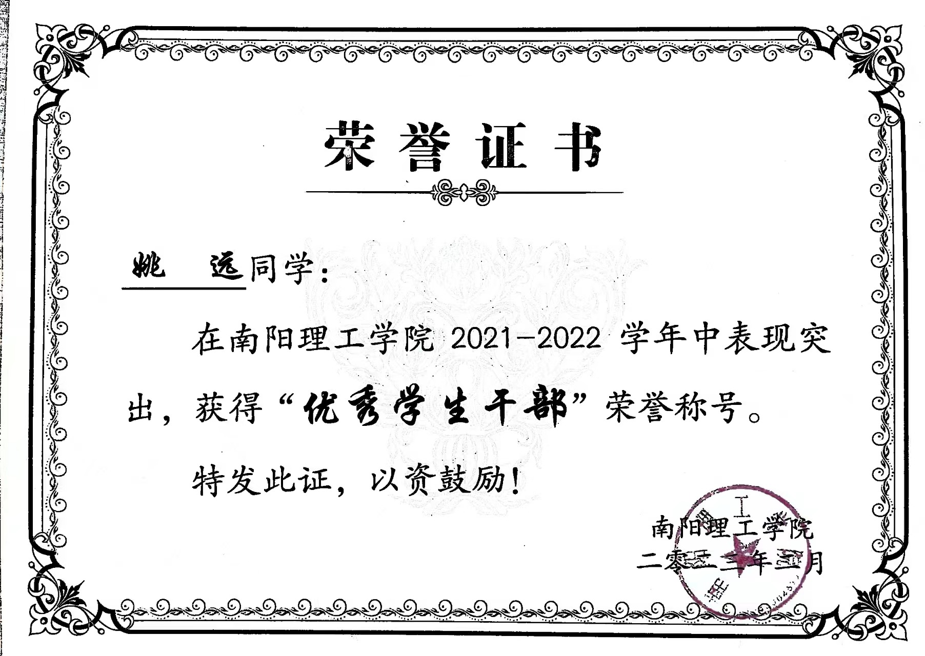 南阳理工学院2021-2022学年“优秀学生干部”获奖证书