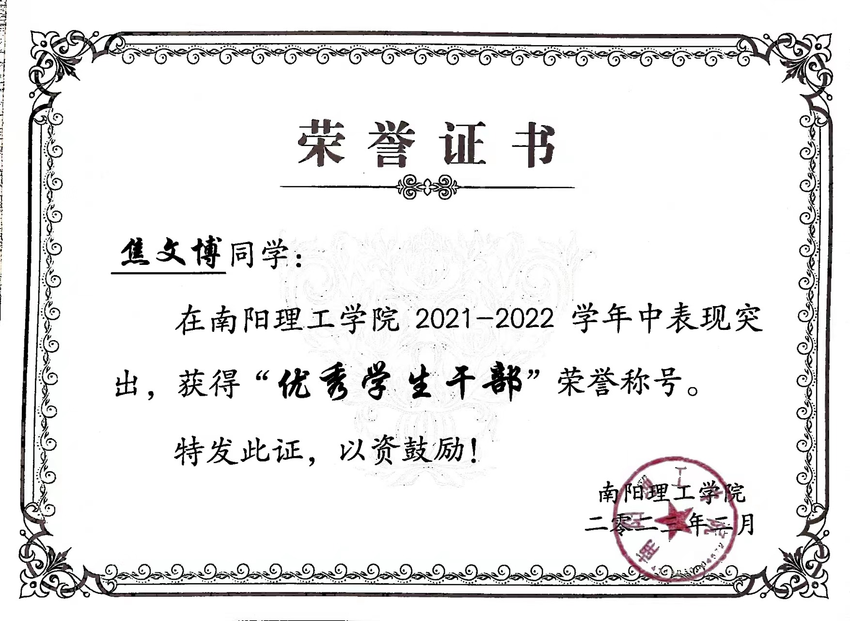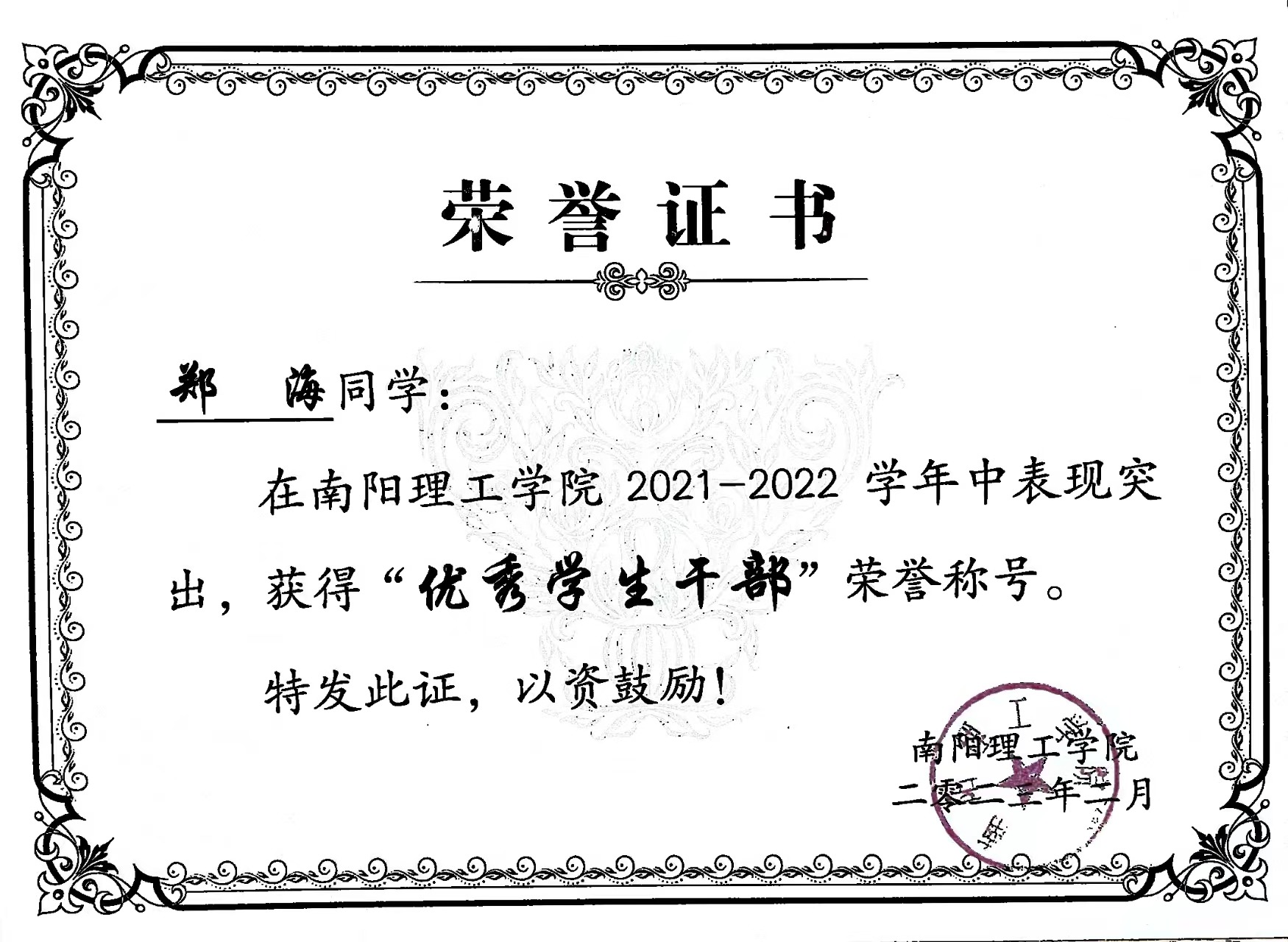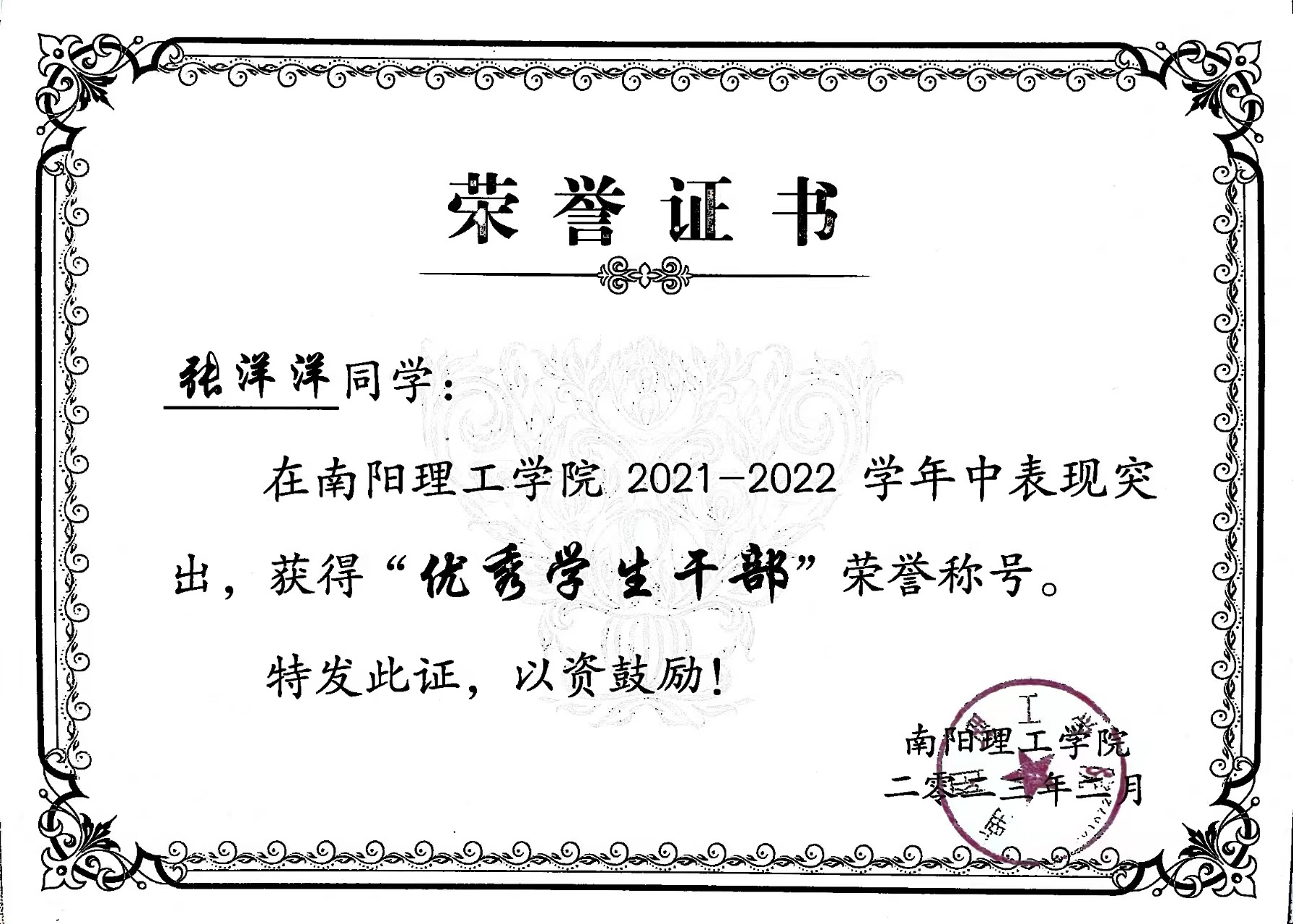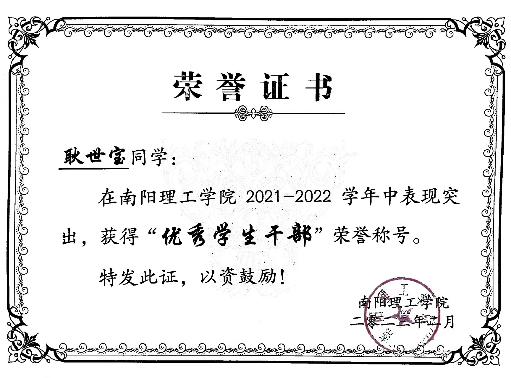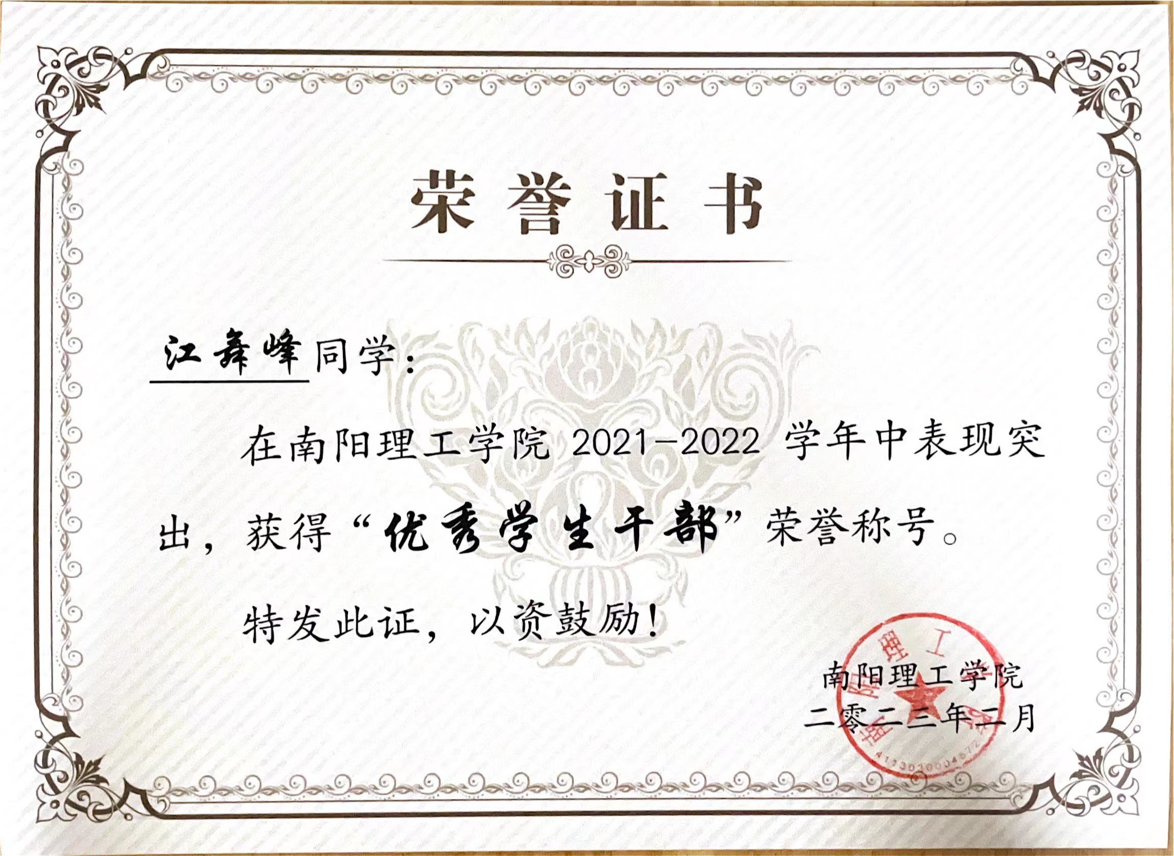 南阳理工学院2021-2022学年“优秀学生干部”获奖证书