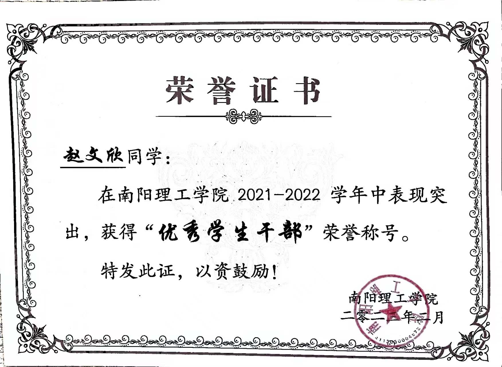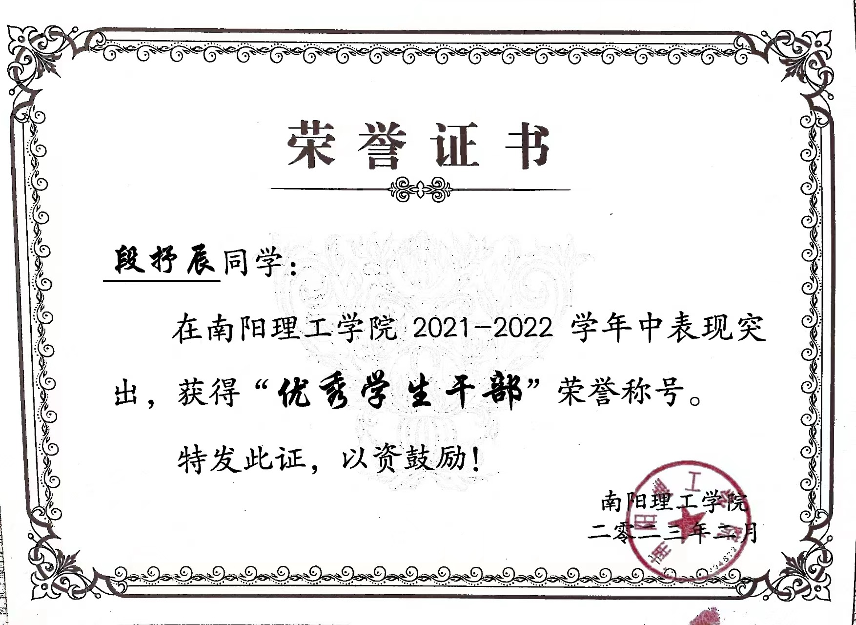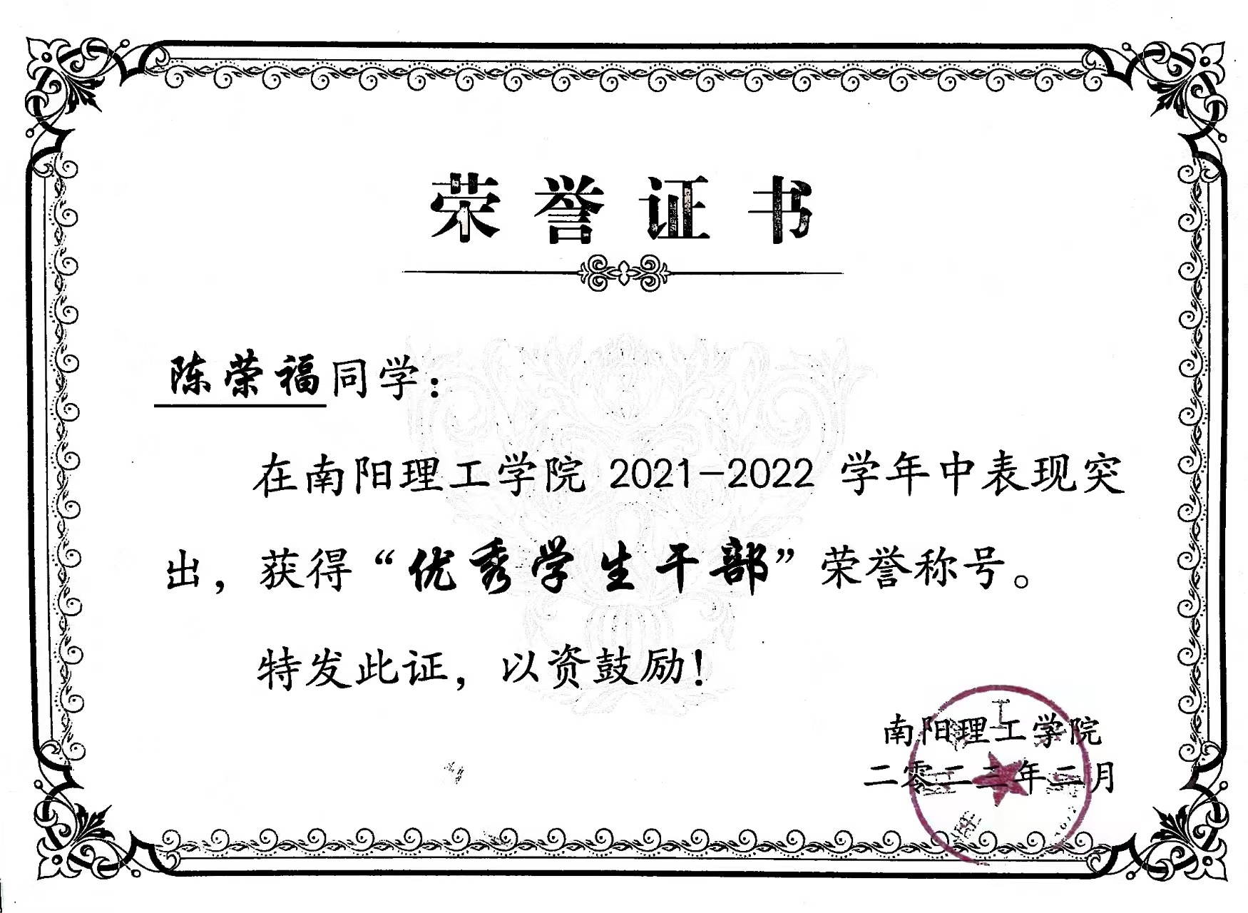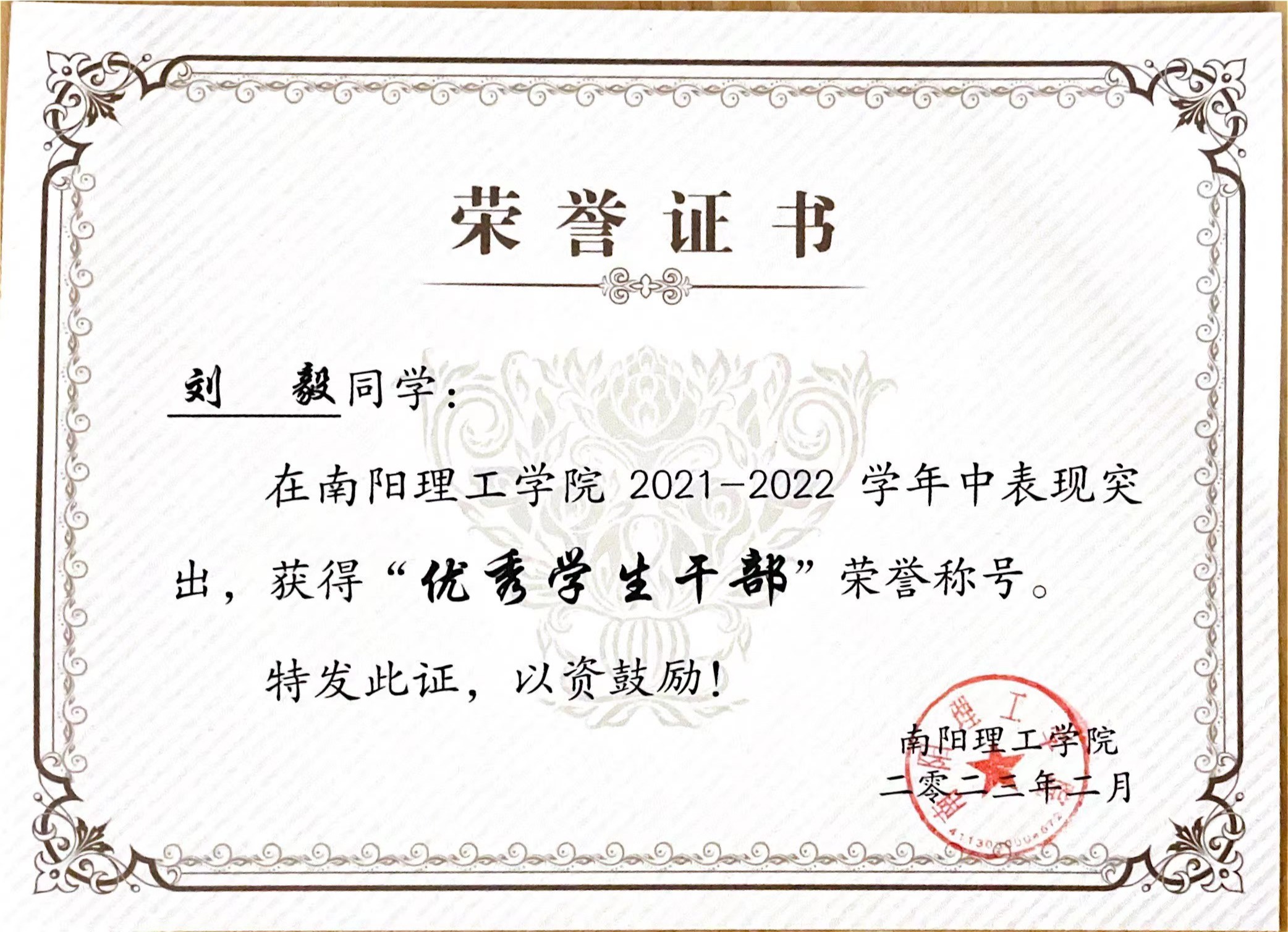 南阳理工学院2021-2022学年“优秀学生干部”获奖证书
