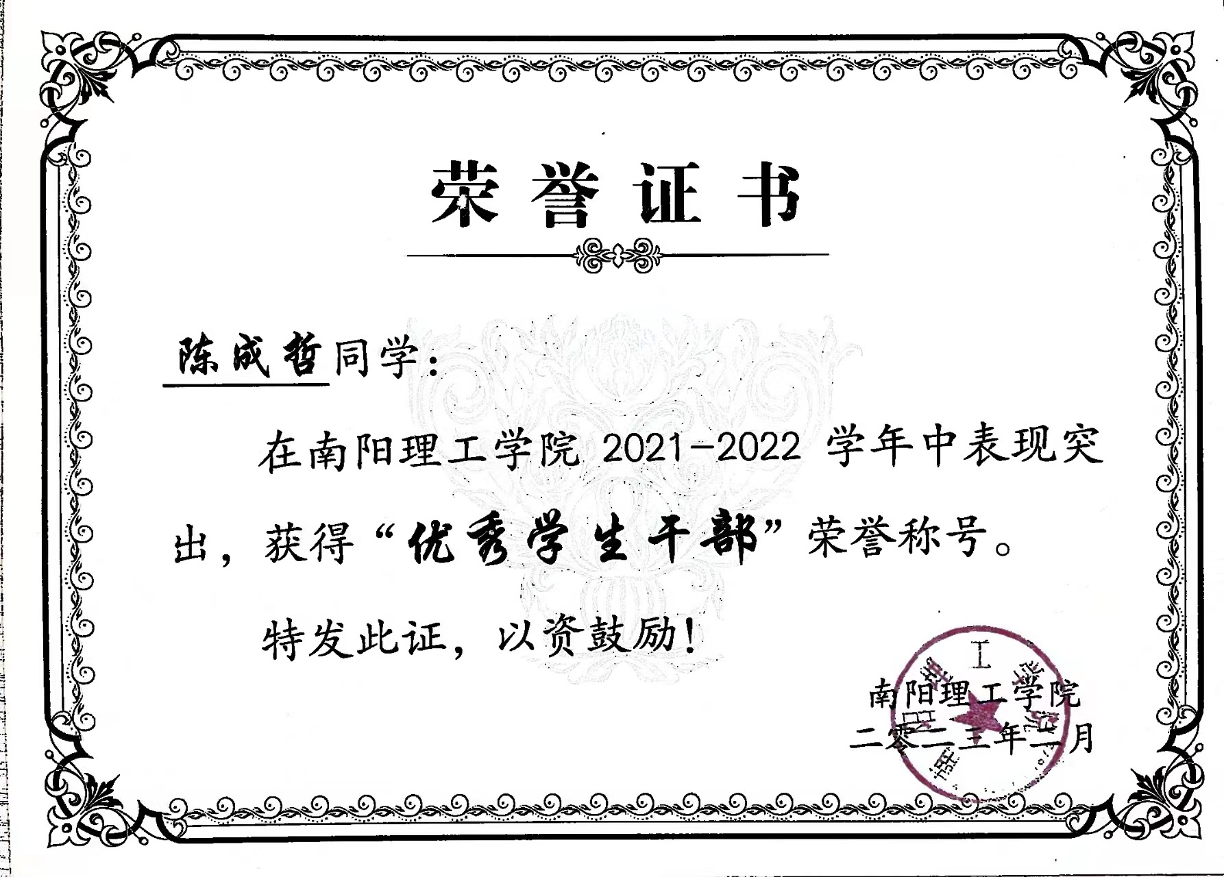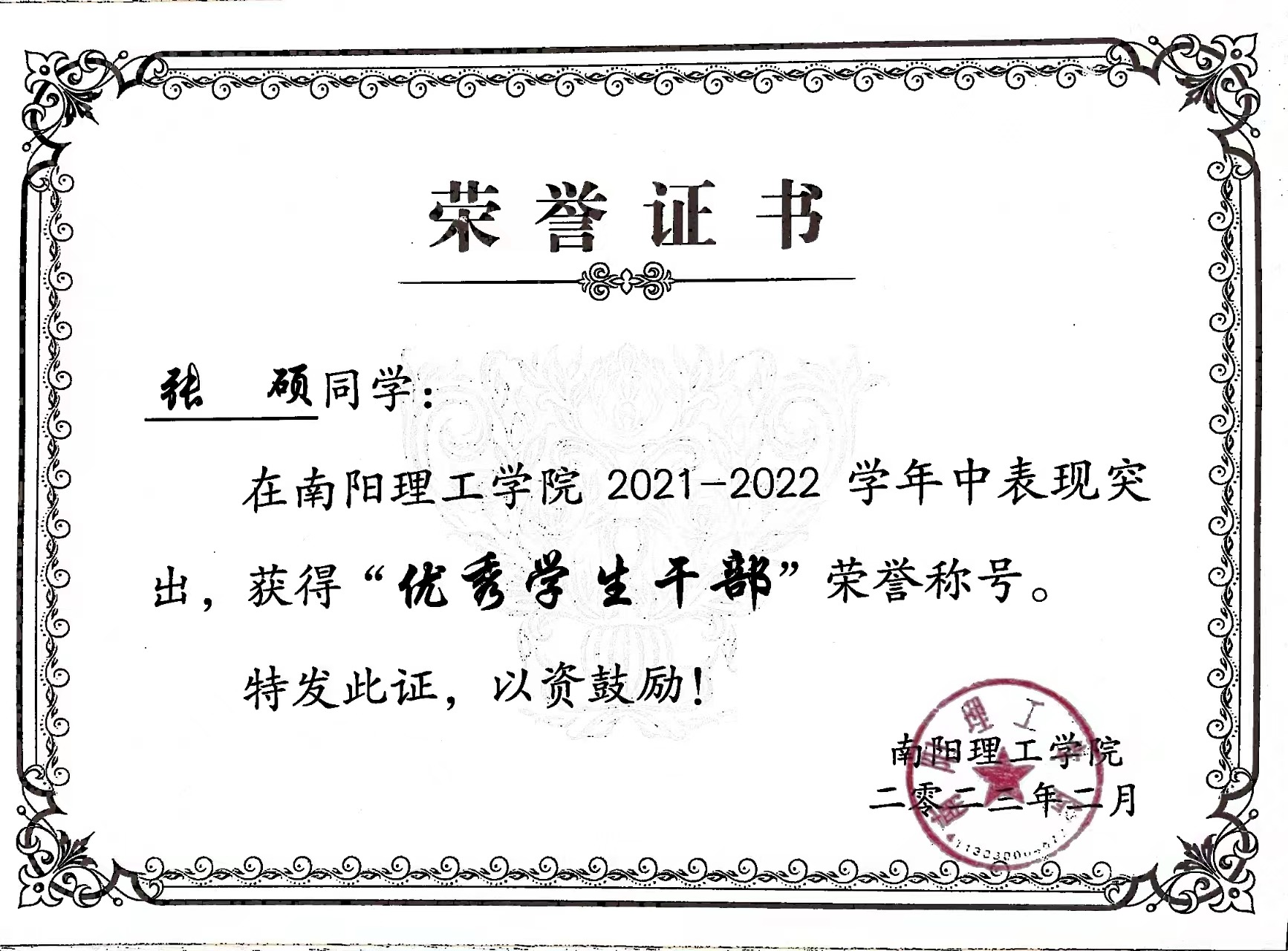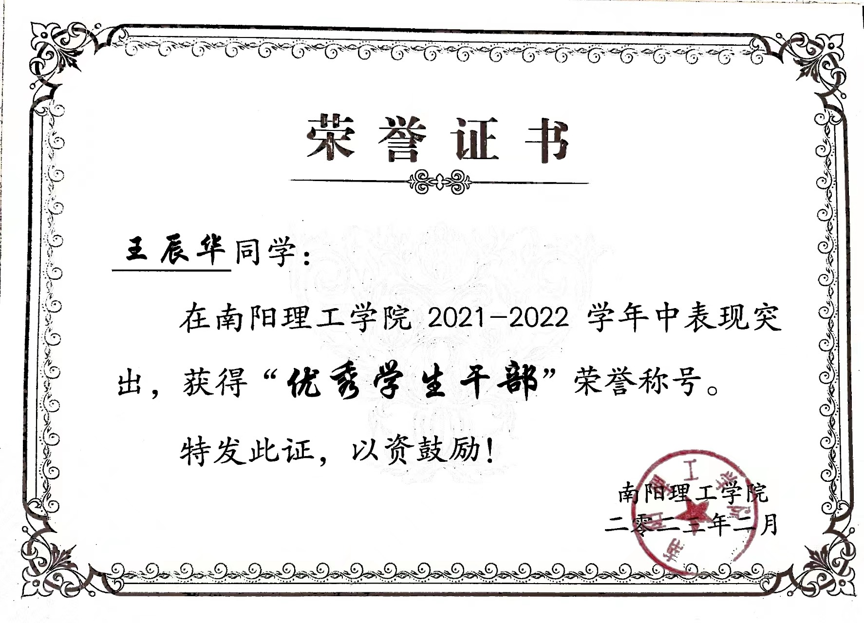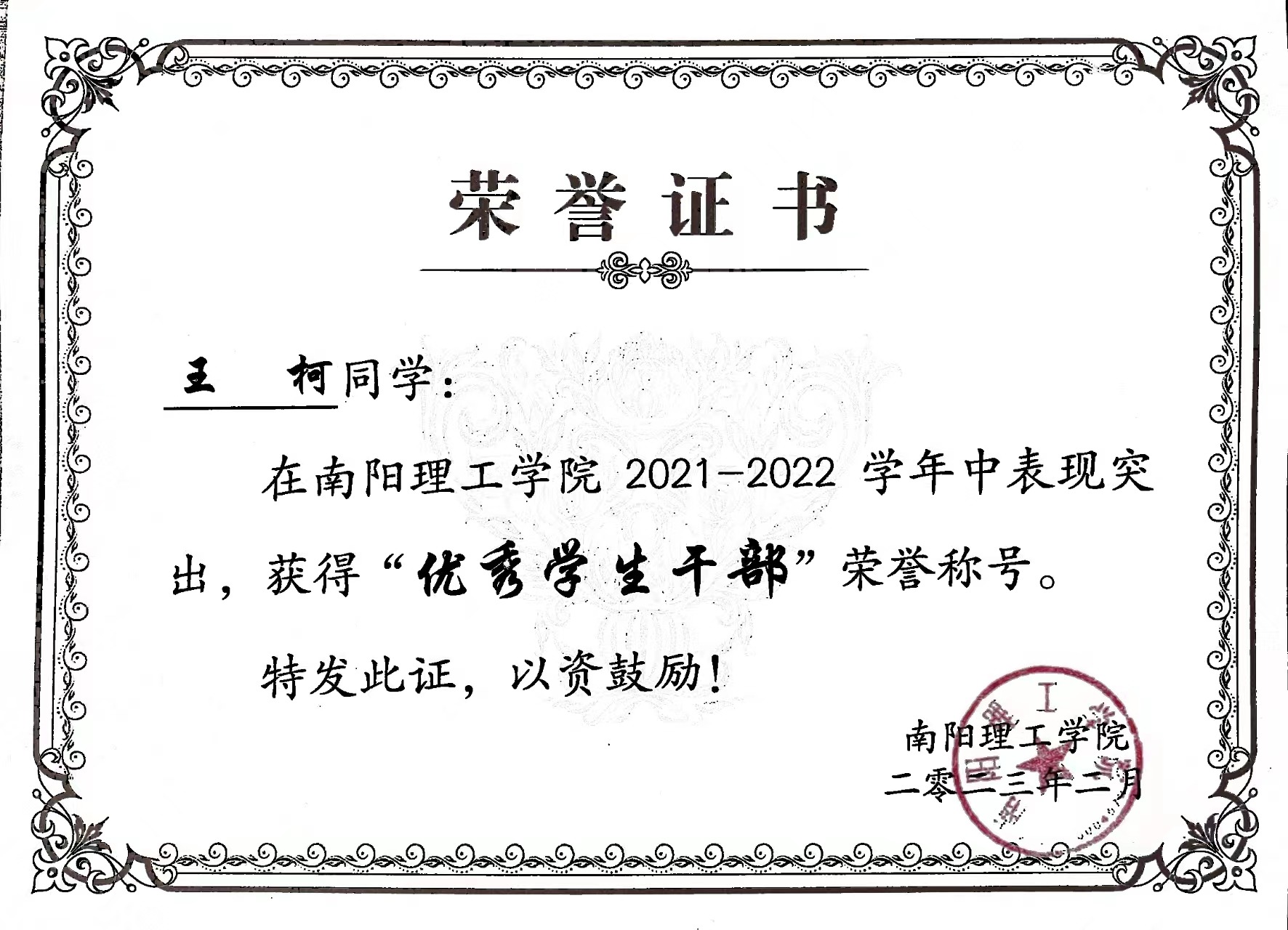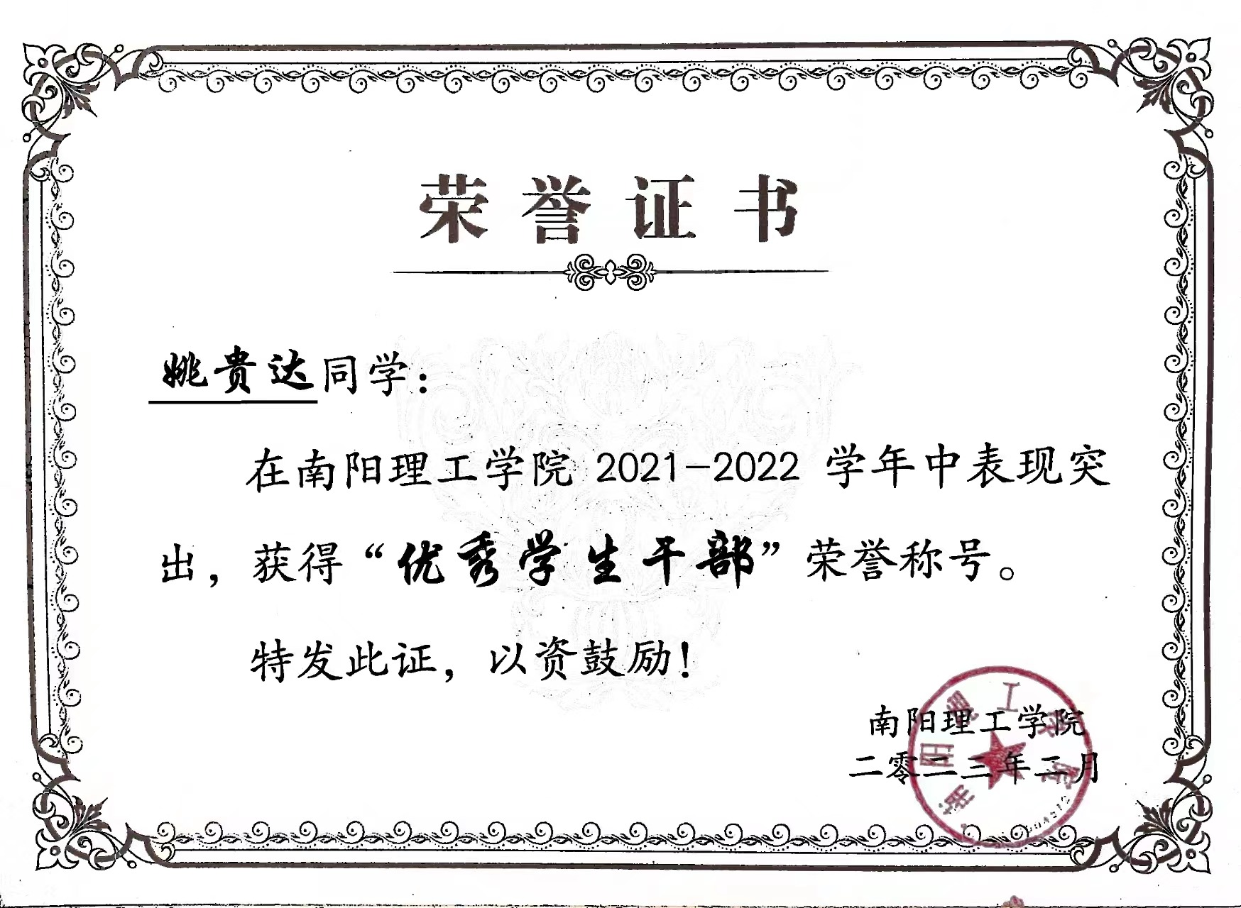 南阳理工学院2021-2022学年“优秀学生干部”获奖证书