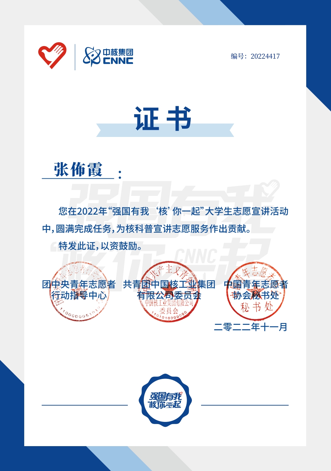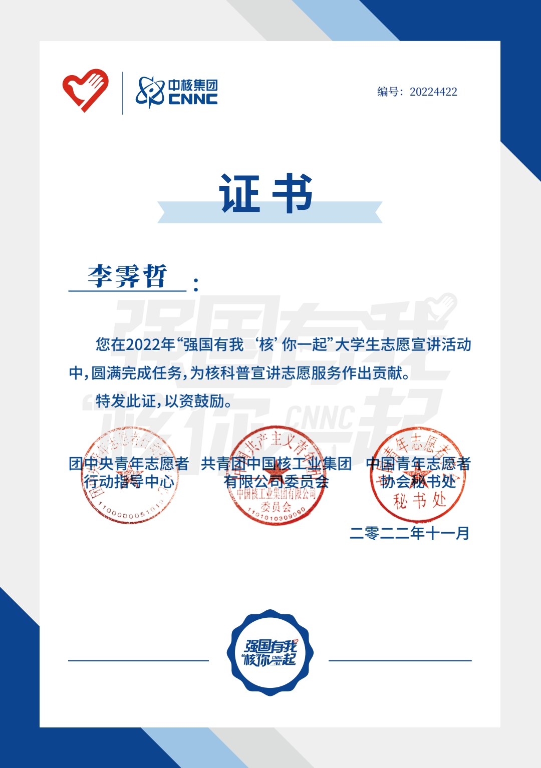 2022年“强国有我,‘核’你一起”大学生志愿宣讲活动证书